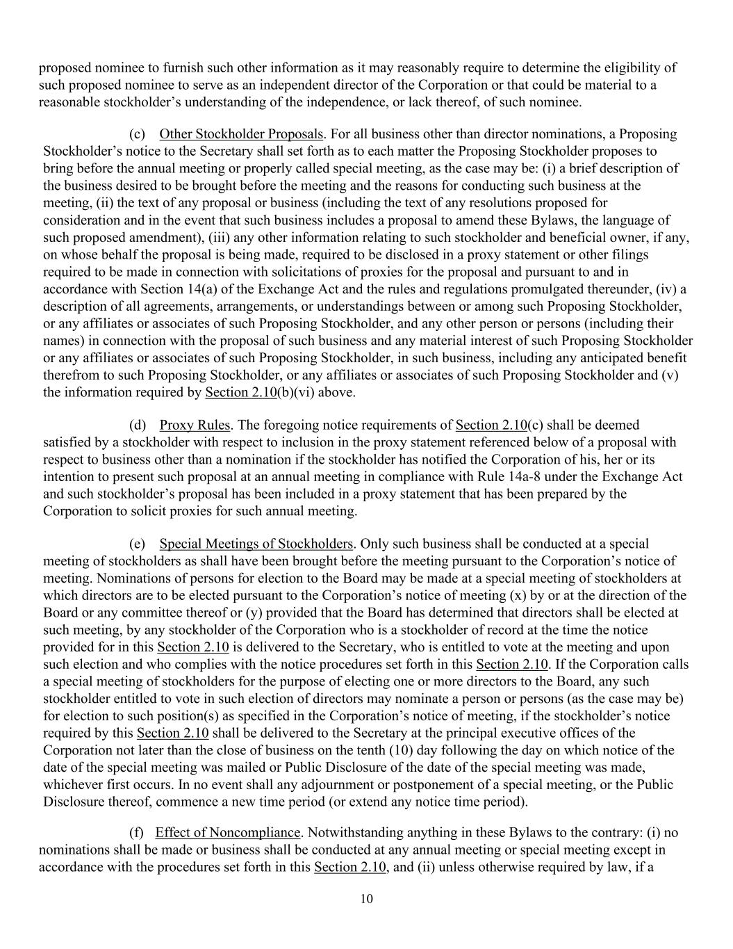 10 proposed nominee to furnish such other information as it may reasonably require to determine the eligibility of such proposed nominee to serve as an independent director of the Corporation or that could be material to a reasonable stockholder’s understanding of the independence, or lack thereof, of such nominee. (c) Other Stockholder Proposals. For all business other than director nominations, a Proposing Stockholder’s notice to the Secretary shall set forth as to each matter the Proposing Stockholder proposes to bring before the annual meeting or properly called special meeting, as the case may be: (i) a brief description of the business desired to be brought before the meeting and the reasons for conducting such business at the meeting, (ii) the text of any proposal or business (including the text of any resolutions proposed for consideration and in the event that such business includes a proposal to amend these Bylaws, the language of such proposed amendment), (iii) any other information relating to such stockholder and beneficial owner, if any, on whose behalf the proposal is being made, required to be disclosed in a proxy statement or other filings required to be made in connection with solicitations of proxies for the proposal and pursuant to and in accordance with Section 14(a) of the Exchange Act and the rules and regulations promulgated thereunder, (iv) a description of all agreements, arrangements, or understandings between or among such Proposing Stockholder, or any affiliates or associates of such Proposing Stockholder, and any other person or persons (including their names) in connection with the proposal of such business and any material interest of such Proposing Stockholder or any affiliates or associates of such Proposing Stockholder, in such business, including any anticipated benefit therefrom to such Proposing Stockholder, or any affiliates or associates of such Proposing Stockholder and (v) the information required by Section 2.10(b)(vi) above. (d) Proxy Rules. The foregoing notice requirements of Section 2.10(c) shall be deemed satisfied by a stockholder with respect to inclusion in the proxy statement referenced below of a proposal with respect to business other than a nomination if the stockholder has notified the Corporation of his, her or its intention to present such proposal at an annual meeting in compliance with Rule 14a-8 under the Exchange Act and such stockholder’s proposal has been included in a proxy statement that has been prepared by the Corporation to solicit proxies for such annual meeting. (e) Special Meetings of Stockholders. Only such business shall be conducted at a special meeting of stockholders as shall have been brought before the meeting pursuant to the Corporation’s notice of meeting. Nominations of persons for election to the Board may be made at a special meeting of stockholders at which directors are to be elected pursuant to the Corporation’s notice of meeting (x) by or at the direction of the Board or any committee thereof or (y) provided that the Board has determined that directors shall be elected at such meeting, by any stockholder of the Corporation who is a stockholder of record at the time the notice provided for in this Section 2.10 is delivered to the Secretary, who is entitled to vote at the meeting and upon such election and who complies with the notice procedures set forth in this Section 2.10. If the Corporation calls a special meeting of stockholders for the purpose of electing one or more directors to the Board, any such stockholder entitled to vote in such election of directors may nominate a person or persons (as the case may be) for election to such position(s) as specified in the Corporation’s notice of meeting, if the stockholder’s notice required by this Section 2.10 shall be delivered to the Secretary at the principal executive offices of the Corporation not later than the close of business on the tenth (10) day following the day on which notice of the date of the special meeting was mailed or Public Disclosure of the date of the special meeting was made, whichever first occurs. In no event shall any adjournment or postponement of a special meeting, or the Public Disclosure thereof, commence a new time period (or extend any notice time period). (f) Effect of Noncompliance. Notwithstanding anything in these Bylaws to the contrary: (i) no nominations shall be made or business shall be conducted at any annual meeting or special meeting except in accordance with the procedures set forth in this Section 2.10, and (ii) unless otherwise required by law, if a
