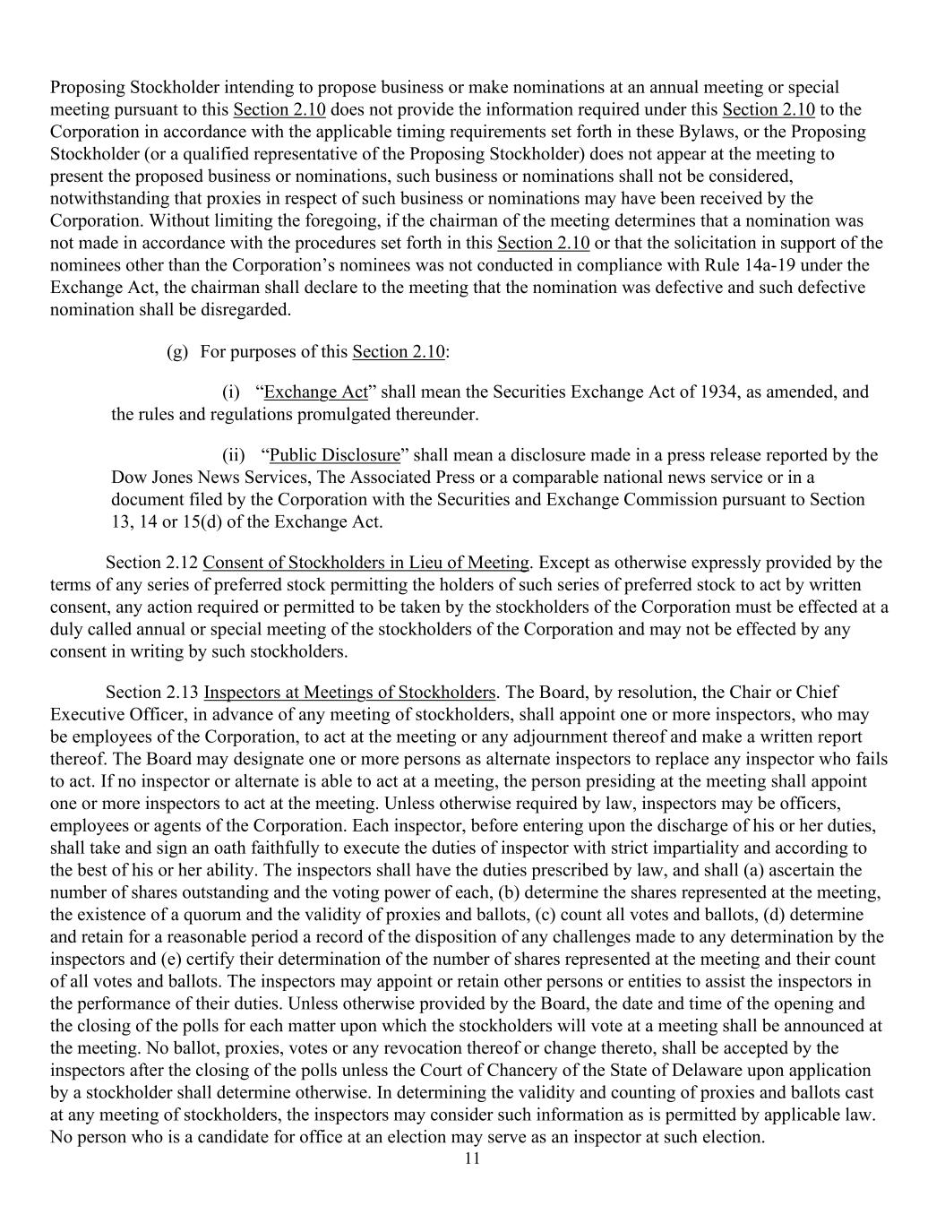 11 Proposing Stockholder intending to propose business or make nominations at an annual meeting or special meeting pursuant to this Section 2.10 does not provide the information required under this Section 2.10 to the Corporation in accordance with the applicable timing requirements set forth in these Bylaws, or the Proposing Stockholder (or a qualified representative of the Proposing Stockholder) does not appear at the meeting to present the proposed business or nominations, such business or nominations shall not be considered, notwithstanding that proxies in respect of such business or nominations may have been received by the Corporation. Without limiting the foregoing, if the chairman of the meeting determines that a nomination was not made in accordance with the procedures set forth in this Section 2.10 or that the solicitation in support of the nominees other than the Corporation’s nominees was not conducted in compliance with Rule 14a-19 under the Exchange Act, the chairman shall declare to the meeting that the nomination was defective and such defective nomination shall be disregarded. (g) For purposes of this Section 2.10: (i) “Exchange Act” shall mean the Securities Exchange Act of 1934, as amended, and the rules and regulations promulgated thereunder. (ii) “Public Disclosure” shall mean a disclosure made in a press release reported by the Dow Jones News Services, The Associated Press or a comparable national news service or in a document filed by the Corporation with the Securities and Exchange Commission pursuant to Section 13, 14 or 15(d) of the Exchange Act. Section 2.12 Consent of Stockholders in Lieu of Meeting. Except as otherwise expressly provided by the terms of any series of preferred stock permitting the holders of such series of preferred stock to act by written consent, any action required or permitted to be taken by the stockholders of the Corporation must be effected at a duly called annual or special meeting of the stockholders of the Corporation and may not be effected by any consent in writing by such stockholders. Section 2.13 Inspectors at Meetings of Stockholders. The Board, by resolution, the Chair or Chief Executive Officer, in advance of any meeting of stockholders, shall appoint one or more inspectors, who may be employees of the Corporation, to act at the meeting or any adjournment thereof and make a written report thereof. The Board may designate one or more persons as alternate inspectors to replace any inspector who fails to act. If no inspector or alternate is able to act at a meeting, the person presiding at the meeting shall appoint one or more inspectors to act at the meeting. Unless otherwise required by law, inspectors may be officers, employees or agents of the Corporation. Each inspector, before entering upon the discharge of his or her duties, shall take and sign an oath faithfully to execute the duties of inspector with strict impartiality and according to the best of his or her ability. The inspectors shall have the duties prescribed by law, and shall (a) ascertain the number of shares outstanding and the voting power of each, (b) determine the shares represented at the meeting, the existence of a quorum and the validity of proxies and ballots, (c) count all votes and ballots, (d) determine and retain for a reasonable period a record of the disposition of any challenges made to any determination by the inspectors and (e) certify their determination of the number of shares represented at the meeting and their count of all votes and ballots. The inspectors may appoint or retain other persons or entities to assist the inspectors in the performance of their duties. Unless otherwise provided by the Board, the date and time of the opening and the closing of the polls for each matter upon which the stockholders will vote at a meeting shall be announced at the meeting. No ballot, proxies, votes or any revocation thereof or change thereto, shall be accepted by the inspectors after the closing of the polls unless the Court of Chancery of the State of Delaware upon application by a stockholder shall determine otherwise. In determining the validity and counting of proxies and ballots cast at any meeting of stockholders, the inspectors may consider such information as is permitted by applicable law. No person who is a candidate for office at an election may serve as an inspector at such election.