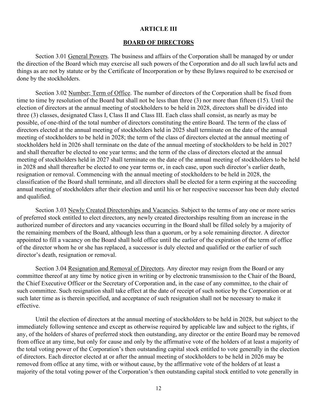 12 ARTICLE III BOARD OF DIRECTORS Section 3.01 General Powers. The business and affairs of the Corporation shall be managed by or under the direction of the Board which may exercise all such powers of the Corporation and do all such lawful acts and things as are not by statute or by the Certificate of Incorporation or by these Bylaws required to be exercised or done by the stockholders. Section 3.02 Number; Term of Office. The number of directors of the Corporation shall be fixed from time to time by resolution of the Board but shall not be less than three (3) nor more than fifteen (15). Until the election of directors at the annual meeting of stockholders to be held in 2028, directors shall be divided into three (3) classes, designated Class I, Class II and Class III. Each class shall consist, as nearly as may be possible, of one-third of the total number of directors constituting the entire Board. The term of the class of directors elected at the annual meeting of stockholders held in 2025 shall terminate on the date of the annual meeting of stockholders to be held in 2028; the term of the class of directors elected at the annual meeting of stockholders held in 2026 shall terminate on the date of the annual meeting of stockholders to be held in 2027 and shall thereafter be elected to one year terms; and the term of the class of directors elected at the annual meeting of stockholders held in 2027 shall terminate on the date of the annual meeting of stockholders to be held in 2028 and shall thereafter be elected to one year terms or, in each case, upon such director’s earlier death, resignation or removal. Commencing with the annual meeting of stockholders to be held in 2028, the classification of the Board shall terminate, and all directors shall be elected for a term expiring at the succeeding annual meeting of stockholders after their election and until his or her respective successor has been duly elected and qualified. Section 3.03 Newly Created Directorships and Vacancies. Subject to the terms of any one or more series of preferred stock entitled to elect directors, any newly created directorships resulting from an increase in the authorized number of directors and any vacancies occurring in the Board shall be filled solely by a majority of the remaining members of the Board, although less than a quorum, or by a sole remaining director. A director appointed to fill a vacancy on the Board shall hold office until the earlier of the expiration of the term of office of the director whom he or she has replaced, a successor is duly elected and qualified or the earlier of such director’s death, resignation or removal. Section 3.04 Resignation and Removal of Directors. Any director may resign from the Board or any committee thereof at any time by notice given in writing or by electronic transmission to the Chair of the Board, the Chief Executive Officer or the Secretary of Corporation and, in the case of any committee, to the chair of such committee. Such resignation shall take effect at the date of receipt of such notice by the Corporation or at such later time as is therein specified, and acceptance of such resignation shall not be necessary to make it effective. Until the election of directors at the annual meeting of stockholders to be held in 2028, but subject to the immediately following sentence and except as otherwise required by applicable law and subject to the rights, if any, of the holders of shares of preferred stock then outstanding, any director or the entire Board may be removed from office at any time, but only for cause and only by the affirmative vote of the holders of at least a majority of the total voting power of the Corporation’s then outstanding capital stock entitled to vote generally in the election of directors. Each director elected at or after the annual meeting of stockholders to be held in 2026 may be removed from office at any time, with or without cause, by the affirmative vote of the holders of at least a majority of the total voting power of the Corporation’s then outstanding capital stock entitled to vote generally in