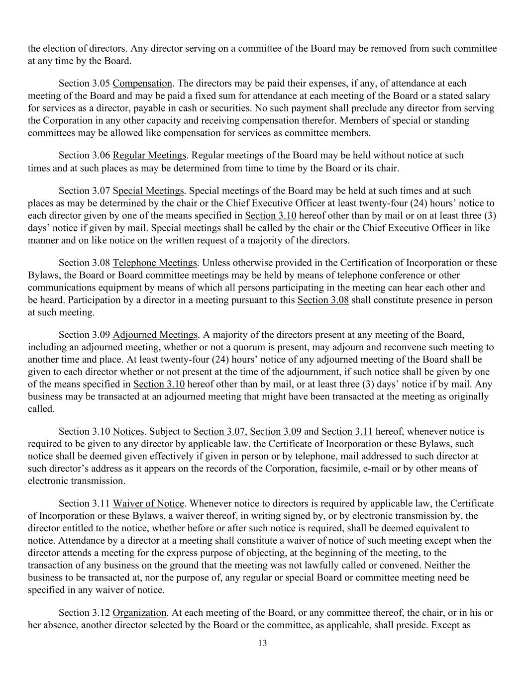13 the election of directors. Any director serving on a committee of the Board may be removed from such committee at any time by the Board. Section 3.05 Compensation. The directors may be paid their expenses, if any, of attendance at each meeting of the Board and may be paid a fixed sum for attendance at each meeting of the Board or a stated salary for services as a director, payable in cash or securities. No such payment shall preclude any director from serving the Corporation in any other capacity and receiving compensation therefor. Members of special or standing committees may be allowed like compensation for services as committee members. Section 3.06 Regular Meetings. Regular meetings of the Board may be held without notice at such times and at such places as may be determined from time to time by the Board or its chair. Section 3.07 Special Meetings. Special meetings of the Board may be held at such times and at such places as may be determined by the chair or the Chief Executive Officer at least twenty-four (24) hours’ notice to each director given by one of the means specified in Section 3.10 hereof other than by mail or on at least three (3) days’ notice if given by mail. Special meetings shall be called by the chair or the Chief Executive Officer in like manner and on like notice on the written request of a majority of the directors. Section 3.08 Telephone Meetings. Unless otherwise provided in the Certification of Incorporation or these Bylaws, the Board or Board committee meetings may be held by means of telephone conference or other communications equipment by means of which all persons participating in the meeting can hear each other and be heard. Participation by a director in a meeting pursuant to this Section 3.08 shall constitute presence in person at such meeting. Section 3.09 Adjourned Meetings. A majority of the directors present at any meeting of the Board, including an adjourned meeting, whether or not a quorum is present, may adjourn and reconvene such meeting to another time and place. At least twenty-four (24) hours’ notice of any adjourned meeting of the Board shall be given to each director whether or not present at the time of the adjournment, if such notice shall be given by one of the means specified in Section 3.10 hereof other than by mail, or at least three (3) days’ notice if by mail. Any business may be transacted at an adjourned meeting that might have been transacted at the meeting as originally called. Section 3.10 Notices. Subject to Section 3.07, Section 3.09 and Section 3.11 hereof, whenever notice is required to be given to any director by applicable law, the Certificate of Incorporation or these Bylaws, such notice shall be deemed given effectively if given in person or by telephone, mail addressed to such director at such director’s address as it appears on the records of the Corporation, facsimile, e-mail or by other means of electronic transmission. Section 3.11 Waiver of Notice. Whenever notice to directors is required by applicable law, the Certificate of Incorporation or these Bylaws, a waiver thereof, in writing signed by, or by electronic transmission by, the director entitled to the notice, whether before or after such notice is required, shall be deemed equivalent to notice. Attendance by a director at a meeting shall constitute a waiver of notice of such meeting except when the director attends a meeting for the express purpose of objecting, at the beginning of the meeting, to the transaction of any business on the ground that the meeting was not lawfully called or convened. Neither the business to be transacted at, nor the purpose of, any regular or special Board or committee meeting need be specified in any waiver of notice. Section 3.12 Organization. At each meeting of the Board, or any committee thereof, the chair, or in his or her absence, another director selected by the Board or the committee, as applicable, shall preside. Except as