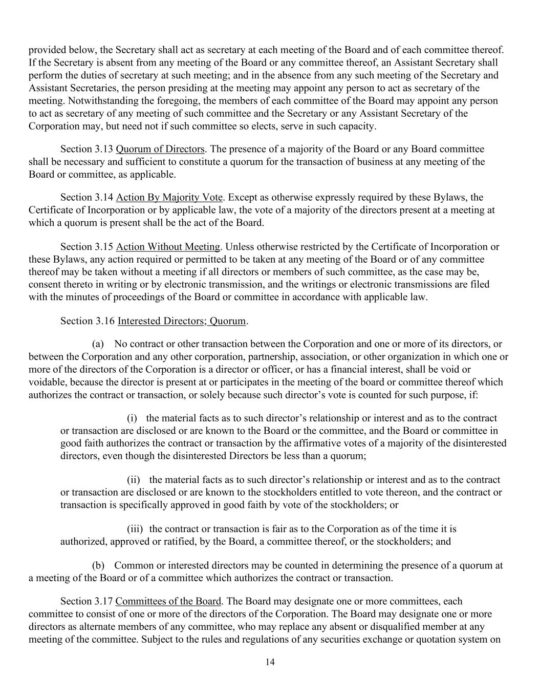 14 provided below, the Secretary shall act as secretary at each meeting of the Board and of each committee thereof. If the Secretary is absent from any meeting of the Board or any committee thereof, an Assistant Secretary shall perform the duties of secretary at such meeting; and in the absence from any such meeting of the Secretary and Assistant Secretaries, the person presiding at the meeting may appoint any person to act as secretary of the meeting. Notwithstanding the foregoing, the members of each committee of the Board may appoint any person to act as secretary of any meeting of such committee and the Secretary or any Assistant Secretary of the Corporation may, but need not if such committee so elects, serve in such capacity. Section 3.13 Quorum of Directors. The presence of a majority of the Board or any Board committee shall be necessary and sufficient to constitute a quorum for the transaction of business at any meeting of the Board or committee, as applicable. Section 3.14 Action By Majority Vote. Except as otherwise expressly required by these Bylaws, the Certificate of Incorporation or by applicable law, the vote of a majority of the directors present at a meeting at which a quorum is present shall be the act of the Board. Section 3.15 Action Without Meeting. Unless otherwise restricted by the Certificate of Incorporation or these Bylaws, any action required or permitted to be taken at any meeting of the Board or of any committee thereof may be taken without a meeting if all directors or members of such committee, as the case may be, consent thereto in writing or by electronic transmission, and the writings or electronic transmissions are filed with the minutes of proceedings of the Board or committee in accordance with applicable law. Section 3.16 Interested Directors; Quorum. (a) No contract or other transaction between the Corporation and one or more of its directors, or between the Corporation and any other corporation, partnership, association, or other organization in which one or more of the directors of the Corporation is a director or officer, or has a financial interest, shall be void or voidable, because the director is present at or participates in the meeting of the board or committee thereof which authorizes the contract or transaction, or solely because such director’s vote is counted for such purpose, if: (i) the material facts as to such director’s relationship or interest and as to the contract or transaction are disclosed or are known to the Board or the committee, and the Board or committee in good faith authorizes the contract or transaction by the affirmative votes of a majority of the disinterested directors, even though the disinterested Directors be less than a quorum; (ii) the material facts as to such director’s relationship or interest and as to the contract or transaction are disclosed or are known to the stockholders entitled to vote thereon, and the contract or transaction is specifically approved in good faith by vote of the stockholders; or (iii) the contract or transaction is fair as to the Corporation as of the time it is authorized, approved or ratified, by the Board, a committee thereof, or the stockholders; and (b) Common or interested directors may be counted in determining the presence of a quorum at a meeting of the Board or of a committee which authorizes the contract or transaction. Section 3.17 Committees of the Board. The Board may designate one or more committees, each committee to consist of one or more of the directors of the Corporation. The Board may designate one or more directors as alternate members of any committee, who may replace any absent or disqualified member at any meeting of the committee. Subject to the rules and regulations of any securities exchange or quotation system on