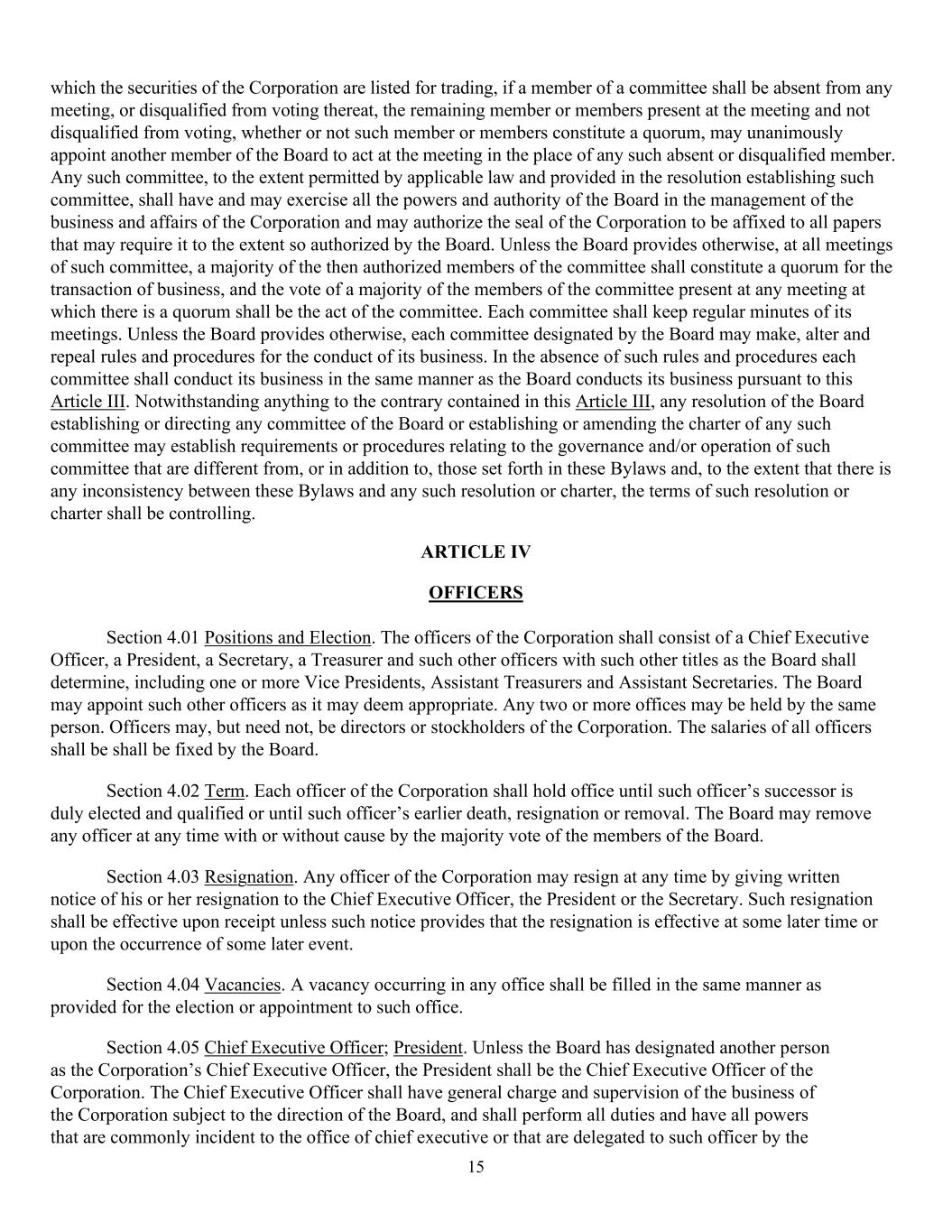 15 which the securities of the Corporation are listed for trading, if a member of a committee shall be absent from any meeting, or disqualified from voting thereat, the remaining member or members present at the meeting and not disqualified from voting, whether or not such member or members constitute a quorum, may unanimously appoint another member of the Board to act at the meeting in the place of any such absent or disqualified member. Any such committee, to the extent permitted by applicable law and provided in the resolution establishing such committee, shall have and may exercise all the powers and authority of the Board in the management of the business and affairs of the Corporation and may authorize the seal of the Corporation to be affixed to all papers that may require it to the extent so authorized by the Board. Unless the Board provides otherwise, at all meetings of such committee, a majority of the then authorized members of the committee shall constitute a quorum for the transaction of business, and the vote of a majority of the members of the committee present at any meeting at which there is a quorum shall be the act of the committee. Each committee shall keep regular minutes of its meetings. Unless the Board provides otherwise, each committee designated by the Board may make, alter and repeal rules and procedures for the conduct of its business. In the absence of such rules and procedures each committee shall conduct its business in the same manner as the Board conducts its business pursuant to this Article III. Notwithstanding anything to the contrary contained in this Article III, any resolution of the Board establishing or directing any committee of the Board or establishing or amending the charter of any such committee may establish requirements or procedures relating to the governance and/or operation of such committee that are different from, or in addition to, those set forth in these Bylaws and, to the extent that there is any inconsistency between these Bylaws and any such resolution or charter, the terms of such resolution or charter shall be controlling. ARTICLE IV OFFICERS Section 4.01 Positions and Election. The officers of the Corporation shall consist of a Chief Executive Officer, a President, a Secretary, a Treasurer and such other officers with such other titles as the Board shall determine, including one or more Vice Presidents, Assistant Treasurers and Assistant Secretaries. The Board may appoint such other officers as it may deem appropriate. Any two or more offices may be held by the same person. Officers may, but need not, be directors or stockholders of the Corporation. The salaries of all officers shall be shall be fixed by the Board. Section 4.02 Term. Each officer of the Corporation shall hold office until such officer’s successor is duly elected and qualified or until such officer’s earlier death, resignation or removal. The Board may remove any officer at any time with or without cause by the majority vote of the members of the Board. Section 4.03 Resignation. Any officer of the Corporation may resign at any time by giving written notice of his or her resignation to the Chief Executive Officer, the President or the Secretary. Such resignation shall be effective upon receipt unless such notice provides that the resignation is effective at some later time or upon the occurrence of some later event. Section 4.04 Vacancies. A vacancy occurring in any office shall be filled in the same manner as provided for the election or appointment to such office. Section 4.05 Chief Executive Officer; President. Unless the Board has designated another person as the Corporation’s Chief Executive Officer, the President shall be the Chief Executive Officer of the Corporation. The Chief Executive Officer shall have general charge and supervision of the business of the Corporation subject to the direction of the Board, and shall perform all duties and have all powers that are commonly incident to the office of chief executive or that are delegated to such officer by the