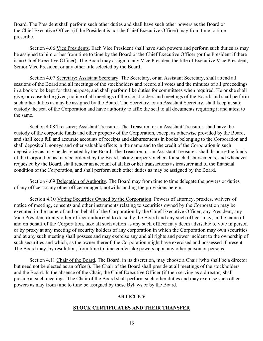 16 Board. The President shall perform such other duties and shall have such other powers as the Board or the Chief Executive Officer (if the President is not the Chief Executive Officer) may from time to time prescribe. Section 4.06 Vice Presidents. Each Vice President shall have such powers and perform such duties as may be assigned to him or her from time to time by the Board or the Chief Executive Officer (or the President if there is no Chief Executive Officer). The Board may assign to any Vice President the title of Executive Vice President, Senior Vice President or any other title selected by the Board. Section 4.07 Secretary; Assistant Secretary. The Secretary, or an Assistant Secretary, shall attend all sessions of the Board and all meetings of the stockholders and record all votes and the minutes of all proceedings in a book to be kept for that purpose, and shall perform like duties for committees when required. He or she shall give, or cause to be given, notice of all meetings of the stockholders and meetings of the Board, and shall perform such other duties as may be assigned by the Board. The Secretary, or an Assistant Secretary, shall keep in safe custody the seal of the Corporation and have authority to affix the seal to all documents requiring it and attest to the same. Section 4.08 Treasurer; Assistant Treasurer. The Treasurer, or an Assistant Treasurer, shall have the custody of the corporate funds and other property of the Corporation, except as otherwise provided by the Board, and shall keep full and accurate accounts of receipts and disbursements in books belonging to the Corporation and shall deposit all moneys and other valuable effects in the name and to the credit of the Corporation in such depositories as may be designated by the Board. The Treasurer, or an Assistant Treasurer, shall disburse the funds of the Corporation as may be ordered by the Board, taking proper vouchers for such disbursements, and whenever requested by the Board, shall render an account of all his or her transactions as treasurer and of the financial condition of the Corporation, and shall perform such other duties as may be assigned by the Board. Section 4.09 Delegation of Authority. The Board may from time to time delegate the powers or duties of any officer to any other officer or agent, notwithstanding the provisions herein. Section 4.10 Voting Securities Owned by the Corporation. Powers of attorney, proxies, waivers of notice of meeting, consents and other instruments relating to securities owned by the Corporation may be executed in the name of and on behalf of the Corporation by the Chief Executive Officer, any President, any Vice President or any other officer authorized to do so by the Board and any such officer may, in the name of and on behalf of the Corporation, take all such action as any such officer may deem advisable to vote in person or by proxy at any meeting of security holders of any corporation in which the Corporation may own securities and at any such meeting shall possess and may exercise any and all rights and power incident to the ownership of such securities and which, as the owner thereof, the Corporation might have exercised and possessed if present. The Board may, by resolution, from time to time confer like powers upon any other person or persons. Section 4.11 Chair of the Board. The Board, in its discretion, may choose a Chair (who shall be a director but need not be elected as an officer). The Chair of the Board shall preside at all meetings of the stockholders and the Board. In the absence of the Chair, the Chief Executive Officer (if then serving as a director) shall preside at such meetings. The Chair of the Board shall perform such other duties and may exercise such other powers as may from time to time be assigned by these Bylaws or by the Board. ARTICLE V STOCK CERTIFICATES AND THEIR TRANSFER