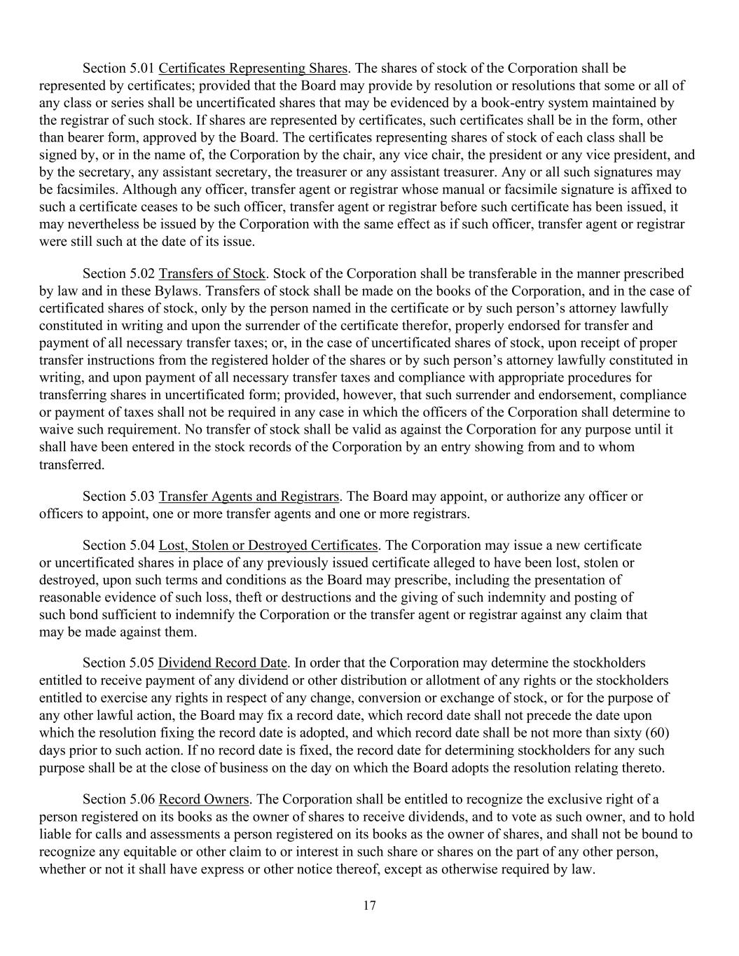17 Section 5.01 Certificates Representing Shares. The shares of stock of the Corporation shall be represented by certificates; provided that the Board may provide by resolution or resolutions that some or all of any class or series shall be uncertificated shares that may be evidenced by a book-entry system maintained by the registrar of such stock. If shares are represented by certificates, such certificates shall be in the form, other than bearer form, approved by the Board. The certificates representing shares of stock of each class shall be signed by, or in the name of, the Corporation by the chair, any vice chair, the president or any vice president, and by the secretary, any assistant secretary, the treasurer or any assistant treasurer. Any or all such signatures may be facsimiles. Although any officer, transfer agent or registrar whose manual or facsimile signature is affixed to such a certificate ceases to be such officer, transfer agent or registrar before such certificate has been issued, it may nevertheless be issued by the Corporation with the same effect as if such officer, transfer agent or registrar were still such at the date of its issue. Section 5.02 Transfers of Stock. Stock of the Corporation shall be transferable in the manner prescribed by law and in these Bylaws. Transfers of stock shall be made on the books of the Corporation, and in the case of certificated shares of stock, only by the person named in the certificate or by such person’s attorney lawfully constituted in writing and upon the surrender of the certificate therefor, properly endorsed for transfer and payment of all necessary transfer taxes; or, in the case of uncertificated shares of stock, upon receipt of proper transfer instructions from the registered holder of the shares or by such person’s attorney lawfully constituted in writing, and upon payment of all necessary transfer taxes and compliance with appropriate procedures for transferring shares in uncertificated form; provided, however, that such surrender and endorsement, compliance or payment of taxes shall not be required in any case in which the officers of the Corporation shall determine to waive such requirement. No transfer of stock shall be valid as against the Corporation for any purpose until it shall have been entered in the stock records of the Corporation by an entry showing from and to whom transferred. Section 5.03 Transfer Agents and Registrars. The Board may appoint, or authorize any officer or officers to appoint, one or more transfer agents and one or more registrars. Section 5.04 Lost, Stolen or Destroyed Certificates. The Corporation may issue a new certificate or uncertificated shares in place of any previously issued certificate alleged to have been lost, stolen or destroyed, upon such terms and conditions as the Board may prescribe, including the presentation of reasonable evidence of such loss, theft or destructions and the giving of such indemnity and posting of such bond sufficient to indemnify the Corporation or the transfer agent or registrar against any claim that may be made against them. Section 5.05 Dividend Record Date. In order that the Corporation may determine the stockholders entitled to receive payment of any dividend or other distribution or allotment of any rights or the stockholders entitled to exercise any rights in respect of any change, conversion or exchange of stock, or for the purpose of any other lawful action, the Board may fix a record date, which record date shall not precede the date upon which the resolution fixing the record date is adopted, and which record date shall be not more than sixty (60) days prior to such action. If no record date is fixed, the record date for determining stockholders for any such purpose shall be at the close of business on the day on which the Board adopts the resolution relating thereto. Section 5.06 Record Owners. The Corporation shall be entitled to recognize the exclusive right of a person registered on its books as the owner of shares to receive dividends, and to vote as such owner, and to hold liable for calls and assessments a person registered on its books as the owner of shares, and shall not be bound to recognize any equitable or other claim to or interest in such share or shares on the part of any other person, whether or not it shall have express or other notice thereof, except as otherwise required by law.