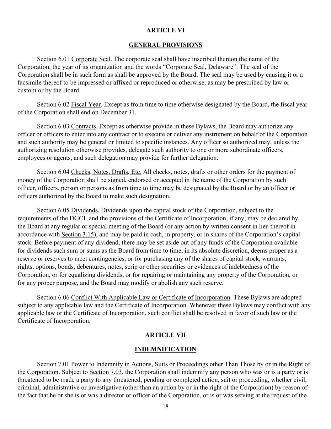 18 ARTICLE VI GENERAL PROVISIONS Section 6.01 Corporate Seal. The corporate seal shall have inscribed thereon the name of the Corporation, the year of its organization and the words “Corporate Seal, Delaware”. The seal of the Corporation shall be in such form as shall be approved by the Board. The seal may be used by causing it or a facsimile thereof to be impressed or affixed or reproduced or otherwise, as may be prescribed by law or custom or by the Board. Section 6.02 Fiscal Year. Except as from time to time otherwise designated by the Board, the fiscal year of the Corporation shall end on December 31. Section 6.03 Contracts. Except as otherwise provide in these Bylaws, the Board may authorize any officer or officers to enter into any contract or to execute or deliver any instrument on behalf of the Corporation and such authority may be general or limited to specific instances. Any officer so authorized may, unless the authorizing resolution otherwise provides, delegate such authority to one or more subordinate officers, employees or agents, and such delegation may provide for further delegation. Section 6.04 Checks, Notes, Drafts, Etc. All checks, notes, drafts or other orders for the payment of money of the Corporation shall be signed, endorsed or accepted in the name of the Corporation by such officer, officers, person or persons as from time to time may be designated by the Board or by an officer or officers authorized by the Board to make such designation. Section 6.05 Dividends. Dividends upon the capital stock of the Corporation, subject to the requirements of the DGCL and the provisions of the Certificate of Incorporation, if any, may be declared by the Board at any regular or special meeting of the Board (or any action by written consent in lieu thereof in accordance with Section 3.15), and may be paid in cash, in property, or in shares of the Corporation’s capital stock. Before payment of any dividend, there may be set aside out of any funds of the Corporation available for dividends such sum or sums as the Board from time to time, in its absolute discretion, deems proper as a reserve or reserves to meet contingencies, or for purchasing any of the shares of capital stock, warrants, rights, options, bonds, debentures, notes, scrip or other securities or evidences of indebtedness of the Corporation, or for equalizing dividends, or for repairing or maintaining any property of the Corporation, or for any proper purpose, and the Board may modify or abolish any such reserve. Section 6.06 Conflict With Applicable Law or Certificate of Incorporation. These Bylaws are adopted subject to any applicable law and the Certificate of Incorporation. Whenever these Bylaws may conflict with any applicable law or the Certificate of Incorporation, such conflict shall be resolved in favor of such law or the Certificate of Incorporation. ARTICLE VII INDEMNIFICATION Section 7.01 Power to Indemnify in Actions, Suits or Proceedings other Than Those by or in the Right of the Corporation. Subject to Section 7.03, the Corporation shall indemnify any person who was or is a party or is threatened to be made a party to any threatened, pending or completed action, suit or proceeding, whether civil, criminal, administrative or investigative (other than an action by or in the right of the Corporation) by reason of the fact that he or she is or was a director or officer of the Corporation, or is or was serving at the request of the