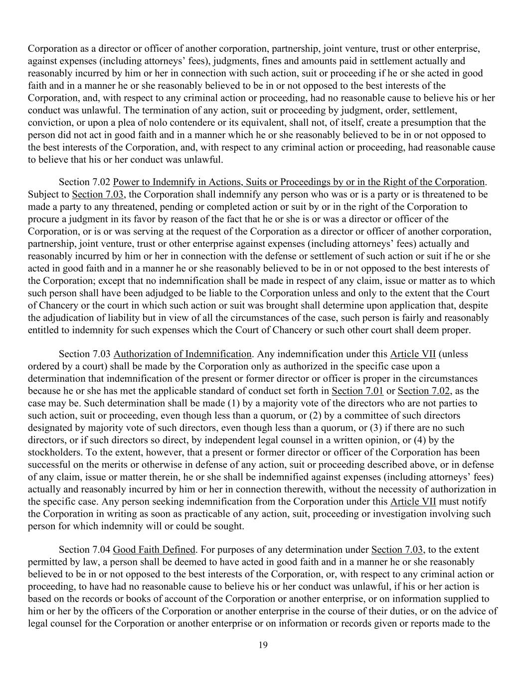 19 Corporation as a director or officer of another corporation, partnership, joint venture, trust or other enterprise, against expenses (including attorneys’ fees), judgments, fines and amounts paid in settlement actually and reasonably incurred by him or her in connection with such action, suit or proceeding if he or she acted in good faith and in a manner he or she reasonably believed to be in or not opposed to the best interests of the Corporation, and, with respect to any criminal action or proceeding, had no reasonable cause to believe his or her conduct was unlawful. The termination of any action, suit or proceeding by judgment, order, settlement, conviction, or upon a plea of nolo contendere or its equivalent, shall not, of itself, create a presumption that the person did not act in good faith and in a manner which he or she reasonably believed to be in or not opposed to the best interests of the Corporation, and, with respect to any criminal action or proceeding, had reasonable cause to believe that his or her conduct was unlawful. Section 7.02 Power to Indemnify in Actions, Suits or Proceedings by or in the Right of the Corporation. Subject to Section 7.03, the Corporation shall indemnify any person who was or is a party or is threatened to be made a party to any threatened, pending or completed action or suit by or in the right of the Corporation to procure a judgment in its favor by reason of the fact that he or she is or was a director or officer of the Corporation, or is or was serving at the request of the Corporation as a director or officer of another corporation, partnership, joint venture, trust or other enterprise against expenses (including attorneys’ fees) actually and reasonably incurred by him or her in connection with the defense or settlement of such action or suit if he or she acted in good faith and in a manner he or she reasonably believed to be in or not opposed to the best interests of the Corporation; except that no indemnification shall be made in respect of any claim, issue or matter as to which such person shall have been adjudged to be liable to the Corporation unless and only to the extent that the Court of Chancery or the court in which such action or suit was brought shall determine upon application that, despite the adjudication of liability but in view of all the circumstances of the case, such person is fairly and reasonably entitled to indemnity for such expenses which the Court of Chancery or such other court shall deem proper. Section 7.03 Authorization of Indemnification. Any indemnification under this Article VII (unless ordered by a court) shall be made by the Corporation only as authorized in the specific case upon a determination that indemnification of the present or former director or officer is proper in the circumstances because he or she has met the applicable standard of conduct set forth in Section 7.01 or Section 7.02, as the case may be. Such determination shall be made (1) by a majority vote of the directors who are not parties to such action, suit or proceeding, even though less than a quorum, or (2) by a committee of such directors designated by majority vote of such directors, even though less than a quorum, or (3) if there are no such directors, or if such directors so direct, by independent legal counsel in a written opinion, or (4) by the stockholders. To the extent, however, that a present or former director or officer of the Corporation has been successful on the merits or otherwise in defense of any action, suit or proceeding described above, or in defense of any claim, issue or matter therein, he or she shall be indemnified against expenses (including attorneys’ fees) actually and reasonably incurred by him or her in connection therewith, without the necessity of authorization in the specific case. Any person seeking indemnification from the Corporation under this Article VII must notify the Corporation in writing as soon as practicable of any action, suit, proceeding or investigation involving such person for which indemnity will or could be sought. Section 7.04 Good Faith Defined. For purposes of any determination under Section 7.03, to the extent permitted by law, a person shall be deemed to have acted in good faith and in a manner he or she reasonably believed to be in or not opposed to the best interests of the Corporation, or, with respect to any criminal action or proceeding, to have had no reasonable cause to believe his or her conduct was unlawful, if his or her action is based on the records or books of account of the Corporation or another enterprise, or on information supplied to him or her by the officers of the Corporation or another enterprise in the course of their duties, or on the advice of legal counsel for the Corporation or another enterprise or on information or records given or reports made to the