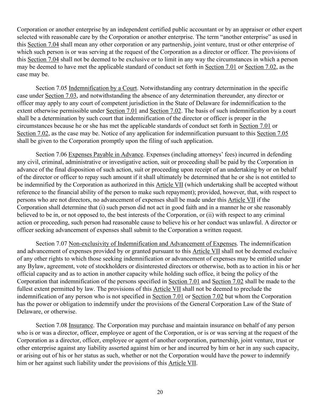 20 Corporation or another enterprise by an independent certified public accountant or by an appraiser or other expert selected with reasonable care by the Corporation or another enterprise. The term “another enterprise” as used in this Section 7.04 shall mean any other corporation or any partnership, joint venture, trust or other enterprise of which such person is or was serving at the request of the Corporation as a director or officer. The provisions of this Section 7.04 shall not be deemed to be exclusive or to limit in any way the circumstances in which a person may be deemed to have met the applicable standard of conduct set forth in Section 7.01 or Section 7.02, as the case may be. Section 7.05 Indemnification by a Court. Notwithstanding any contrary determination in the specific case under Section 7.03, and notwithstanding the absence of any determination thereunder, any director or officer may apply to any court of competent jurisdiction in the State of Delaware for indemnification to the extent otherwise permissible under Section 7.01 and Section 7.02. The basis of such indemnification by a court shall be a determination by such court that indemnification of the director or officer is proper in the circumstances because he or she has met the applicable standards of conduct set forth in Section 7.01 or Section 7.02, as the case may be. Notice of any application for indemnification pursuant to this Section 7.05 shall be given to the Corporation promptly upon the filing of such application. Section 7.06 Expenses Payable in Advance. Expenses (including attorneys’ fees) incurred in defending any civil, criminal, administrative or investigative action, suit or proceeding shall be paid by the Corporation in advance of the final disposition of such action, suit or proceeding upon receipt of an undertaking by or on behalf of the director or officer to repay such amount if it shall ultimately be determined that he or she is not entitled to be indemnified by the Corporation as authorized in this Article VII (which undertaking shall be accepted without reference to the financial ability of the person to make such repayment); provided, however, that, with respect to persons who are not directors, no advancement of expenses shall be made under this Article VII if the Corporation shall determine that (i) such person did not act in good faith and in a manner he or she reasonably believed to be in, or not opposed to, the best interests of the Corporation, or (ii) with respect to any criminal action or proceeding, such person had reasonable cause to believe his or her conduct was unlawful. A director or officer seeking advancement of expenses shall submit to the Corporation a written request. Section 7.07 Non-exclusivity of Indemnification and Advancement of Expenses. The indemnification and advancement of expenses provided by or granted pursuant to this Article VII shall not be deemed exclusive of any other rights to which those seeking indemnification or advancement of expenses may be entitled under any Bylaw, agreement, vote of stockholders or disinterested directors or otherwise, both as to action in his or her official capacity and as to action in another capacity while holding such office, it being the policy of the Corporation that indemnification of the persons specified in Section 7.01 and Section 7.02 shall be made to the fullest extent permitted by law. The provisions of this Article VII shall not be deemed to preclude the indemnification of any person who is not specified in Section 7.01 or Section 7.02 but whom the Corporation has the power or obligation to indemnify under the provisions of the General Corporation Law of the State of Delaware, or otherwise. Section 7.08 Insurance. The Corporation may purchase and maintain insurance on behalf of any person who is or was a director, officer, employee or agent of the Corporation, or is or was serving at the request of the Corporation as a director, officer, employee or agent of another corporation, partnership, joint venture, trust or other enterprise against any liability asserted against him or her and incurred by him or her in any such capacity, or arising out of his or her status as such, whether or not the Corporation would have the power to indemnify him or her against such liability under the provisions of this Article VII.