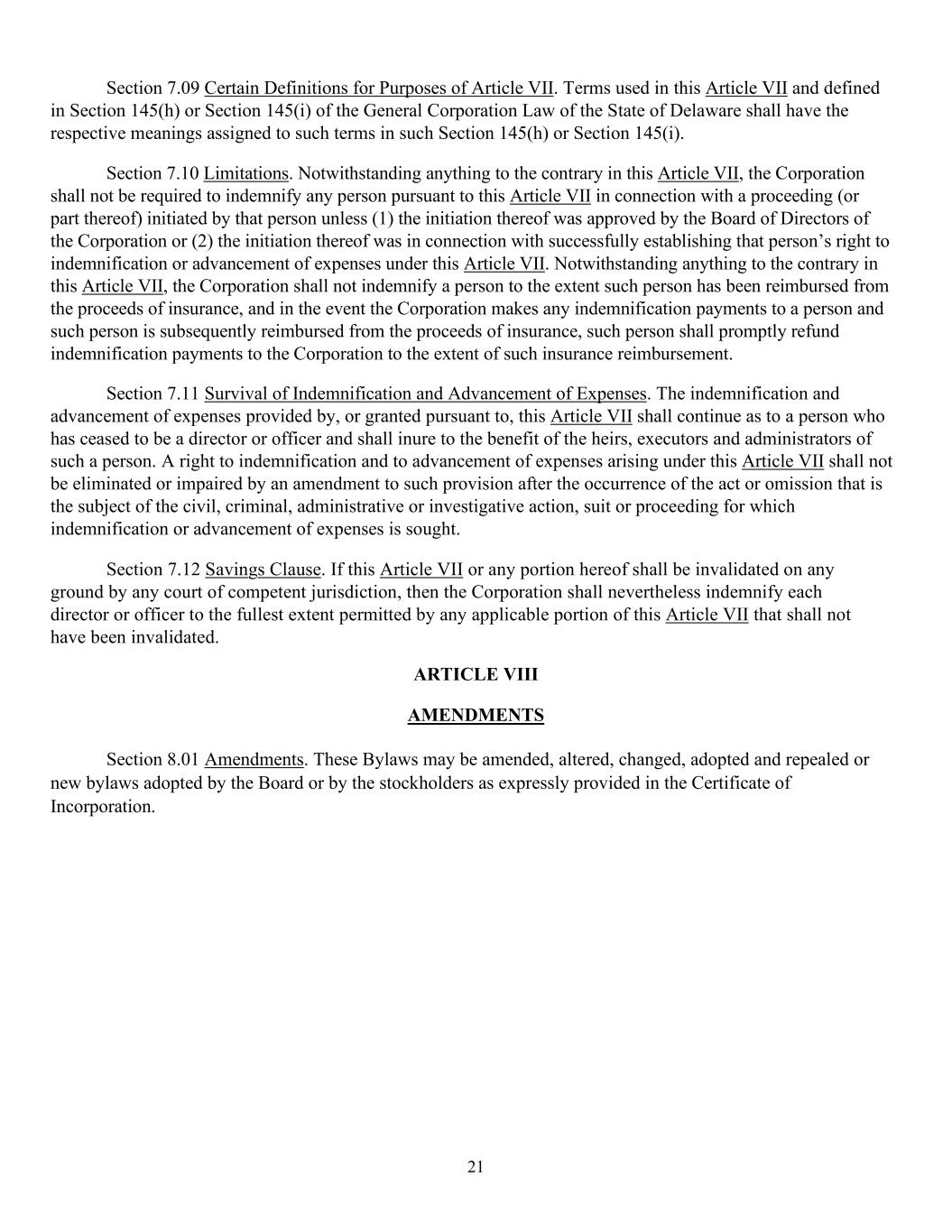 21 Section 7.09 Certain Definitions for Purposes of Article VII. Terms used in this Article VII and defined in Section 145(h) or Section 145(i) of the General Corporation Law of the State of Delaware shall have the respective meanings assigned to such terms in such Section 145(h) or Section 145(i). Section 7.10 Limitations. Notwithstanding anything to the contrary in this Article VII, the Corporation shall not be required to indemnify any person pursuant to this Article VII in connection with a proceeding (or part thereof) initiated by that person unless (1) the initiation thereof was approved by the Board of Directors of the Corporation or (2) the initiation thereof was in connection with successfully establishing that person’s right to indemnification or advancement of expenses under this Article VII. Notwithstanding anything to the contrary in this Article VII, the Corporation shall not indemnify a person to the extent such person has been reimbursed from the proceeds of insurance, and in the event the Corporation makes any indemnification payments to a person and such person is subsequently reimbursed from the proceeds of insurance, such person shall promptly refund indemnification payments to the Corporation to the extent of such insurance reimbursement. Section 7.11 Survival of Indemnification and Advancement of Expenses. The indemnification and advancement of expenses provided by, or granted pursuant to, this Article VII shall continue as to a person who has ceased to be a director or officer and shall inure to the benefit of the heirs, executors and administrators of such a person. A right to indemnification and to advancement of expenses arising under this Article VII shall not be eliminated or impaired by an amendment to such provision after the occurrence of the act or omission that is the subject of the civil, criminal, administrative or investigative action, suit or proceeding for which indemnification or advancement of expenses is sought. Section 7.12 Savings Clause. If this Article VII or any portion hereof shall be invalidated on any ground by any court of competent jurisdiction, then the Corporation shall nevertheless indemnify each director or officer to the fullest extent permitted by any applicable portion of this Article VII that shall not have been invalidated. ARTICLE VIII AMENDMENTS Section 8.01 Amendments. These Bylaws may be amended, altered, changed, adopted and repealed or new bylaws adopted by the Board or by the stockholders as expressly provided in the Certificate of Incorporation.