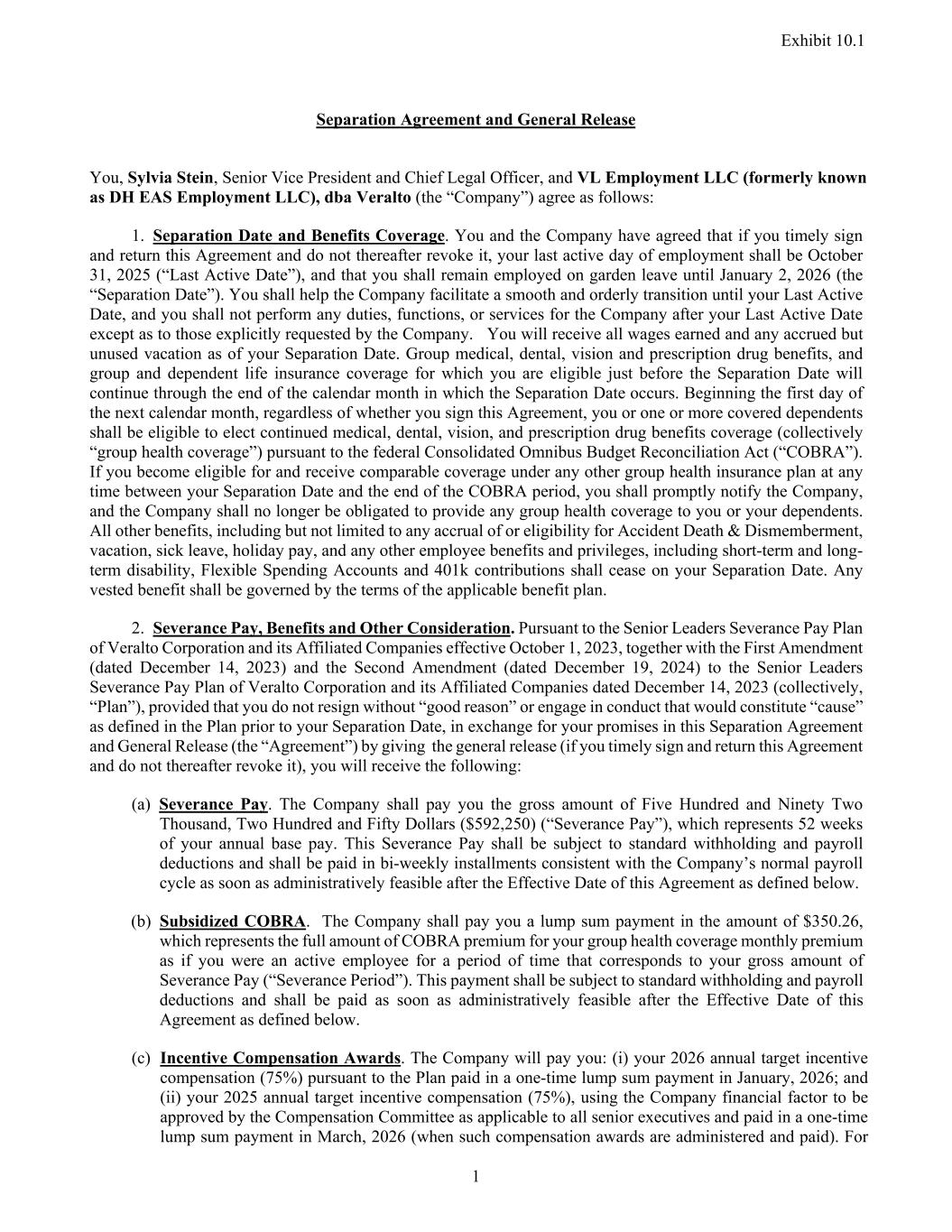 1 Separation Agreement and General Release You, Sylvia Stein, Senior Vice President and Chief Legal Officer, and VL Employment LLC (formerly known as DH EAS Employment LLC), dba Veralto (the “Company”) agree as follows: 1. Separation Date and Benefits Coverage. You and the Company have agreed that if you timely sign and return this Agreement and do not thereafter revoke it, your last active day of employment shall be October 31, 2025 (“Last Active Date”), and that you shall remain employed on garden leave until January 2, 2026 (the “Separation Date”). You shall help the Company facilitate a smooth and orderly transition until your Last Active Date, and you shall not perform any duties, functions, or services for the Company after your Last Active Date except as to those explicitly requested by the Company. You will receive all wages earned and any accrued but unused vacation as of your Separation Date. Group medical, dental, vision and prescription drug benefits, and group and dependent life insurance coverage for which you are eligible just before the Separation Date will continue through the end of the calendar month in which the Separation Date occurs. Beginning the first day of the next calendar month, regardless of whether you sign this Agreement, you or one or more covered dependents shall be eligible to elect continued medical, dental, vision, and prescription drug benefits coverage (collectively “group health coverage”) pursuant to the federal Consolidated Omnibus Budget Reconciliation Act (“COBRA”). If you become eligible for and receive comparable coverage under any other group health insurance plan at any time between your Separation Date and the end of the COBRA period, you shall promptly notify the Company, and the Company shall no longer be obligated to provide any group health coverage to you or your dependents. All other benefits, including but not limited to any accrual of or eligibility for Accident Death & Dismemberment, vacation, sick leave, holiday pay, and any other employee benefits and privileges, including short-term and long- term disability, Flexible Spending Accounts and 401k contributions shall cease on your Separation Date. Any vested benefit shall be governed by the terms of the applicable benefit plan. 2. Severance Pay, Benefits and Other Consideration. Pursuant to the Senior Leaders Severance Pay Plan of Veralto Corporation and its Affiliated Companies effective October 1, 2023, together with the First Amendment (dated December 14, 2023) and the Second Amendment (dated December 19, 2024) to the Senior Leaders Severance Pay Plan of Veralto Corporation and its Affiliated Companies dated December 14, 2023 (collectively, “Plan”), provided that you do not resign without “good reason” or engage in conduct that would constitute “cause” as defined in the Plan prior to your Separation Date, in exchange for your promises in this Separation Agreement and General Release (the “Agreement”) by giving the general release (if you timely sign and return this Agreement and do not thereafter revoke it), you will receive the following: (a) Severance Pay. The Company shall pay you the gross amount of Five Hundred and Ninety Two Thousand, Two Hundred and Fifty Dollars ($592,250) (“Severance Pay”), which represents 52 weeks of your annual base pay. This Severance Pay shall be subject to standard withholding and payroll deductions and shall be paid in bi-weekly installments consistent with the Company’s normal payroll cycle as soon as administratively feasible after the Effective Date of this Agreement as defined below. (b) Subsidized COBRA. The Company shall pay you a lump sum payment in the amount of $350.26, which represents the full amount of COBRA premium for your group health coverage monthly premium as if you were an active employee for a period of time that corresponds to your gross amount of Severance Pay (“Severance Period”). This payment shall be subject to standard withholding and payroll deductions and shall be paid as soon as administratively feasible after the Effective Date of this Agreement as defined below. (c) Incentive Compensation Awards. The Company will pay you: (i) your 2026 annual target incentive compensation (75%) pursuant to the Plan paid in a one-time lump sum payment in January, 2026; and (ii) your 2025 annual target incentive compensation (75%), using the Company financial factor to be approved by the Compensation Committee as applicable to all senior executives and paid in a one-time lump sum payment in March, 2026 (when such compensation awards are administered and paid). For Exhibit 10.1