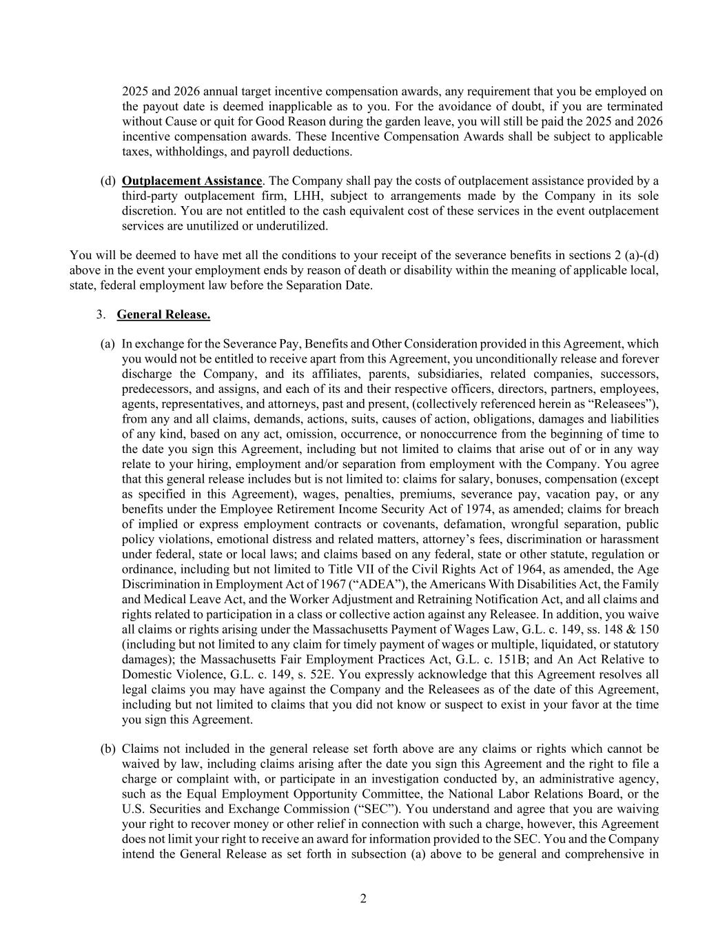 2 2025 and 2026 annual target incentive compensation awards, any requirement that you be employed on the payout date is deemed inapplicable as to you. For the avoidance of doubt, if you are terminated without Cause or quit for Good Reason during the garden leave, you will still be paid the 2025 and 2026 incentive compensation awards. These Incentive Compensation Awards shall be subject to applicable taxes, withholdings, and payroll deductions. (d) Outplacement Assistance. The Company shall pay the costs of outplacement assistance provided by a third-party outplacement firm, LHH, subject to arrangements made by the Company in its sole discretion. You are not entitled to the cash equivalent cost of these services in the event outplacement services are unutilized or underutilized. You will be deemed to have met all the conditions to your receipt of the severance benefits in sections 2 (a)-(d) above in the event your employment ends by reason of death or disability within the meaning of applicable local, state, federal employment law before the Separation Date. 3. General Release. (a) In exchange for the Severance Pay, Benefits and Other Consideration provided in this Agreement, which you would not be entitled to receive apart from this Agreement, you unconditionally release and forever discharge the Company, and its affiliates, parents, subsidiaries, related companies, successors, predecessors, and assigns, and each of its and their respective officers, directors, partners, employees, agents, representatives, and attorneys, past and present, (collectively referenced herein as “Releasees”), from any and all claims, demands, actions, suits, causes of action, obligations, damages and liabilities of any kind, based on any act, omission, occurrence, or nonoccurrence from the beginning of time to the date you sign this Agreement, including but not limited to claims that arise out of or in any way relate to your hiring, employment and/or separation from employment with the Company. You agree that this general release includes but is not limited to: claims for salary, bonuses, compensation (except as specified in this Agreement), wages, penalties, premiums, severance pay, vacation pay, or any benefits under the Employee Retirement Income Security Act of 1974, as amended; claims for breach of implied or express employment contracts or covenants, defamation, wrongful separation, public policy violations, emotional distress and related matters, attorney’s fees, discrimination or harassment under federal, state or local laws; and claims based on any federal, state or other statute, regulation or ordinance, including but not limited to Title VII of the Civil Rights Act of 1964, as amended, the Age Discrimination in Employment Act of 1967 (“ADEA”), the Americans With Disabilities Act, the Family and Medical Leave Act, and the Worker Adjustment and Retraining Notification Act, and all claims and rights related to participation in a class or collective action against any Releasee. In addition, you waive all claims or rights arising under the Massachusetts Payment of Wages Law, G.L. c. 149, ss. 148 & 150 (including but not limited to any claim for timely payment of wages or multiple, liquidated, or statutory damages); the Massachusetts Fair Employment Practices Act, G.L. c. 151B; and An Act Relative to Domestic Violence, G.L. c. 149, s. 52E. You expressly acknowledge that this Agreement resolves all legal claims you may have against the Company and the Releasees as of the date of this Agreement, including but not limited to claims that you did not know or suspect to exist in your favor at the time you sign this Agreement. (b) Claims not included in the general release set forth above are any claims or rights which cannot be waived by law, including claims arising after the date you sign this Agreement and the right to file a charge or complaint with, or participate in an investigation conducted by, an administrative agency, such as the Equal Employment Opportunity Committee, the National Labor Relations Board, or the U.S. Securities and Exchange Commission (“SEC”). You understand and agree that you are waiving your right to recover money or other relief in connection with such a charge, however, this Agreement does not limit your right to receive an award for information provided to the SEC. You and the Company intend the General Release as set forth in subsection (a) above to be general and comprehensive in