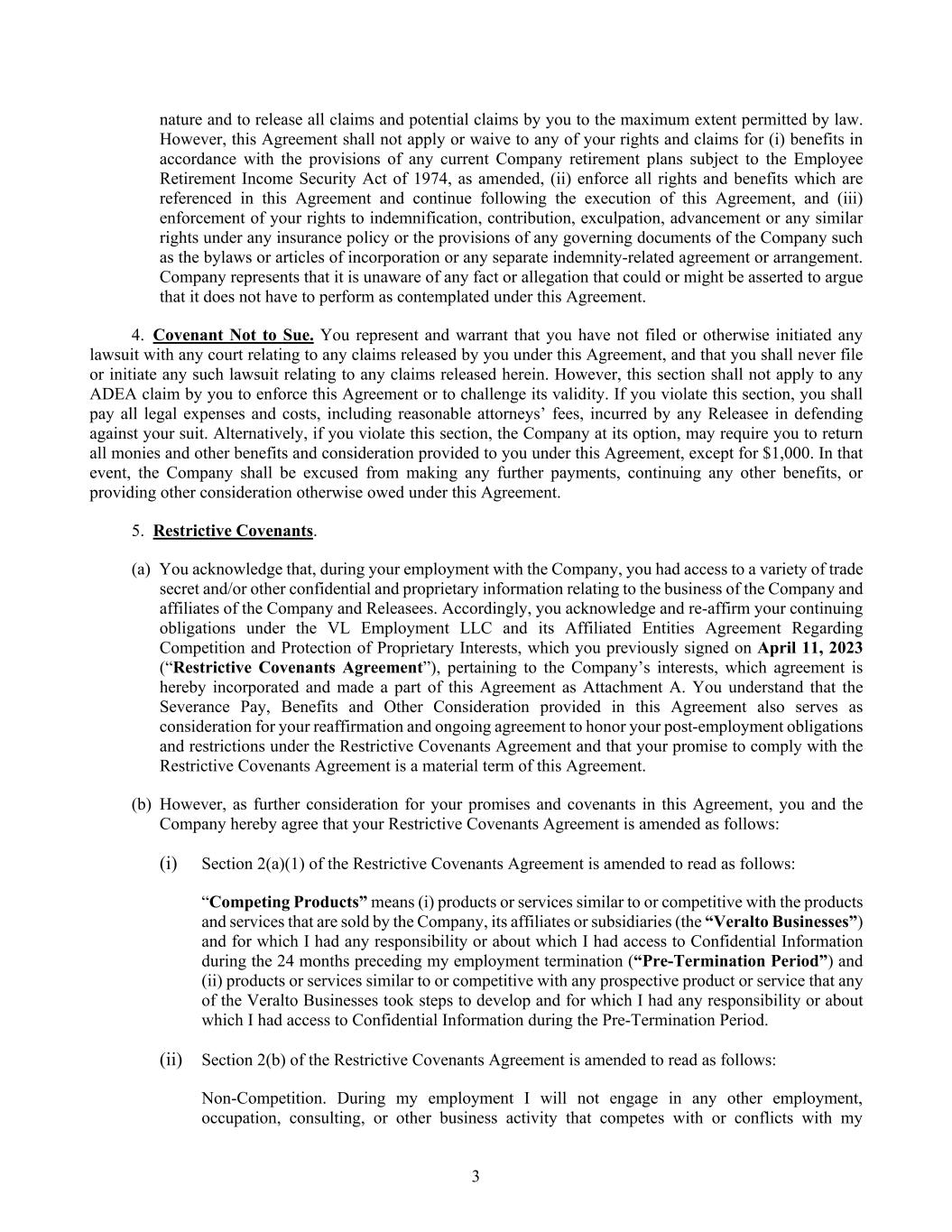 3 nature and to release all claims and potential claims by you to the maximum extent permitted by law. However, this Agreement shall not apply or waive to any of your rights and claims for (i) benefits in accordance with the provisions of any current Company retirement plans subject to the Employee Retirement Income Security Act of 1974, as amended, (ii) enforce all rights and benefits which are referenced in this Agreement and continue following the execution of this Agreement, and (iii) enforcement of your rights to indemnification, contribution, exculpation, advancement or any similar rights under any insurance policy or the provisions of any governing documents of the Company such as the bylaws or articles of incorporation or any separate indemnity-related agreement or arrangement. Company represents that it is unaware of any fact or allegation that could or might be asserted to argue that it does not have to perform as contemplated under this Agreement. 4. Covenant Not to Sue. You represent and warrant that you have not filed or otherwise initiated any lawsuit with any court relating to any claims released by you under this Agreement, and that you shall never file or initiate any such lawsuit relating to any claims released herein. However, this section shall not apply to any ADEA claim by you to enforce this Agreement or to challenge its validity. If you violate this section, you shall pay all legal expenses and costs, including reasonable attorneys’ fees, incurred by any Releasee in defending against your suit. Alternatively, if you violate this section, the Company at its option, may require you to return all monies and other benefits and consideration provided to you under this Agreement, except for $1,000. In that event, the Company shall be excused from making any further payments, continuing any other benefits, or providing other consideration otherwise owed under this Agreement. 5. Restrictive Covenants. (a) You acknowledge that, during your employment with the Company, you had access to a variety of trade secret and/or other confidential and proprietary information relating to the business of the Company and affiliates of the Company and Releasees. Accordingly, you acknowledge and re-affirm your continuing obligations under the VL Employment LLC and its Affiliated Entities Agreement Regarding Competition and Protection of Proprietary Interests, which you previously signed on April 11, 2023 (“Restrictive Covenants Agreement”), pertaining to the Company’s interests, which agreement is hereby incorporated and made a part of this Agreement as Attachment A. You understand that the Severance Pay, Benefits and Other Consideration provided in this Agreement also serves as consideration for your reaffirmation and ongoing agreement to honor your post-employment obligations and restrictions under the Restrictive Covenants Agreement and that your promise to comply with the Restrictive Covenants Agreement is a material term of this Agreement. (b) However, as further consideration for your promises and covenants in this Agreement, you and the Company hereby agree that your Restrictive Covenants Agreement is amended as follows: (i) Section 2(a)(1) of the Restrictive Covenants Agreement is amended to read as follows: “Competing Products” means (i) products or services similar to or competitive with the products and services that are sold by the Company, its affiliates or subsidiaries (the “Veralto Businesses”) and for which I had any responsibility or about which I had access to Confidential Information during the 24 months preceding my employment termination (“Pre-Termination Period”) and (ii) products or services similar to or competitive with any prospective product or service that any of the Veralto Businesses took steps to develop and for which I had any responsibility or about which I had access to Confidential Information during the Pre-Termination Period. (ii) Section 2(b) of the Restrictive Covenants Agreement is amended to read as follows: Non-Competition. During my employment I will not engage in any other employment, occupation, consulting, or other business activity that competes with or conflicts with my
