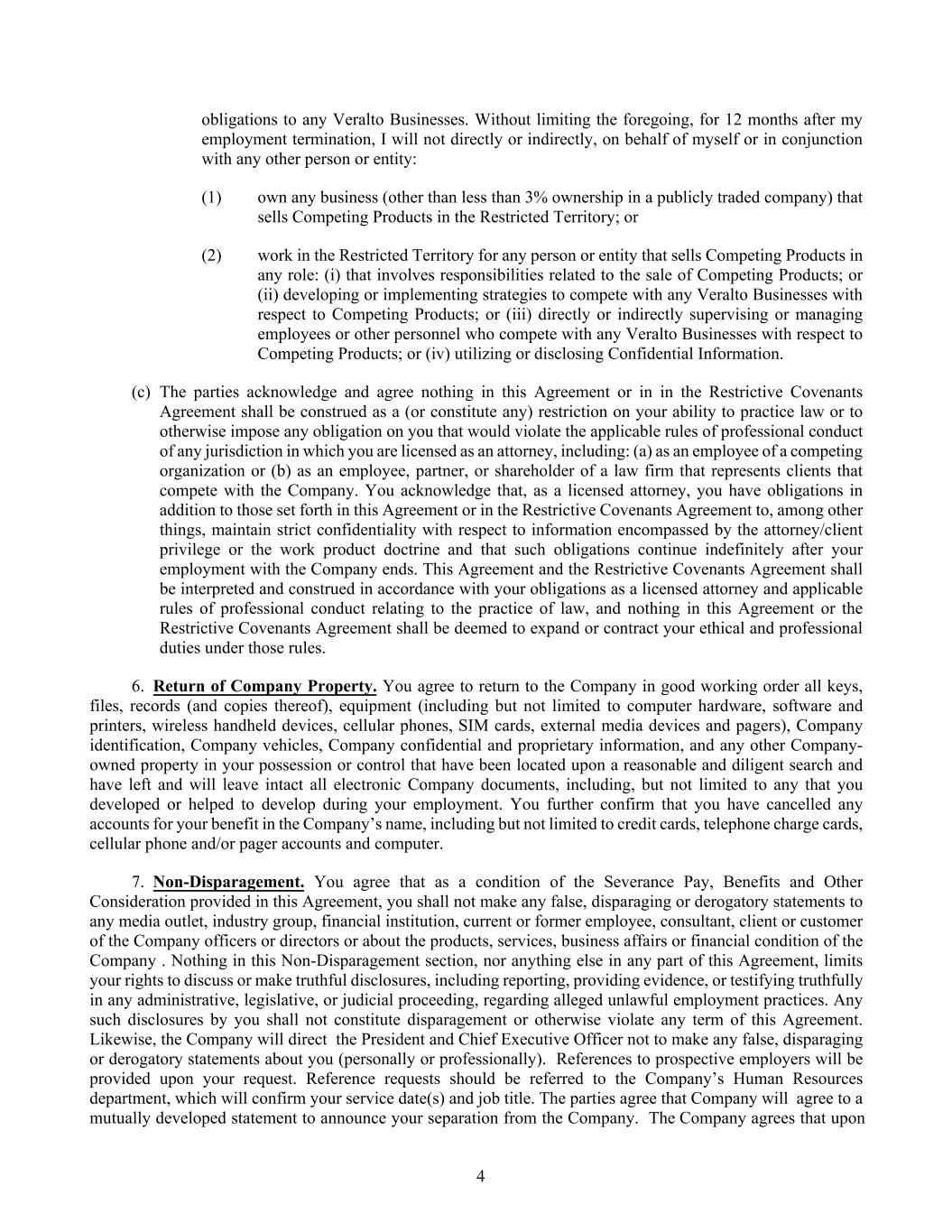 obligations to any Veralto Businesses. Without limiting the foregoing, for 12 months after my employment termination, I will not directly or indirectly, on behalf of myself or in conjunction with any other person or entity: (1) own any business (other than less than 3% ownership in a publicly traded company) that sells Competing Products in the Restricted Territory; or (2) work in the Restricted Territory for any person or entity that sells Competing Products in any role: (i) that involves responsibilities related to the sale of Competing Products; or (ii) developing or implementing strategies to compete with any Veralto Businesses with respect to Competing Products; or (iii) directly or indirectly supervising or managing employees or other personnel who compete with any Veralto Businesses with respect to Competing Products; or (iv) utilizing or disclosing Confidential Information. (c) The parties acknowledge and agree nothing in this Agreement or in in the Restrictive Covenants Agreement shall be construed as a (or constitute any) restriction on your ability to practice law or to otherwise impose any obligation on you that would violate the applicable rules of professional conduct of any jurisdiction in which you are licensed as an attorney, including: (a) as an employee of a competing organization or (b) as an employee, partner, or shareholder of a law firm that represents clients that compete with the Company. You acknowledge that, as a licensed attorney, you have obligations in addition to those set forth in this Agreement or in the Restrictive Covenants Agreement to, among other things, maintain strict confidentiality with respect to information encompassed by the attorney/client privilege or the work product doctrine and that such obligations continue indefinitely after your employment with the Company ends. This Agreement and the Restrictive Covenants Agreement shall be interpreted and construed in accordance with your obligations as a licensed attorney and applicable rules of professional conduct relating to the practice of law, and nothing in this Agreement or the Restrictive Covenants Agreement shall be deemed to expand or contract your ethical and professional duties under those rules. 6. Return of Company Property. You agree to return to the Company in good working order all keys, files, records (and copies thereof), equipment (including but not limited to computer hardware, software and printers, wireless handheld devices, cellular phones, SIM cards, external media devices and pagers), Company identification, Company vehicles, Company confidential and proprietary information, and any other Company- owned property in your possession or control that have been located upon a reasonable and diligent search and have left and will leave intact all electronic Company documents, including, but not limited to any that you developed or helped to develop during your employment. You further confirm that you have cancelled any accounts for your benefit in the Company’s name, including but not limited to credit cards, telephone charge cards, cellular phone and/or pager accounts and computer. 7. Non-Disparagement. You agree that as a condition of the Severance Pay, Benefits and Other Consideration provided in this Agreement, you shall not make any false, disparaging or derogatory statements to any media outlet, industry group, financial institution, current or former employee, consultant, client or customer of the Company officers or directors or about the products, services, business affairs or financial condition of the Company . Nothing in this Non-Disparagement section, nor anything else in any part of this Agreement, limits your rights to discuss or make truthful disclosures, including reporting, providing evidence, or testifying truthfully in any administrative, legislative, or judicial proceeding, regarding alleged unlawful employment practices. Any such disclosures by you shall not constitute disparagement or otherwise violate any term of this Agreement. Likewise, the Company will direct the President and Chief Executive Officer not to make any false, disparaging or derogatory statements about you (personally or professionally). References to prospective employers will be provided upon your request. Reference requests should be referred to the Company’s Human Resources department, which will confirm your service date(s) and job title. The parties agree that Company will agree to a mutually developed statement to announce your separation from the Company. The Company agrees that upon 4