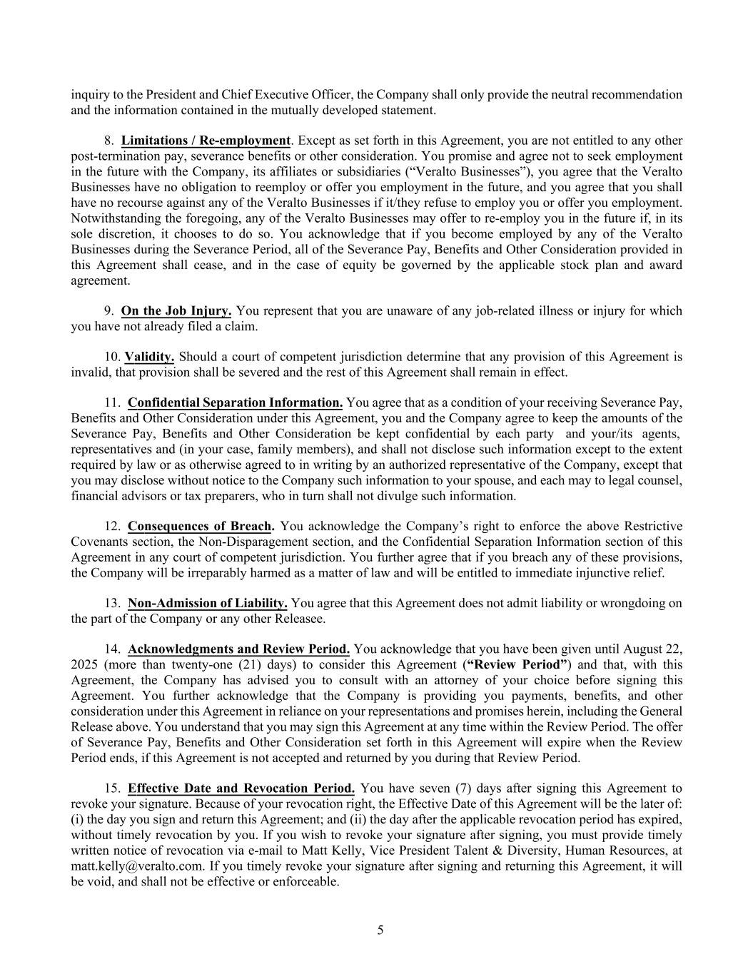 inquiry to the President and Chief Executive Officer, the Company shall only provide the neutral recommendation and the information contained in the mutually developed statement. 8. Limitations / Re-employment. Except as set forth in this Agreement, you are not entitled to any other post-termination pay, severance benefits or other consideration. You promise and agree not to seek employment in the future with the Company, its affiliates or subsidiaries (“Veralto Businesses”), you agree that the Veralto Businesses have no obligation to reemploy or offer you employment in the future, and you agree that you shall have no recourse against any of the Veralto Businesses if it/they refuse to employ you or offer you employment. Notwithstanding the foregoing, any of the Veralto Businesses may offer to re-employ you in the future if, in its sole discretion, it chooses to do so. You acknowledge that if you become employed by any of the Veralto Businesses during the Severance Period, all of the Severance Pay, Benefits and Other Consideration provided in this Agreement shall cease, and in the case of equity be governed by the applicable stock plan and award agreement. 9. On the Job Injury. You represent that you are unaware of any job-related illness or injury for which you have not already filed a claim. 10. Validity. Should a court of competent jurisdiction determine that any provision of this Agreement is invalid, that provision shall be severed and the rest of this Agreement shall remain in effect. 11. Confidential Separation Information. You agree that as a condition of your receiving Severance Pay, Benefits and Other Consideration under this Agreement, you and the Company agree to keep the amounts of the Severance Pay, Benefits and Other Consideration be kept confidential by each party and your/its agents, representatives and (in your case, family members), and shall not disclose such information except to the extent required by law or as otherwise agreed to in writing by an authorized representative of the Company, except that you may disclose without notice to the Company such information to your spouse, and each may to legal counsel, financial advisors or tax preparers, who in turn shall not divulge such information. 12. Consequences of Breach. You acknowledge the Company’s right to enforce the above Restrictive Covenants section, the Non-Disparagement section, and the Confidential Separation Information section of this Agreement in any court of competent jurisdiction. You further agree that if you breach any of these provisions, the Company will be irreparably harmed as a matter of law and will be entitled to immediate injunctive relief. 13. Non-Admission of Liability. You agree that this Agreement does not admit liability or wrongdoing on the part of the Company or any other Releasee. 14. Acknowledgments and Review Period. You acknowledge that you have been given until August 22, 2025 (more than twenty-one (21) days) to consider this Agreement (“Review Period”) and that, with this Agreement, the Company has advised you to consult with an attorney of your choice before signing this Agreement. You further acknowledge that the Company is providing you payments, benefits, and other consideration under this Agreement in reliance on your representations and promises herein, including the General Release above. You understand that you may sign this Agreement at any time within the Review Period. The offer of Severance Pay, Benefits and Other Consideration set forth in this Agreement will expire when the Review Period ends, if this Agreement is not accepted and returned by you during that Review Period. 15. Effective Date and Revocation Period. You have seven (7) days after signing this Agreement to revoke your signature. Because of your revocation right, the Effective Date of this Agreement will be the later of: (i) the day you sign and return this Agreement; and (ii) the day after the applicable revocation period has expired, without timely revocation by you. If you wish to revoke your signature after signing, you must provide timely written notice of revocation via e-mail to Matt Kelly, Vice President Talent & Diversity, Human Resources, at matt.kelly@veralto.com. If you timely revoke your signature after signing and returning this Agreement, it will be void, and shall not be effective or enforceable. 5