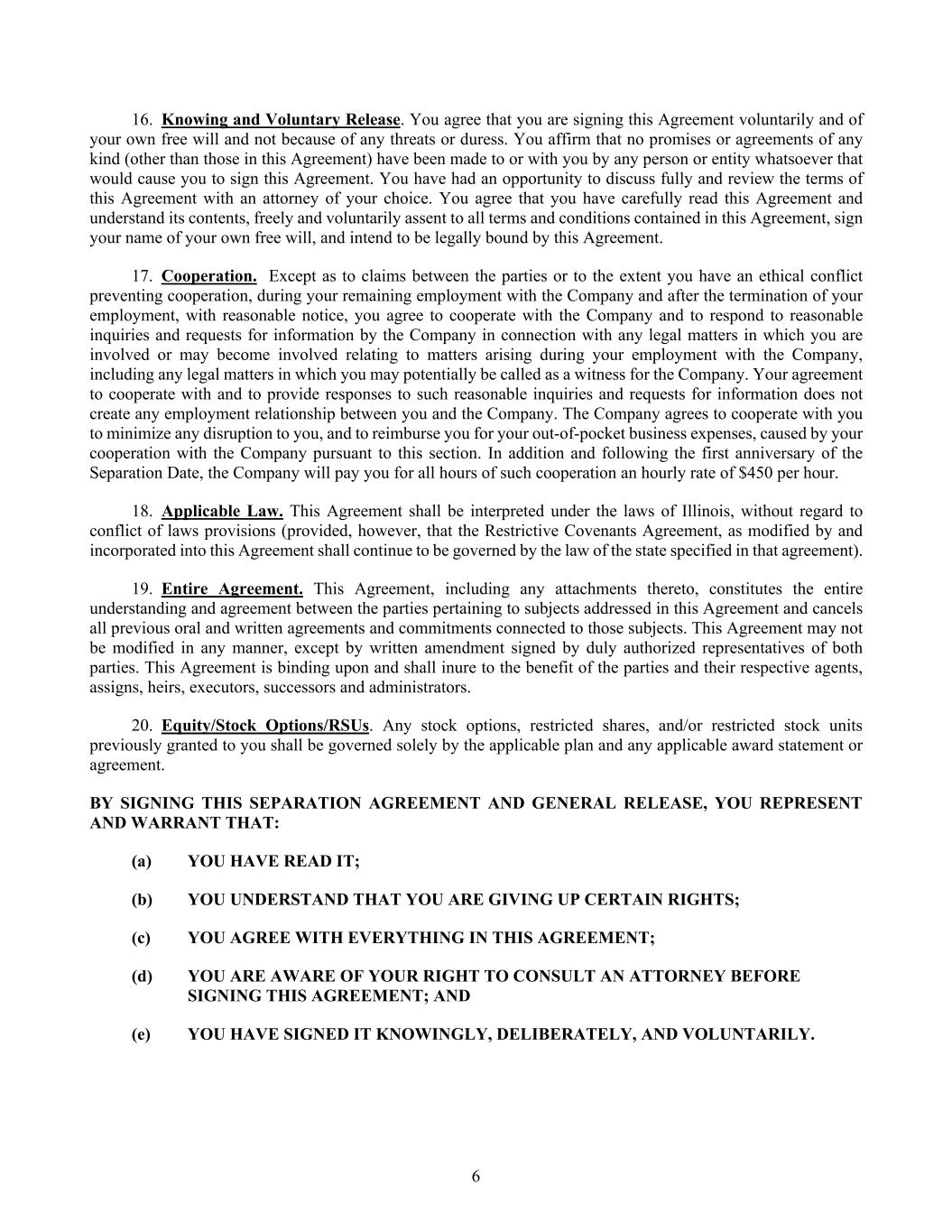 6 16. Knowing and Voluntary Release. You agree that you are signing this Agreement voluntarily and of your own free will and not because of any threats or duress. You affirm that no promises or agreements of any kind (other than those in this Agreement) have been made to or with you by any person or entity whatsoever that would cause you to sign this Agreement. You have had an opportunity to discuss fully and review the terms of this Agreement with an attorney of your choice. You agree that you have carefully read this Agreement and understand its contents, freely and voluntarily assent to all terms and conditions contained in this Agreement, sign your name of your own free will, and intend to be legally bound by this Agreement. 17. Cooperation. Except as to claims between the parties or to the extent you have an ethical conflict preventing cooperation, during your remaining employment with the Company and after the termination of your employment, with reasonable notice, you agree to cooperate with the Company and to respond to reasonable inquiries and requests for information by the Company in connection with any legal matters in which you are involved or may become involved relating to matters arising during your employment with the Company, including any legal matters in which you may potentially be called as a witness for the Company. Your agreement to cooperate with and to provide responses to such reasonable inquiries and requests for information does not create any employment relationship between you and the Company. The Company agrees to cooperate with you to minimize any disruption to you, and to reimburse you for your out-of-pocket business expenses, caused by your cooperation with the Company pursuant to this section. In addition and following the first anniversary of the Separation Date, the Company will pay you for all hours of such cooperation an hourly rate of $450 per hour. 18. Applicable Law. This Agreement shall be interpreted under the laws of Illinois, without regard to conflict of laws provisions (provided, however, that the Restrictive Covenants Agreement, as modified by and incorporated into this Agreement shall continue to be governed by the law of the state specified in that agreement). 19. Entire Agreement. This Agreement, including any attachments thereto, constitutes the entire understanding and agreement between the parties pertaining to subjects addressed in this Agreement and cancels all previous oral and written agreements and commitments connected to those subjects. This Agreement may not be modified in any manner, except by written amendment signed by duly authorized representatives of both parties. This Agreement is binding upon and shall inure to the benefit of the parties and their respective agents, assigns, heirs, executors, successors and administrators. 20. Equity/Stock Options/RSUs. Any stock options, restricted shares, and/or restricted stock units previously granted to you shall be governed solely by the applicable plan and any applicable award statement or agreement. BY SIGNING THIS SEPARATION AGREEMENT AND GENERAL RELEASE, YOU REPRESENT AND WARRANT THAT: (a) YOU HAVE READ IT; (b) YOU UNDERSTAND THAT YOU ARE GIVING UP CERTAIN RIGHTS; (c) YOU AGREE WITH EVERYTHING IN THIS AGREEMENT; (d) YOU ARE AWARE OF YOUR RIGHT TO CONSULT AN ATTORNEY BEFORE SIGNING THIS AGREEMENT; AND (e) YOU HAVE SIGNED IT KNOWINGLY, DELIBERATELY, AND VOLUNTARILY.