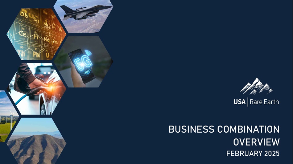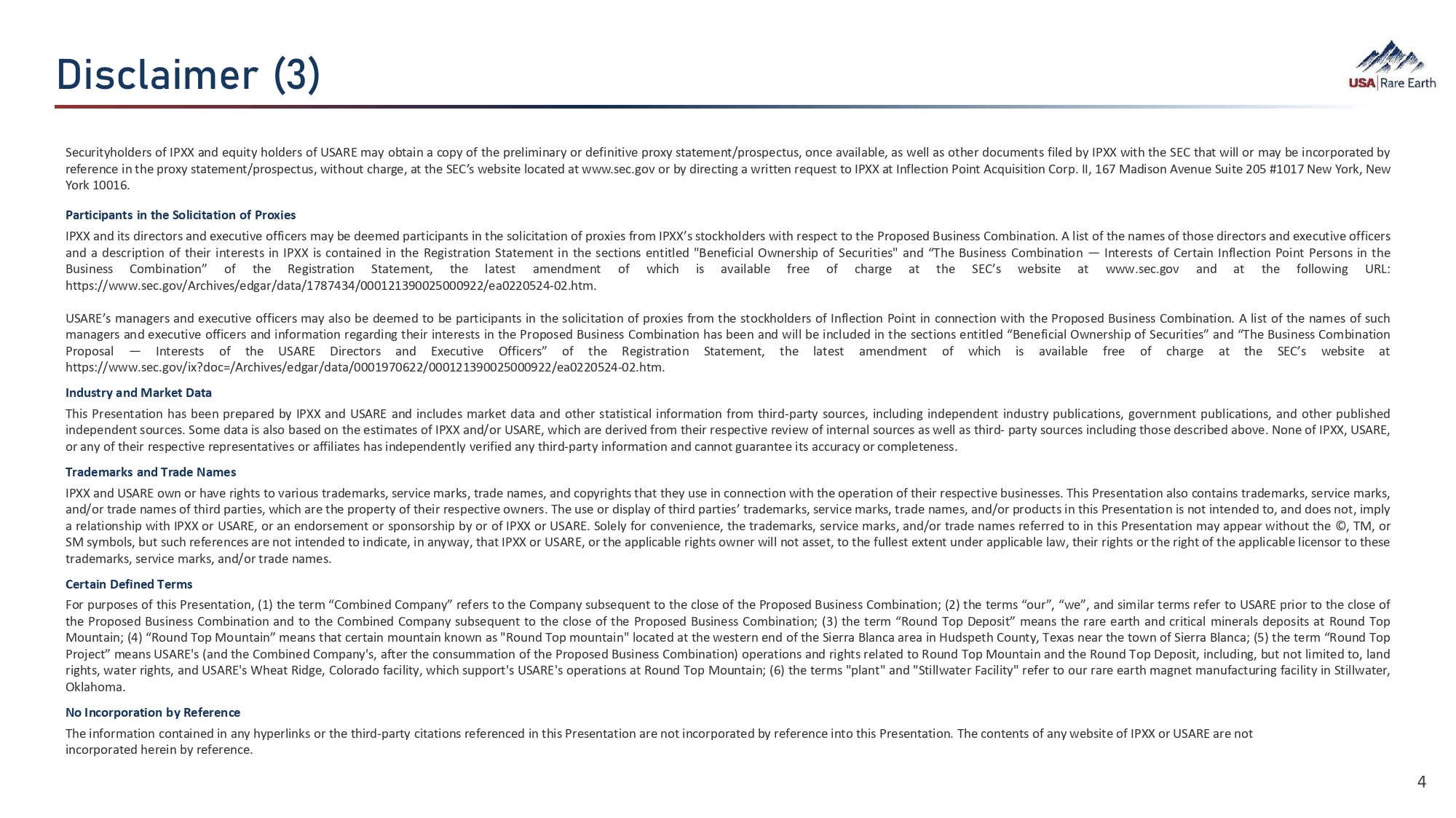 ¯Ü¼‚¯Á›Ø  ʞɹʟ 4 Securityholders of IPXX and equity holders of USARE may obtain a copy of the preliminary or definitive proxy statement/prospectus, once available, as well as other documents filed by IPXX with the SEC that will or may be incorporated by reference in the proxy statement/prospectus, without charge, at the SEC’s website located at www . sec . gov or by directing a written request to IPXX at Inflection Point Acquisition Corp . II, 167 Madison Avenue Suite 205 # 1017 New York, New York 10016 . Participants in the Solicitation of Proxies IPXX and its directors and executive officers may be deemed participants in the solicitation of proxies from IPXX’s stockholders with respect to the Proposed Business Combination . A list of the names of those directors and executive officers and a description of their interests in IPXX is contained in the Registration Statement in the sections entitled "Beneficial Ownership of Securities" and “The Business Combination — Interests of Certain Inflection Point Persons in the Business Combination” of the Registration Statement, the latest amendment of which is available free of charge at the SEC’s website at www . sec . gov and at the following URL : https : //www . sec . gov/Archives/edgar/data/ 1787434 / 000121390025000922 /ea 0220524 - 02 . htm . USARE’s managers and executive officers may also be deemed to be participants in the solicitation of proxies from the stockholders of Inflection Point in connection with the Proposed Business Combination . A list of the names of such managers and executive officers and information regarding their interests in the Proposed Business Combination has been and will be included in the sections entitled “Beneficial Ownership of Securities” and “The Business Combination Proposal — Interests of the USARE Directors and Executive Officers” of the Registration Statement, the latest amendment of which is available free of charge at the SEC’s website at https : //www . sec . gov/ix?doc=/Archives/edgar/data/ 0001970622 / 000121390025000922 /ea 0220524 - 02 . htm . Industry and Market Data This Presentation has been prepared by IPXX and USARE and includes market data and other statistical information from third - party sources, including independent industry publications, government publications, and other published independent sources . Some data is also based on the estimates of IPXX and/or USARE, which are derived from their respective review of internal sources as well as third - party sources including those described above . None of IPXX, USARE, or any of their respective representatives or affiliates has independently verified any third - party information and cannot guarantee its accuracy or completeness . Trademarks and Trade Names IPXX and USARE own or have rights to various trademarks, service marks, trade names, and copyrights that they use in connection with the operation of their respective businesses . This Presentation also contains trademarks, service marks, and/or trade names of third parties, which are the property of their respective owners . The use or display of third parties’ trademarks, service marks, trade names, and/or products in this Presentation is not intended to, and does not, imply a relationship with IPXX or USARE, or an endorsement or sponsorship by or of IPXX or USARE . Solely for convenience, the trademarks, service marks, and/or trade names referred to in this Presentation may appear without the ©, TM, or SM symbols, but such references are not intended to indicate, in anyway, that IPXX or USARE, or the applicable rights owner will not asset, to the fullest extent under applicable law, their rights or the right of the applicable licensor to these trademarks, service marks, and/or trade names . Certain Defined Terms For purposes of this Presentation, ( 1 ) the term “Combined Company” refers to the Company subsequent to the close of the Proposed Business Combination ; ( 2 ) the terms “our”, “we”, and similar terms refer to USARE prior to the close of the Proposed Business Combination and to the Combined Company subsequent to the close of the Proposed Business Combination ; ( 3 ) the term “Round Top Deposit” means the rare earth and critical minerals deposits at Round Top Mountain ; ( 4 ) “Round Top Mountain” means that certain mountain known as "Round Top mountain" located at the western end of the Sierra Blanca area in Hudspeth County, Texas near the town of Sierra Blanca ; ( 5 ) the term “Round Top Project” means USARE's (and the Combined Company's, after the consummation of the Proposed Business Combination) operations and rights related to Round Top Mountain and the Round Top Deposit, including, but not limited to, land rights, water rights, and USARE's Wheat Ridge, Colorado facility, which support's USARE's operations at Round Top Mountain ; ( 6 ) the terms "plant" and "Stillwater Facility" refer to our rare earth magnet manufacturing facility in Stillwater, Oklahoma . No Incorporation by Reference The information contained in any hyperlinks or the third - party citations referenced in this Presentation are not incorporated by reference into this Presentation. The contents of any website of IPXX or USARE are not incorporated herein by reference.