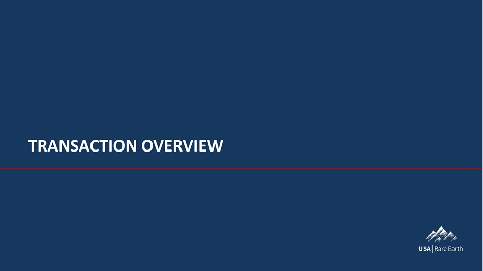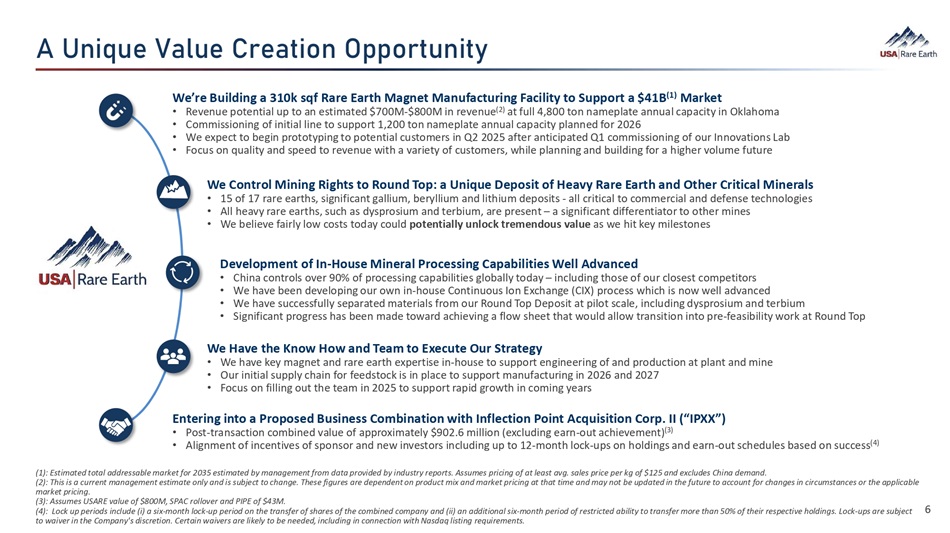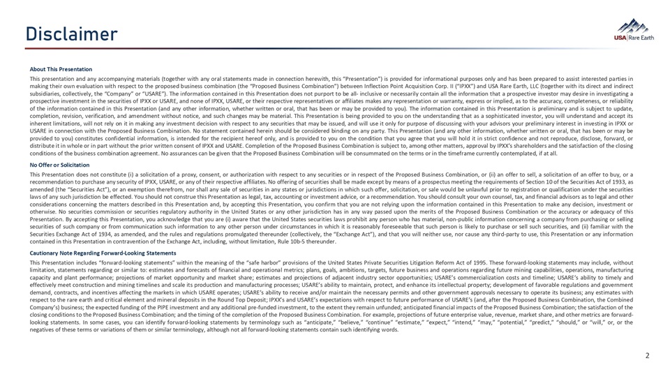 About This Presentation This presentation and any accompanying materials (together with any oral statements made in connection herewith, this “Presentation”) is provided for informational purposes only and has been prepared to assist interested parties in making their own evaluation with respect to the proposed business combination (the “Proposed Business Combination”) between Inflection Point Acquisition Corp . II (“IPXX”) and USA Rare Earth, LLC (together with its direct and indirect subsidiaries, collectively, the “Company” or “USARE”) . The information contained in this Presentation does not purport to be all - inclusive or necessarily contain all the information that a prospective investor may desire in investigating a prospective investment in the securities of IPXX or USARE, and none of IPXX, USARE, or their respective representatives or affiliates makes any representation or warranty, express or implied, as to the accuracy, completeness, or reliability of the information contained in this Presentation (and any other information, whether written or oral, that has been or may be provided to you) . The information contained in this Presentation is preliminary and is subject to update, completion, revision, verification, and amendment without notice, and such changes may be material . This Presentation is being provided to you on the understanding that as a sophisticated investor, you will understand and accept its inherent limitations, will not rely on it in making any investment decision with respect to any securities that may be issued, and will use it only for purpose of discussing with your advisors your preliminary interest in investing in IPXX or USARE in connection with the Proposed Business Combination . No statement contained herein should be considered binding on any party . This Presentation (and any other information, whether written or oral, that has been or may be provided to you) constitutes confidential information, is intended for the recipient hereof only, and is provided to you on the condition that you agree that you will hold it in strict confidence and not reproduce, disclose, forward, or distribute it in whole or in part without the prior written consent of IPXX and USARE . Completion of the Proposed Business Combination is subject to, among other matters, approval by IPXX’s shareholders and the satisfaction of the closing conditions of the business combination agreement . No assurances can be given that the Proposed Business Combination will be consummated on the terms or in the timeframe currently contemplated, if at all . No Offer or Solicitation This Presentation does not constitute (i) a solicitation of a proxy, consent, or authorization with respect to any securities or in respect of the Proposed Business Combination, or (ii) an offer to sell, a solicitation of an offer to buy, or a recommendation to purchase any security of IPXX, USARE, or any of their respective affiliates . No offering of securities shall be made except by means of a prospectus meeting the requirements of Section 10 of the Securities Act of 1933 , as amended (the “Securities Act”), or an exemption therefrom, nor shall any sale of securities in any states or jurisdictions in which such offer, solicitation, or sale would be unlawful prior to registration or qualification under the securities laws of any such jurisdiction be effected . You should not construe this Presentation as legal, tax, accounting or investment advice, or a recommendation . You should consult your own counsel, tax, and financial advisors as to legal and other considerations concerning the matters described in this Presentation and, by accepting this Presentation, you confirm that you are not relying upon the information contained in this Presentation to make any decision, investment or otherwise . No securities commission or securities regulatory authority in the United States or any other jurisdiction has in any way passed upon the merits of the Proposed Business Combination or the accuracy or adequacy of this Presentation . By accepting this Presentation, you acknowledge that you are (i) aware that the United States securities laws prohibit any person who has material, non - public information concerning a company from purchasing or selling securities of such company or from communication such information to any other person under circumstances in which it is reasonably foreseeable that such person is likely to purchase or sell such securities, and (ii) familiar with the Securities Exchange Act of 1934 , as amended, and the rules and regulations promulgated thereunder (collectively, the “Exchange Act”), and that you will neither use, nor cause any third - party to use, this Presentation or any information contained in this Presentation in contravention of the Exchange Act, including, without limitation, Rule 10 b - 5 thereunder . Cautionary Note Regarding Forward - Looking Statements This Presentation includes “forward - looking statements” within the meaning of the “safe harbor” provisions of the United States Private Securities Litigation Reform Act of 1995 . These forward - looking statements may include, without limitation, statements regarding or similar to : estimates and forecasts of financial and operational metrics ; plans, goals, ambitions, targets, future business and operations regarding future mining capabilities, operations, manufacturing capacity and plant performance ; projections of market opportunity and market share ; estimates and projections of adjacent industry sector opportunities ; USARE’s commercialization costs and timeline ; USARE’s ability to timely and effectively meet construction and mining timelines and scale its production and manufacturing processes ; USARE’s ability to maintain, protect, and enhance its intellectual property ; development of favorable regulations and government demand, contracts, and incentives affecting the markets in 