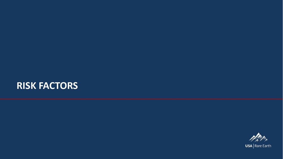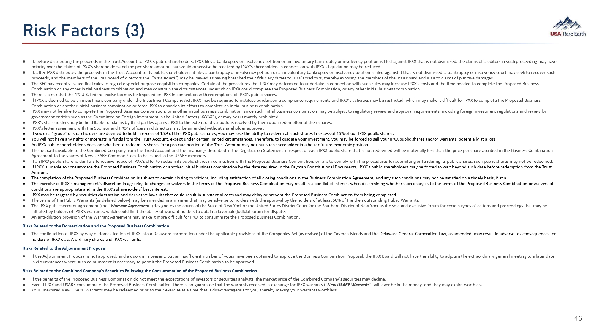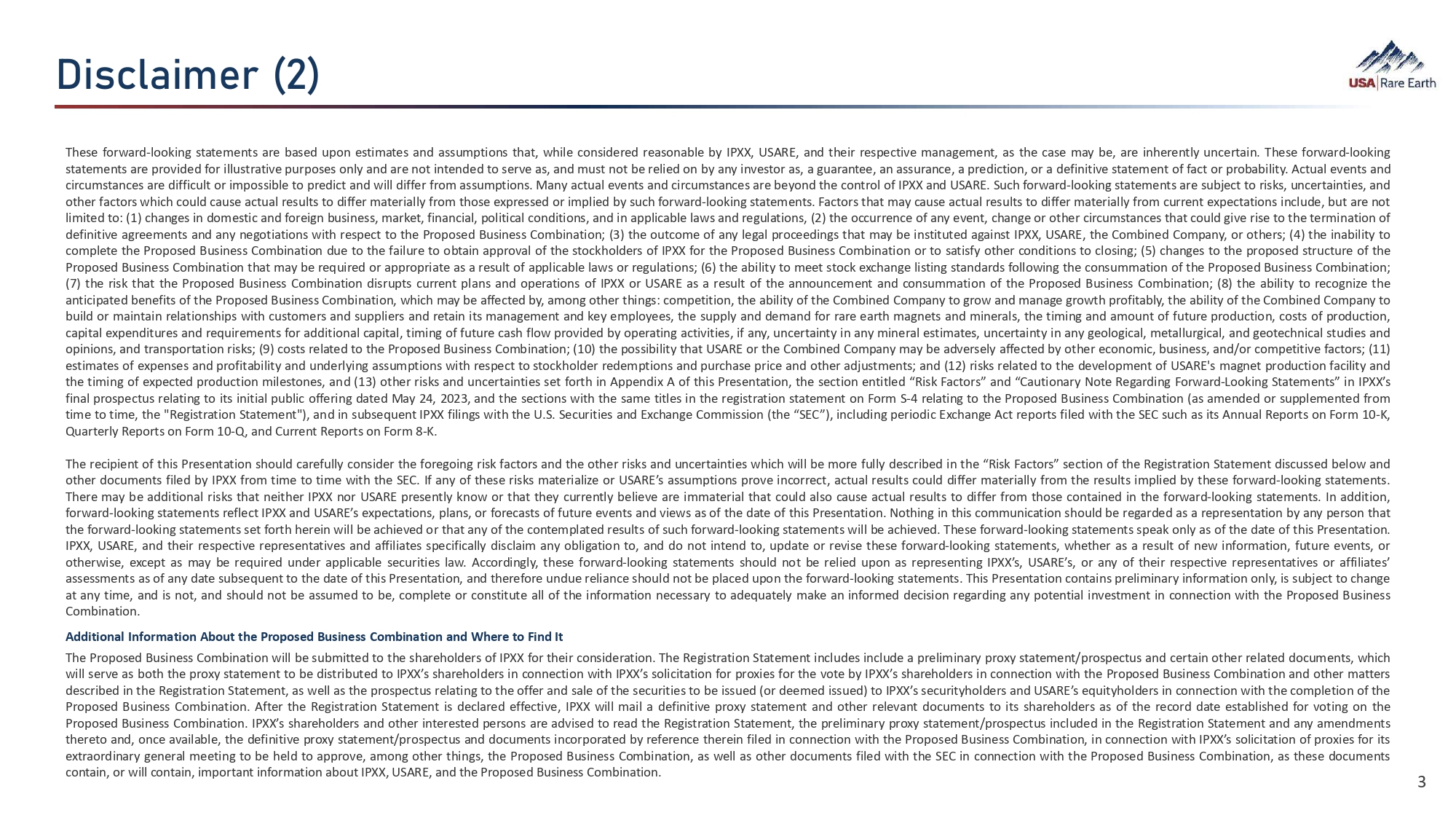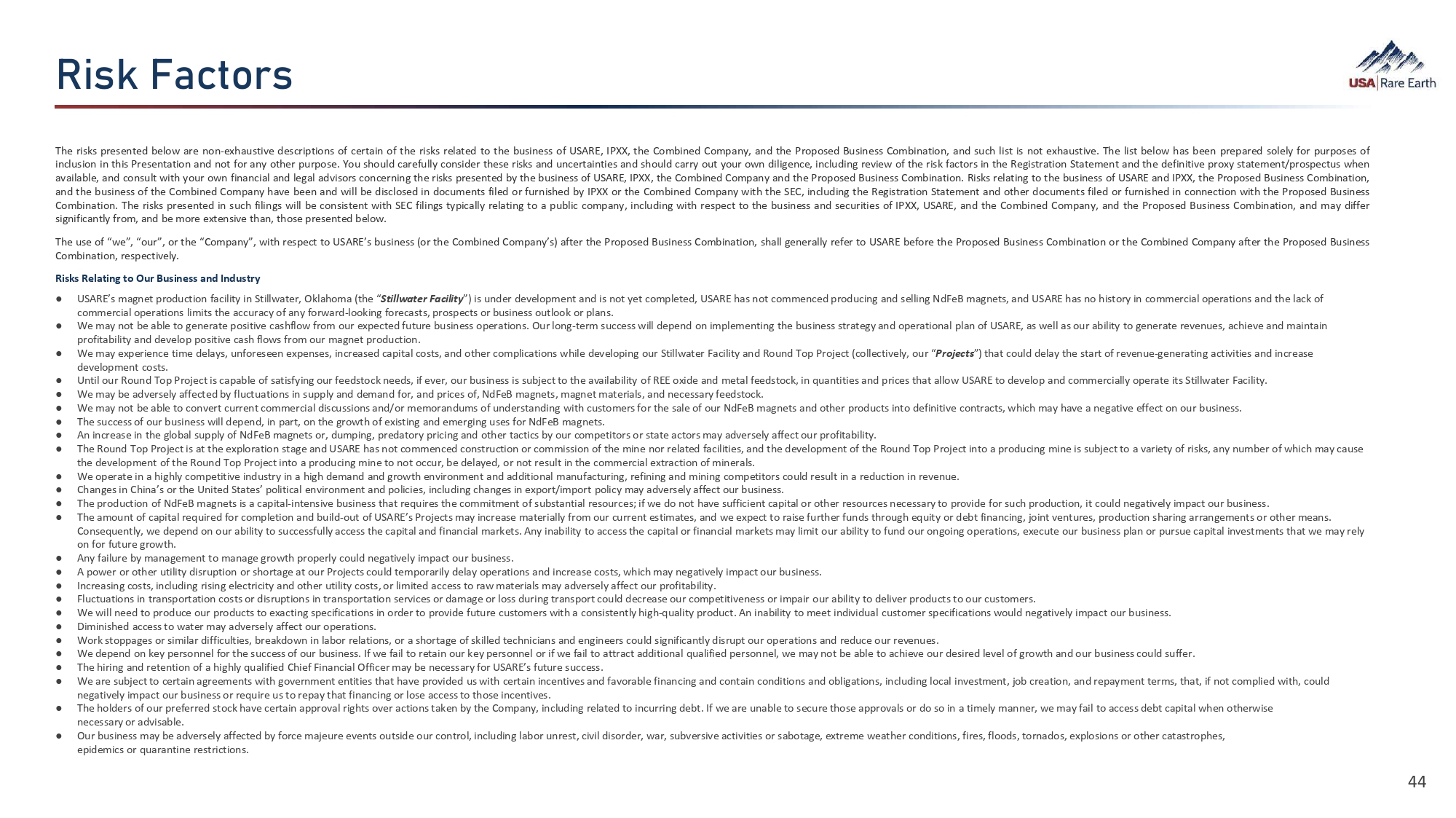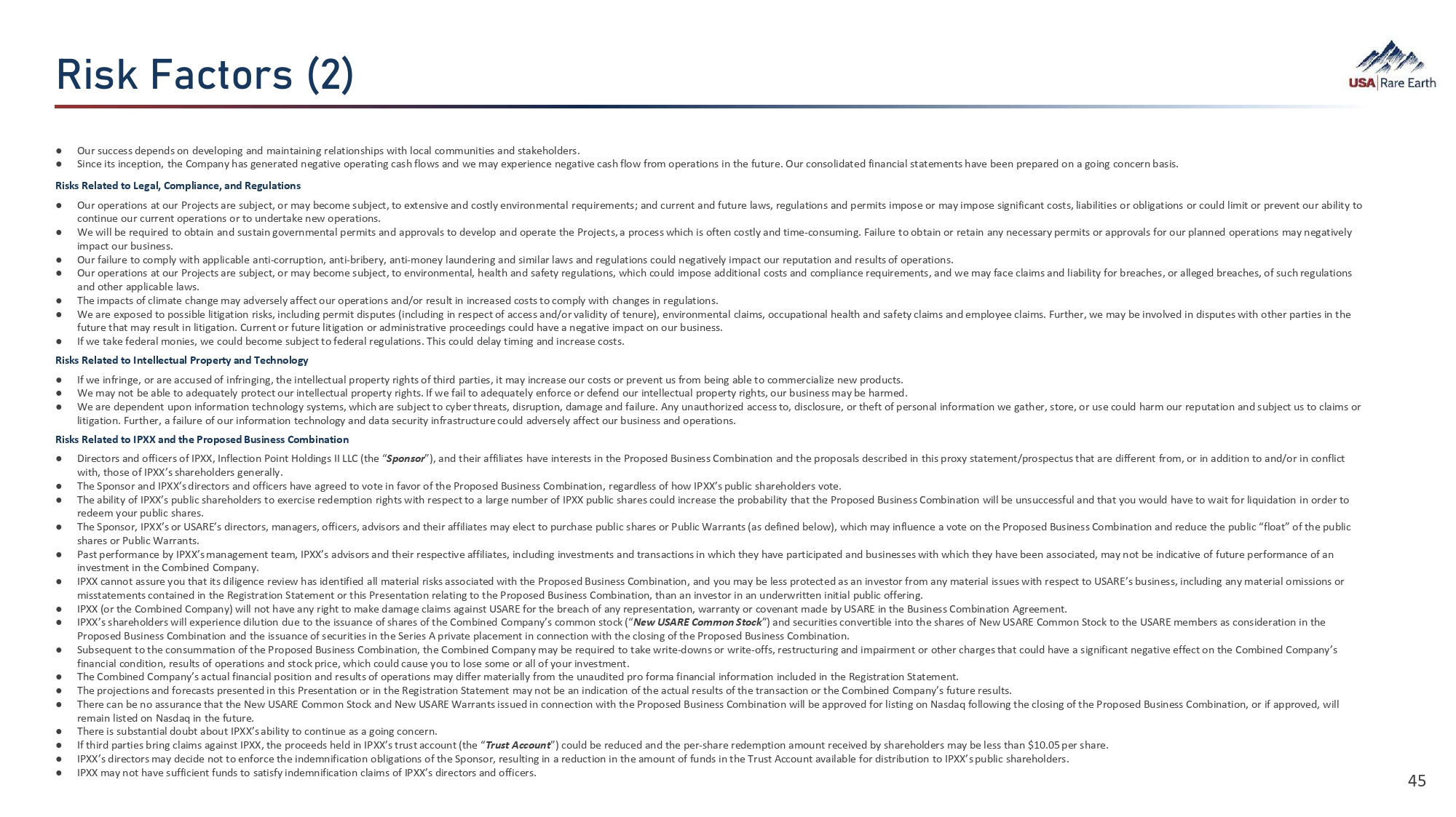 Y¯Ü¹  (‚ãÈØÜ 44 The risks presented below are non - exhaustive descriptions of certain of the risks related to the business of USARE, IPXX, the Combined Company, and the Proposed Business Combination, and such list is not exhaustive . The list below has been prepared solely for purposes of inclusion in this Presentation and not for any other purpose . You should carefully consider these risks and uncertainties and should carry out your own diligence, including review of the risk factors in the Registration Statement and the definitive proxy statement/prospectus when available, and consult with your own financial and legal advisors concerning the risks presented by the business of USARE, IPXX, the Combined Company and the Proposed Business Combination . Risks relating to the business of USARE and IPXX, the Proposed Business Combination, and the business of the Combined Company have been and will be disclosed in documents filed or furnished by IPXX or the Combined Company with the SEC, including the Registration Statement and other documents filed or furnished in connection with the Proposed Business Combination . The risks presented in such filings will be consistent with SEC filings typically relating to a public company, including with respect to the business and securities of IPXX, USARE, and the Combined Company, and the Proposed Business Combination, and may differ significantly from, and be more extensive than, those presented below . The use of “we”, “our”, or the “Company”, with respect to USARE’s business (or the Combined Company’s) after the Proposed Business Combination, shall generally refer to USARE before the Proposed Business Combination or the Combined Company after the Proposed Business Combination, respectively . Risks Relating to Our Business and Industry ● USARE’s magnet production facility in Stillwater, Oklahoma (the “ Stillwater Facility ”) is under development and is not yet completed, USARE has not commenced producing and selling NdFeB magnets, and USARE has no history in commercial operations and the lack of commercial operations limits the accuracy of any forward - looking forecasts, prospects or business outlook or plans. ● We may not be able to generate positive cashflow from our expected future business operations. Our long - term success will depend on implementing the business strategy and operational plan of USARE, as well as our ability to generate revenues, achieve and maintain profitability and develop positive cash flows from our magnet production. ● We may experience time delays, unforeseen expenses, increased capital costs, and other complications while developing our Stillwater Facility and Round Top Project (collectively, our “ Projects ”) that could delay the start of revenue - generating activities and increase development costs. ● Until our Round Top Project is capable of satisfying our feedstock needs, if ever, our business is subject to the availability of REE oxide and metal feedstock, in quantities and prices that allow USARE to develop and commercially operate its Stillwater Facility. ● We may be adversely affected by fluctuations in supply and demand for, and prices of, NdFeB magnets, magnet materials, and necessary feedstock. ● We may not be able to convert current commercial discussions and/or memorandums of understanding with customers for the sale of our NdFeB magnets and other products into definitive contracts, which may have a negative effect on our business. ● The success of our business will depend, in part, on the growth of existing and emerging uses for NdFeB magnets. ● An increase in the global supply of NdFeB magnets or, dumping, predatory pricing and other tactics by our competitors or state actors may adversely affect our profitability. ● The Round Top Project is at the exploration stage and USARE has not commenced construction or commission of the mine nor related facilities, and the development of the Round Top Project into a producing mine is subject to a variety of risks, any number of which may cause the development of the Round Top Project into a producing mine to not occur, be delayed, or not result in the commercial extraction of minerals. ● We operate in a highly competitive industry in a high demand and growth environment and additional manufacturing, refining and mining competitors could result in a reduction in revenue. ● Changes in China’s or the United States’ political environment and policies, including changes in export/import policy may adversely affect our business. ● The production of NdFeB magnets is a capital - intensive business that requires the commitment of substantial resources; if we do not have sufficient capital or other resources necessary to provide for such production, it could negatively impact our business. ● The amount of capital required for completion and build - out of USARE’s Projects may increase materially from our current estimates, and we expect to raise further funds through equity or debt financing, joint ventures, production sharing arrangements or other means. Consequently, we depend on our ability to successfully access the capital and financial markets. Any inability to access the capital or financial markets may limit our ability to fund our ongoing operations, execute our business plan or pursue capital investments that we may rely on for future growth. ● Any failure by management to manage growth properly could negatively impact our business. ● A power or other utility disruption or shortage at our Projects could temporarily delay operations and increase costs, which may negatively impact our business. ● Increasing costs, including rising electricity and other utility costs, or limited access to raw materials may adversely affect our profitability. ● Fluctuations in transportation costs or disruptions in transportation services or damage or loss during transport could decrease our competitiveness 