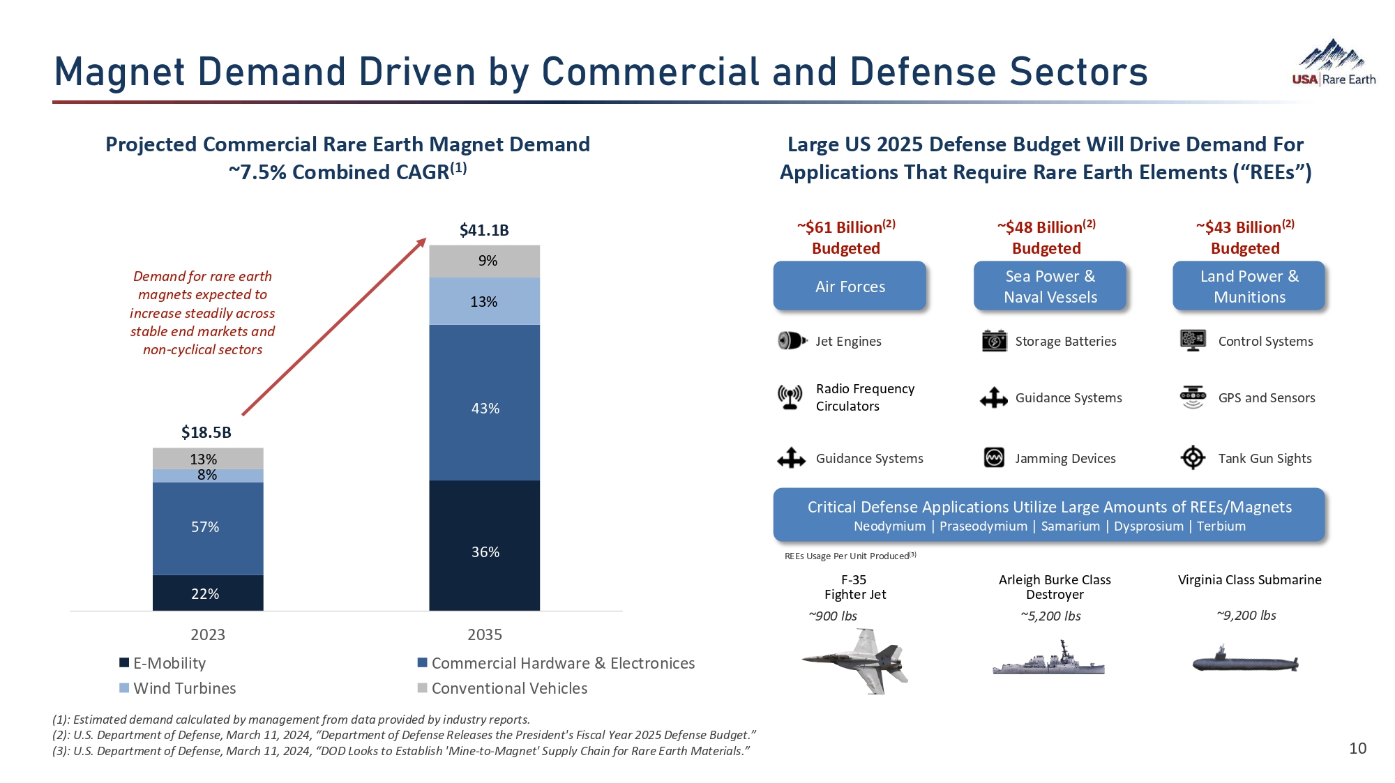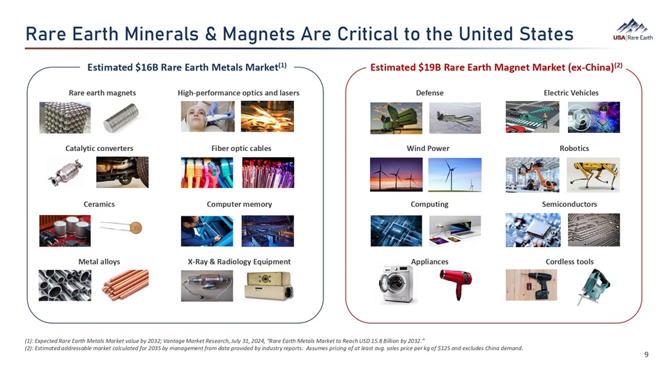 Y‚Ø›  ‚Øã­  B¯Â›Ø‚¼Ü  ˬ  B‚©Â›ãÜ  Ø›  د㯐‚¼  ãÈ  ã­›  h¯㛕  ]ã‚ã›Ü (1): Expected Rare Earth Metals Market value by 2032; Vantage Market Research, July 31, 2024, “Rare Earth Metals Market to Reach USD 15.8 Billion by 2032.” Catalytic converters Fiber optic cables Wind Power Robotics Ceramics Computer memory Computing Semiconductors Metal alloys X - Ray & Radiology Equipment Appliances Cordless tools Estimated $16B Rare Earth Metals Market (1) Estimated $19B Rare Earth Magnet Market (ex - China) (2) Rare earth magnets High - performance optics and lasers Defense Electric Vehicles (2): Estimated addressable market calculated for 2035 by management from data provided by industry reports. Assumes pricing of at least avg. sales price per kg of $125 and excludes China demand. 9