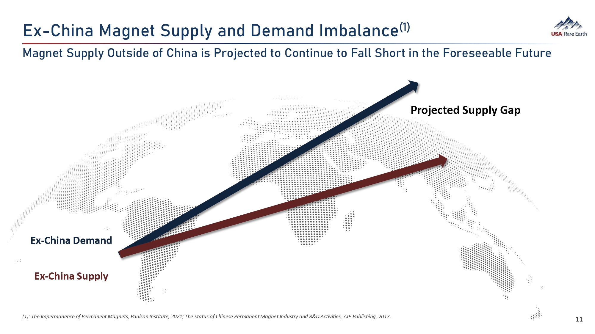 B‚©Â›ã  ›Á‚•  دó›Â  Žö  ÈÁÁ›Ø¯‚¼  ‚•  ›¨›ÂÜ›  ]›ãÈØÜ (1) : Estimated demand calculated by management from data provided by industry reports. (2) : U.S. Department of Defense, March 11, 2024, “Department of Defense Releases the President's Fiscal Year 2025 Defense Budget.” (3) : U.S. Department of Defense, March 11, 2024, “DOD Looks to Establish 'Mine - to - Magnet' Supply Chain for Rare Earth Materials.” 10 Projected Commercial Rare Earth Magnet Demand ~7.5% Combined CAGR (1) Large US 2025 Defense Budget Will Drive Demand For Applications That Require Rare Earth Elements (“REEs”) $41.1B Demand for rare earth magnets expected to increase steadily across stable end markets and non - cyclical sectors $18.5B Guidance Systems Jamming Devices Tank Gun Sights Guidance Systems GPS and Sensors Radio Frequency Circulators Air Forces ~$48 Billion (2) Budgeted Sea Power & Naval Vessels ~$43 Billion (2) Budgeted Land Power & Munitions F - 35 Fighter Jet ~900 lbs Arleigh Burke Class Destroyer ~5,200 lbs Virginia Class Submarine ~9,200 lbs Critical Defense Applications Utilize Large Amounts of REEs/Magnets Neodymium | Praseodymium | Samarium | Dysprosium | Terbium ~$61 Billion (2) Budgeted REEs Usage Per Unit Produced (3) Jet Engines Storage Batteries Control Systems 2023 E - Mobility Wind Turbines 2035 Commercial Hardware & Electronices Conventional Vehicles 22% 57% 8% 13% 36% 43% 13% 9%