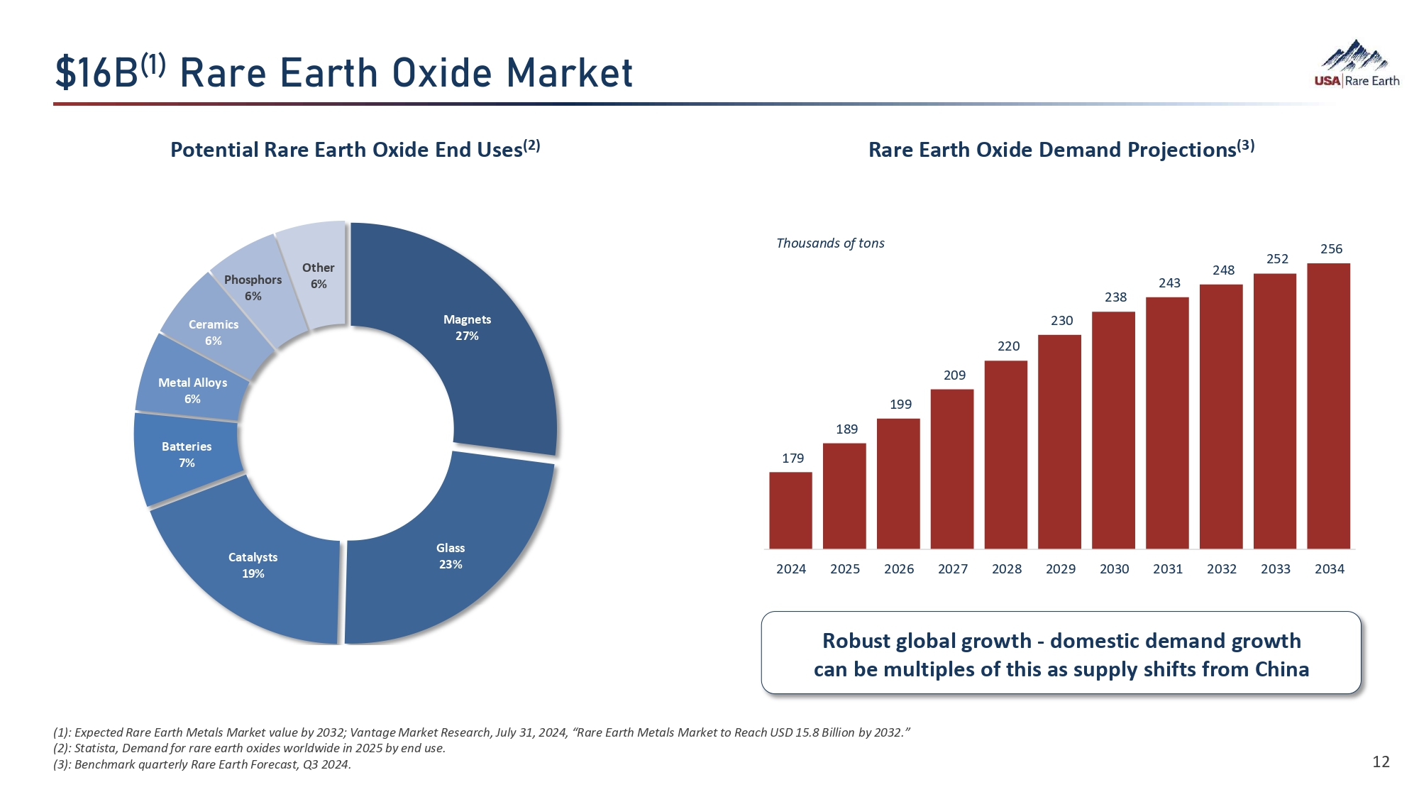 ˚ɷɼ ʞɷʟ  Y‚Ø›  ‚Øã­  Iõ¯•›  B‚ع›ã (1) : Expected Rare Earth Metals Market value by 2032; Vantage Market Research, July 31, 2024, “Rare Earth Metals Market to Reach USD 15.8 Billion by 2032.” (2) : Statista, Demand for rare earth oxides worldwide in 2025 by end use. (3) : Benchmark quarterly Rare Earth Forecast, Q3 2024. 12 179 189 199 209 220 230 238 243 248 252 256 2024 2025 2026 2027 2028 2029 2030 2031 2032 2033 2034 Thousands of tons Robust global growth - domestic demand growth can be multiples of this as supply shifts from China Magnets 27% Glass 23% Catalysts 19% Batteries 7% Metal Alloys 6% Ceramics 6% Phosphors 6% Other 6% Potential Rare Earth Oxide End Uses (2) Rare Earth Oxide Demand Projections (3)