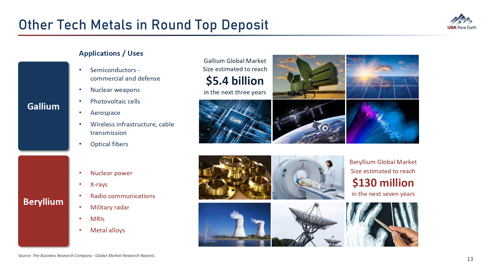 Gallium Beryllium Iã­›Ø  d›­  B›ã‚¼Ü  ¯Â  YÈç•  dÈÕ  ›ÕÈܯ㠕 Semiconductors - commercial and defense • Nuclear weapons • Photovoltaic cells • Aerospace • Wireless infrastructure, cable transmission • Optical fibers • Nuclear power • X - rays • Radio communications • Military radar • MRIs • Metal alloys 13 Source: The Business Research Company - Global Market Research Reports. Gallium Global Market Size estimated to reach $5.4 billion in the next three years Beryllium Global Market Size estimated to reach $130 million in the next seven years Applications / Uses