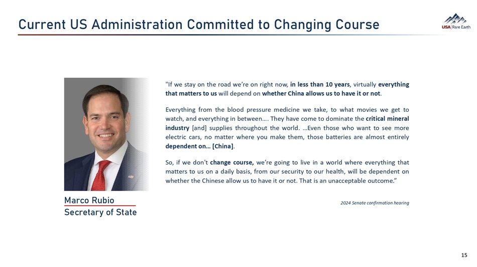 çØØ›Âã  h]  •Á¯Â¯ÜãØ‚ã¯È  ÈÁÁ¯ã㛕  ãÈ  ­‚©¯Â©  ÈçØÜ› B‚ØÈ  YçŽ¯È  ]›Ø›ã‚Øö  Ȩ  ]ã‚ã› 2024 Senate confirmation hearing "If we stay on the road we’re on right now, in less than 10 years , virtually everything that matters to us will depend on whether China allows us to have it or not . Everything from the blood pressure medicine we take, to what movies we get to watch, and everything in between … . They have come to dominate the critical mineral industry [and] supplies throughout the world . … Even those who want to see more electric cars, no matter where you make them, those batteries are almost entirely dependent on … [China] . So, if we don't change course, we’re going to live in a world where everything that matters to us on a daily basis, from our security to our health, will be dependent on whether the Chinese allow us to have it or not . That is an unacceptable outcome . ” 15