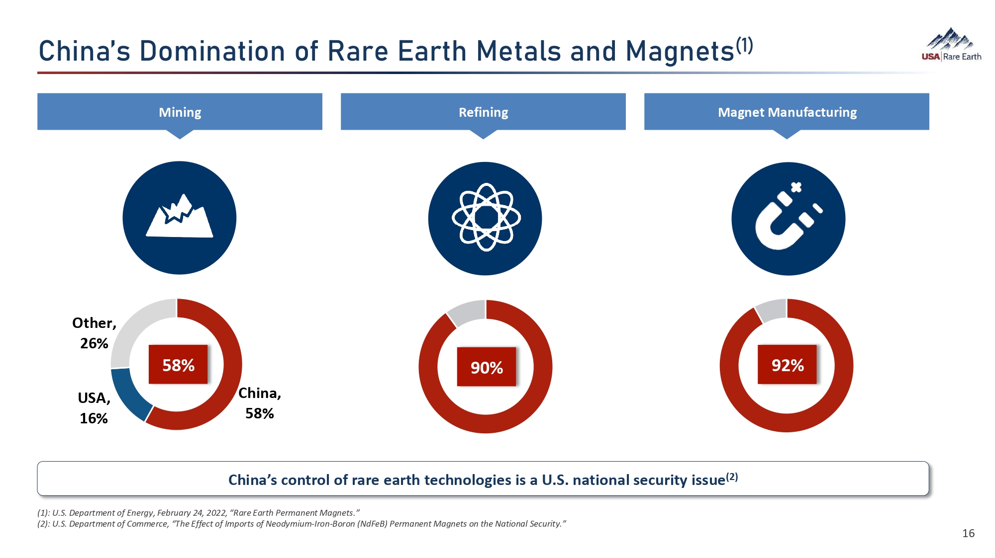 ­¯Â‚ʭÜ  ÈÁ¯Â‚ã¯È  Ȩ  Y‚Ø›  ‚Øã­  B›ã‚¼Ü  ‚•  B‚©Â›ãÜ ʞɷʟ (1) : U.S. Department of Energy, February 24, 2022, “Rare Earth Permanent Magnets.” (2) : U.S. Department of Commerce, “The Effect of Imports of Neodymium - Iron - Boron (NdFeB) Permanent Magnets on the National Security.” China’s control of rare earth technologies is a U.S. national security issue (2) Mining Refining Magnet Manufacturing China, 58% USA, 16% Other, 26% 58% 90% 92% 16