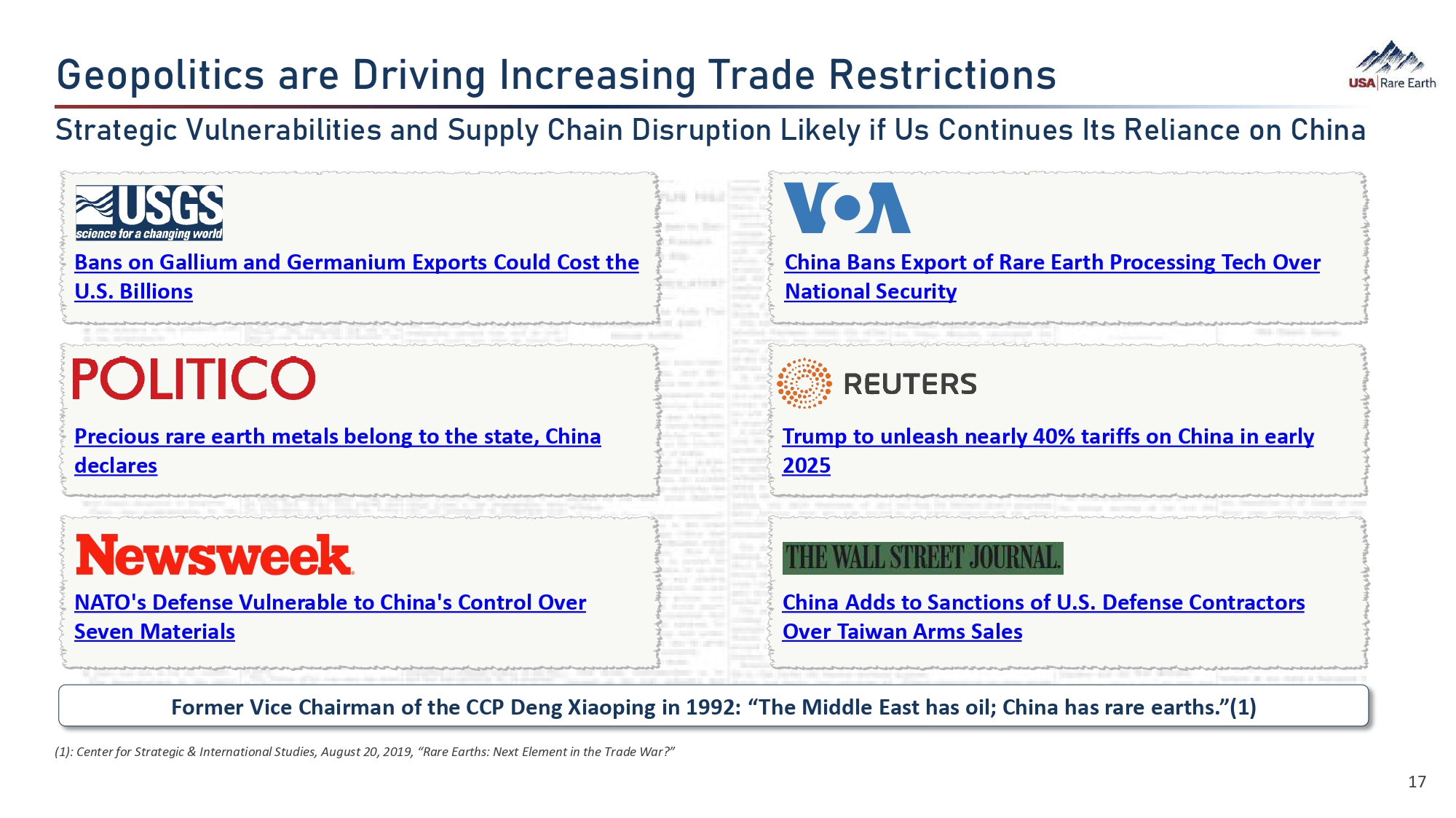 *›ÈÕȼ¯ã¯Ü  ‚Ø›  دó¯Â©  0؛‚ܯ©  dØ‚•›  Y›ÜãØ¯ã¯ÈÂÜ (1): Center for Strategic & International Studies, August 20, 2019, “Rare Earths: Next Element in the Trade War?” ]ãØ‚ã›©¯  tç¼Â›Ø‚ޝ¼¯ã¯›Ü  ‚•  ]çÕÕ¼ö  ­‚¯Â  ¯ÜØçÕã¯È  =¯¹›¼ö  ¯¨  hÜ  ÈÂã¯Âç›Ü  0ãÜ  Y›¼¯‚›  È  ­¯Â‚ Bans on Gallium and Germanium Exports Could Cost the U.S. Billions China Bans Export of Rare Earth Processing Tech Over National Security Precious rare earth metals belong to the state, China declares Trump to unleash nearly 40% tariffs on China in early 2025 NATO's Defense Vulnerable to China's Control Over Seven Materials China Adds to Sanctions of U.S. Defense Contractors Over Taiwan Arms Sales Former Vice Chairman of the CCP Deng Xiaoping in 1992: “The Middle East has oil; China has rare earths.”(1) 17