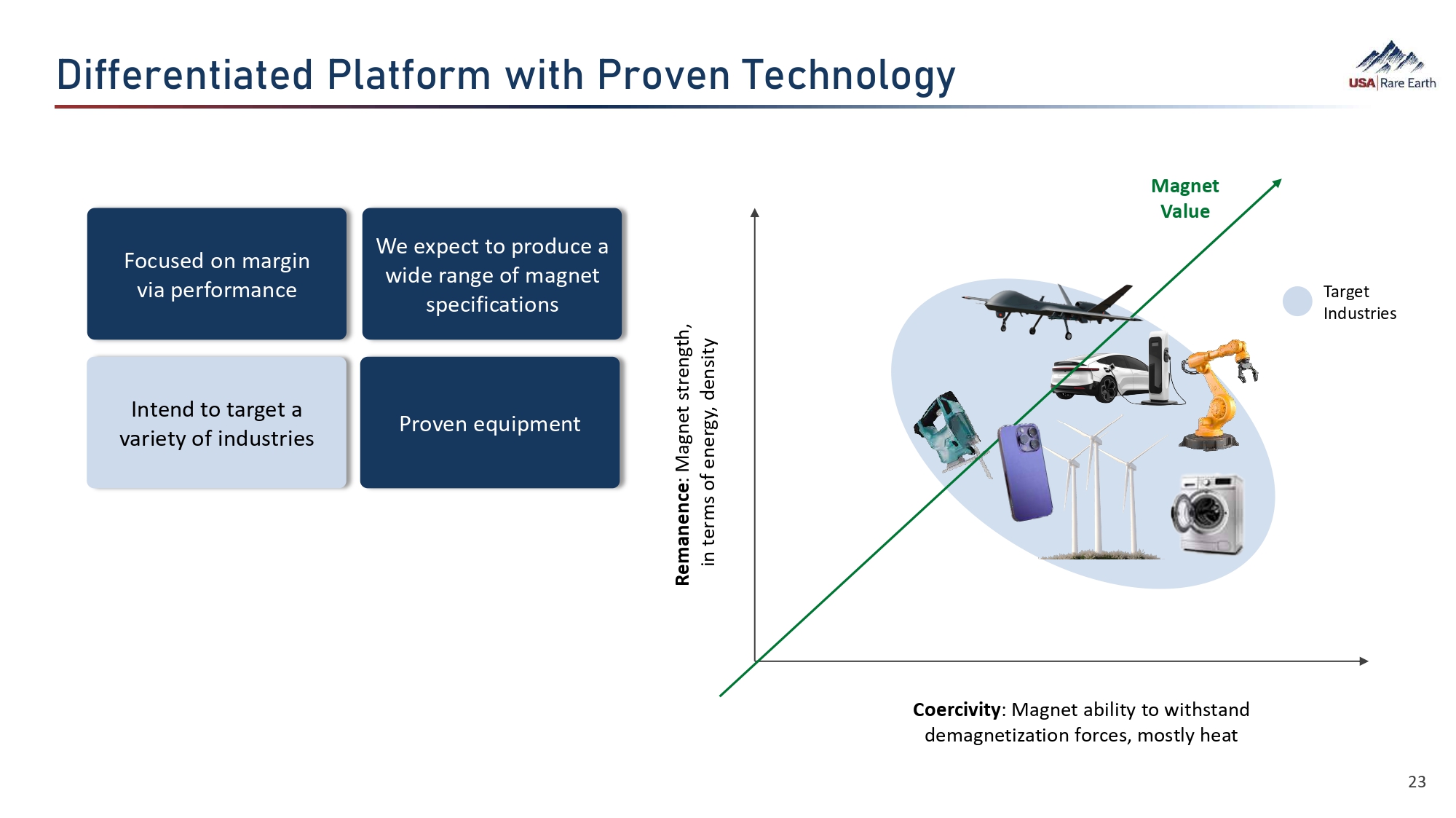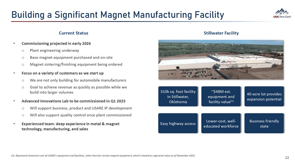篼•¯Â©  ‚  ]¯©Â¯¨¯‚Âã  B‚©Â›ã  B‚Â稂ãçØ¯Â©  (‚¯¼¯ãö Current Status Stillwater Facility 310k sq. foot facility in Stillwater, Oklahoma ~$48M est. equipment and facility value (1) 40 - acre lot provides expansion potential Easy highway access Lower - cost, well - educated workforce Business friendly state (1): Represents historical cost of USARE's equipment and facilities, other than for certain magnet equipment, which is based on appraisal value as of November 2022. • Commissioning projected in early 2026 o Plant engineering underway o Base magnet equipment purchased and on - site o Magnet sintering/finishing equipment being ordered • Focus on a variety of customers as we start up o We are not only building for automobile manufacturers o Goal to achieve revenue as quickly as possible while we build into larger volumes • Advanced Innovations Lab to be commissioned in Q1 2025 o Will support business, product and USARE IP development o Will also support quality control once plant commissioned • Experienced team: deep experience in metal & magnet technology, manufacturing, and sales 22