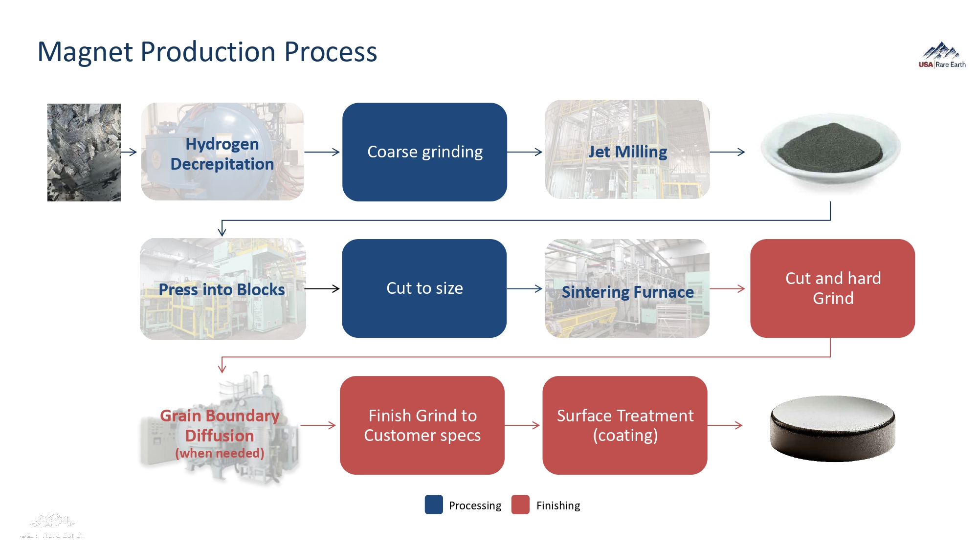 Magnet Production Process Hydrogen Decrepitation Coarse grinding Jet Milling Press into Blocks Cut to size Sintering Furnace Cut and hard Grind Finish Grind to Customer specs Surface Treatment (coating) Processing Finishing Grain Boundary Diffusion (when needed)