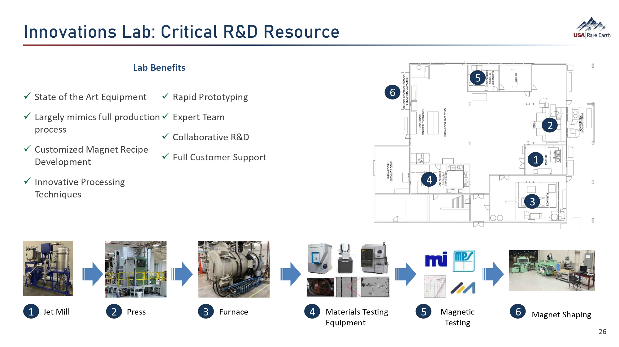 0ÂÂÈó‚ã¯ÈÂÜ  =‚Žʌ  د㯐‚¼  Yˬ  Y›ÜÈçØ› process x Customized Magnet Recipe Development x Innovative Processing Techniques Lab Benefits x State of the Art Equipment x Rapid Prototyping x Largely mimics full production x Expert Team x Collaborative R&D x Full Customer Support 1 2 3 4 5 6 1 2 3 4 5 6 Press Magnet Shaping Magnetic Testing Jet Mill Furnace Materials Testing Equipment 26
