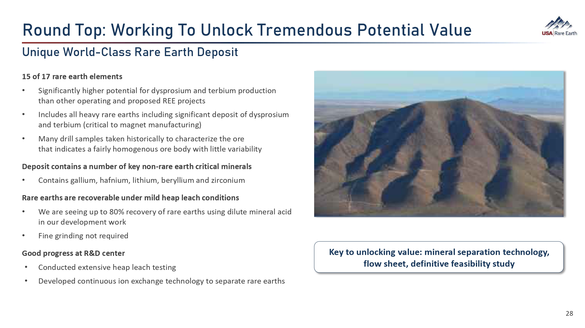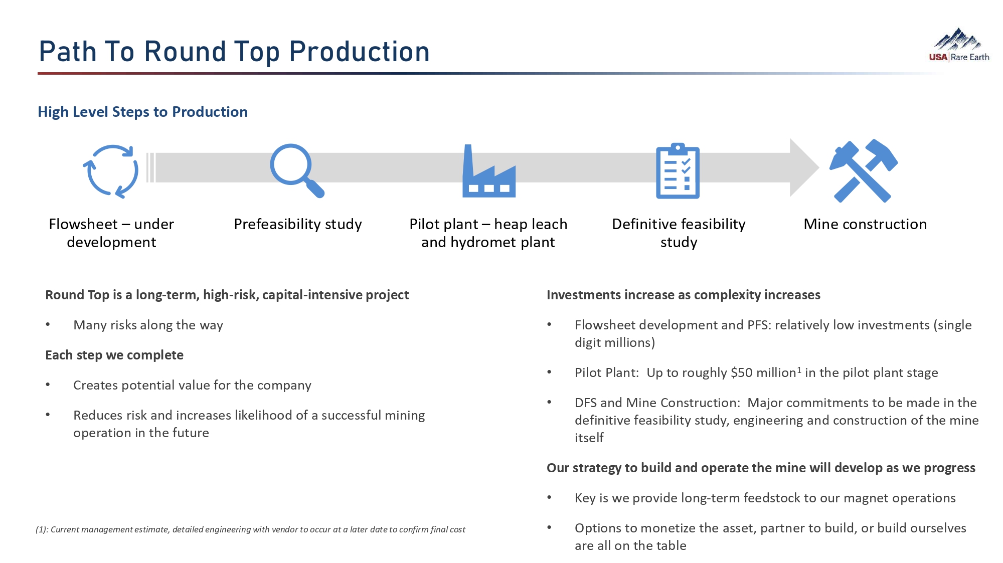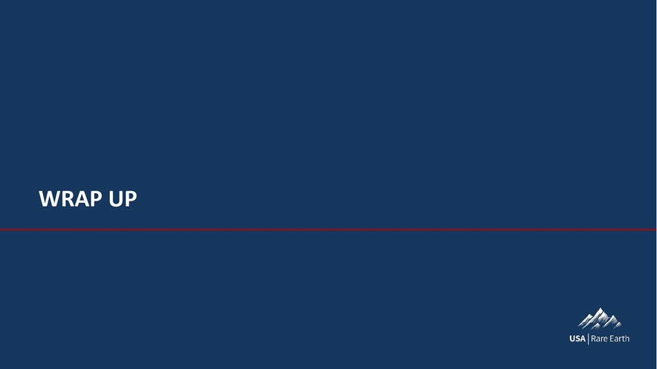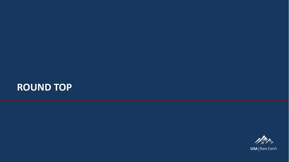 V‚ã­  dÈ  YÈç•  dÈÕ  VØÈ•çã¯È Flowsheet – under development Prefeasibility study Definitive feasibility study Mine construction Pilot plant – heap leach and hydromet plant High Level Steps to Production Round Top is a long - term, high - risk, capital - intensive project • Many risks along the way Each step we complete • Creates potential value for the company • Reduces risk and increases likelihood of a successful mining operation in the future Investments increase as complexity increases • Flowsheet development and PFS: relatively low investments (single digit millions) • Pilot Plant: Up to roughly $50 million 1 in the pilot plant stage • DFS and Mine Construction : Major commitments to be made in the definitive feasibility study, engineering and construction of the mine itself Our strategy to build and operate the mine will develop as we progress • Key is we provide long - term feedstock to our magnet operations • Options to monetize the asset, partner to build, or build ourselves are all on the table (1): Current management estimate, detailed engineering with vendor to occur at a later date to confirm final cost