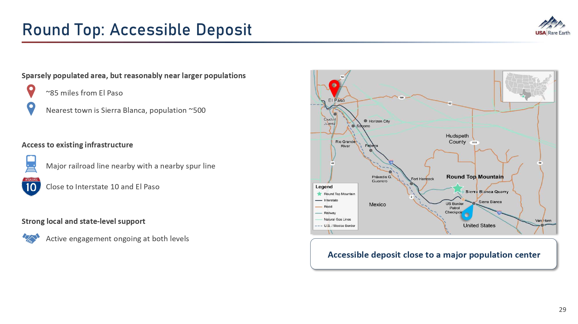 Sparsely populated area, but reasonably near larger populations ~85 miles from El Paso Nearest town is Sierra Blanca, population ~500 Access to existing infrastructure Major railroad line nearby with a nearby spur line Close to Interstate 10 and El Paso Strong local and state - level support Active engagement ongoing at both levels YÈç•  dÈÕʌ  ›Üܝ޼›  ›ÕÈܯã Accessible deposit close to a major population center 29