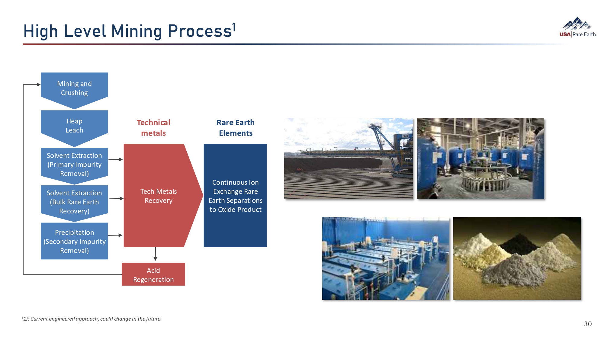 .¯©­  =›ó›¼  B¯Â¯Â©  VØÈ›ÜÜ ɷ (1): Current engineered approach, could change in the future Mining and Crushing Heap Leach Solvent Extraction (Primary Impurity Removal) Solvent Extraction (Bulk Rare Earth Recovery) Precipitation (Secondary Impurity Removal) Tech Metals Recovery Continuous Ion Exchange Rare Earth Separations to Oxide Product Technical metals Rare Earth Elements Acid Regeneration 30