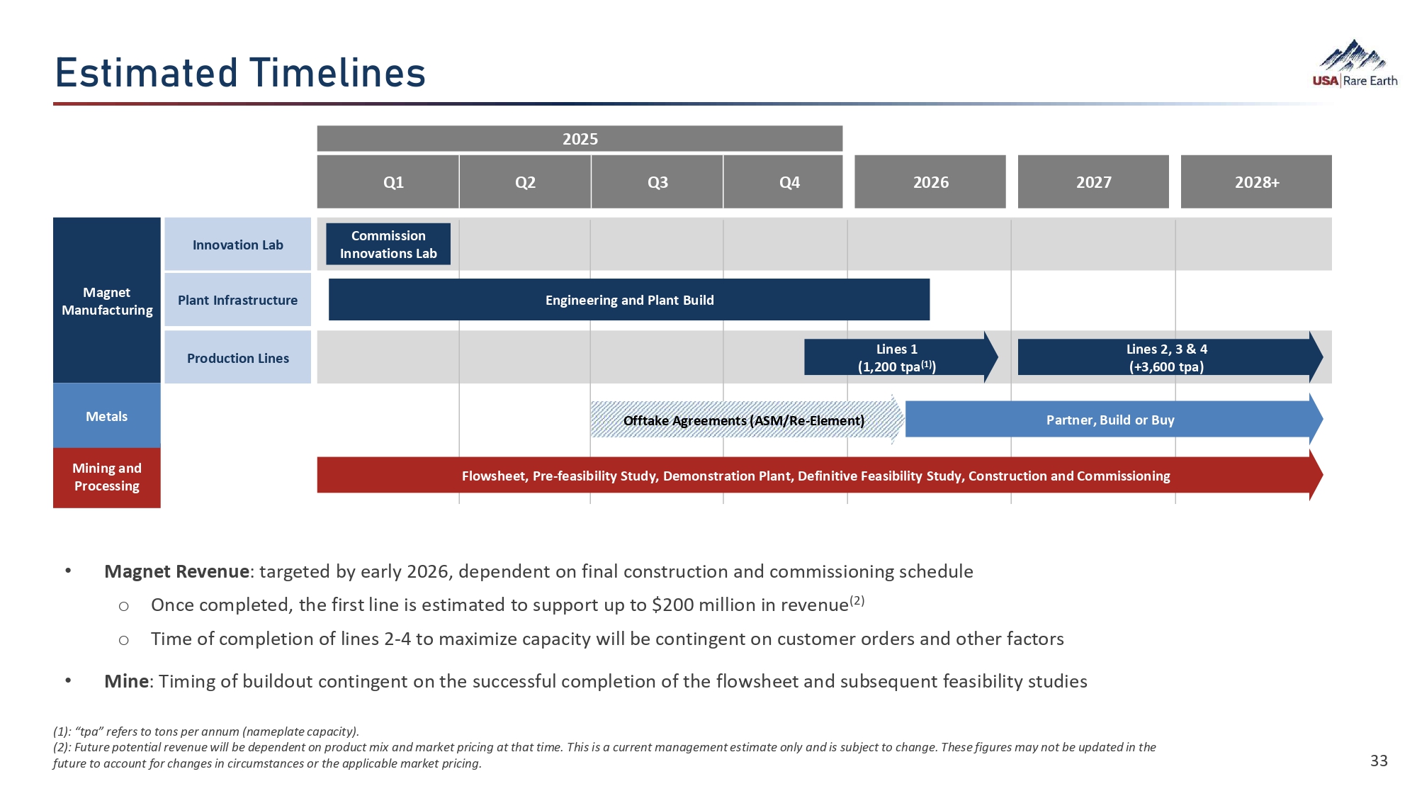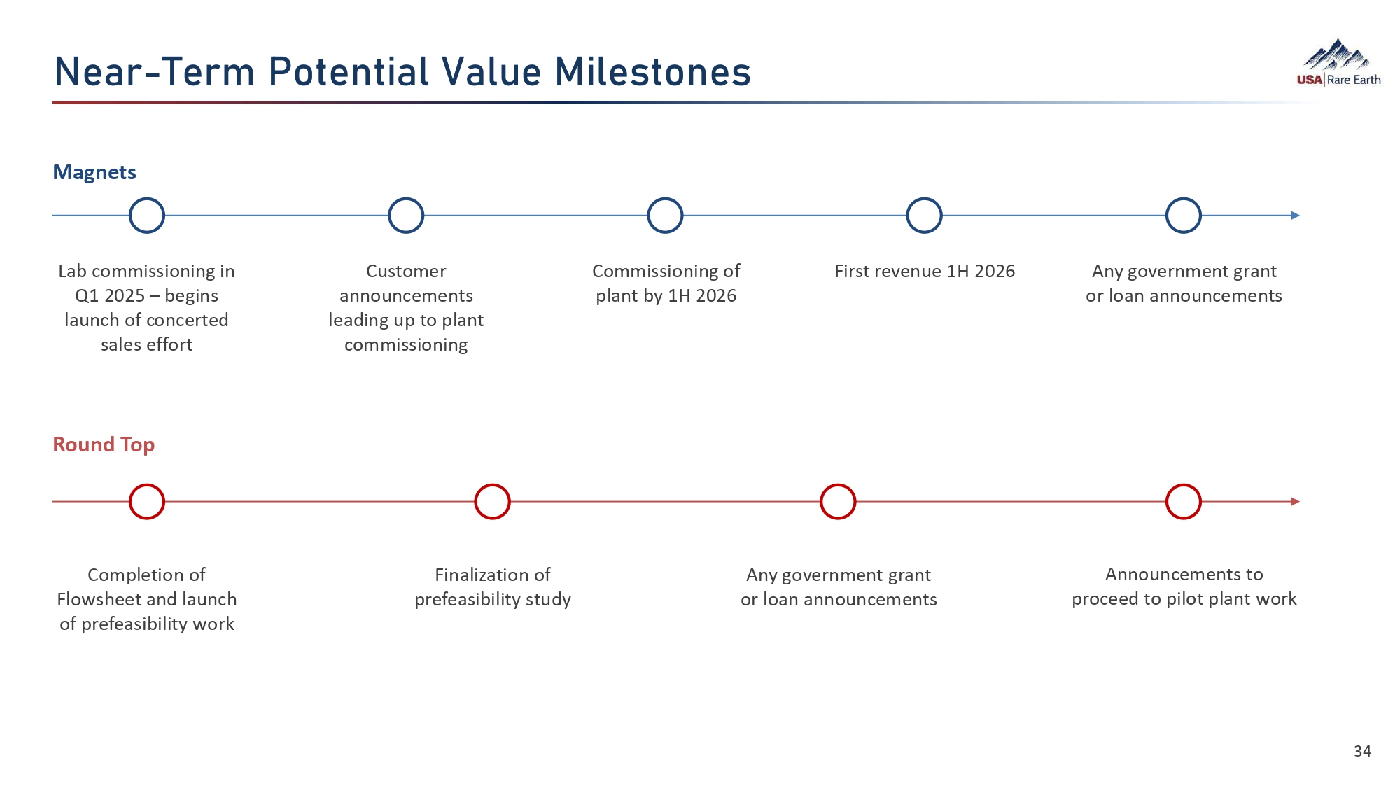Üã¯Á‚㛕  d¯Á›¼¯Â›Ü • Mine : Timing of buildout contingent on the successful completion of the flowsheet and subsequent feasibility studies (1) : “tpa” refers to tons per annum (nameplate capacity). (2) : Future potential revenue will be dependent on product mix and market pricing at that time. This is a current management estimate only and is subject to change. These figures may not be updated in the future to account for changes in circumstances or the applicable market pricing. 33 • Magnet Revenue : targeted by early 2026, dependent on final construction and commissioning schedule o Once completed, the first line is estimated to support up to $200 million in revenue (2) o Time of completion of lines 2 - 4 to maximize capacity will be contingent on customer orders and other factors Magnet Manufacturing Mining and Processing Innovation Lab Plant Infrastructure Production Lines 2025 2026 2027 2028+ Commission Innovations Lab Q1 Q2 Q3 Q4 Engineering and Plant Build Lines 2, 3 & 4 (+3,600 tpa) Lines 1 (1,200 tpa (1) ) Flowsheet, Pre - feasibility Study, Demonstration Plant, Definitive Feasibility Study, Construction and Commissioning Metals Partner, Build or Buy Offtake Agreements (ASM/Re - Element)