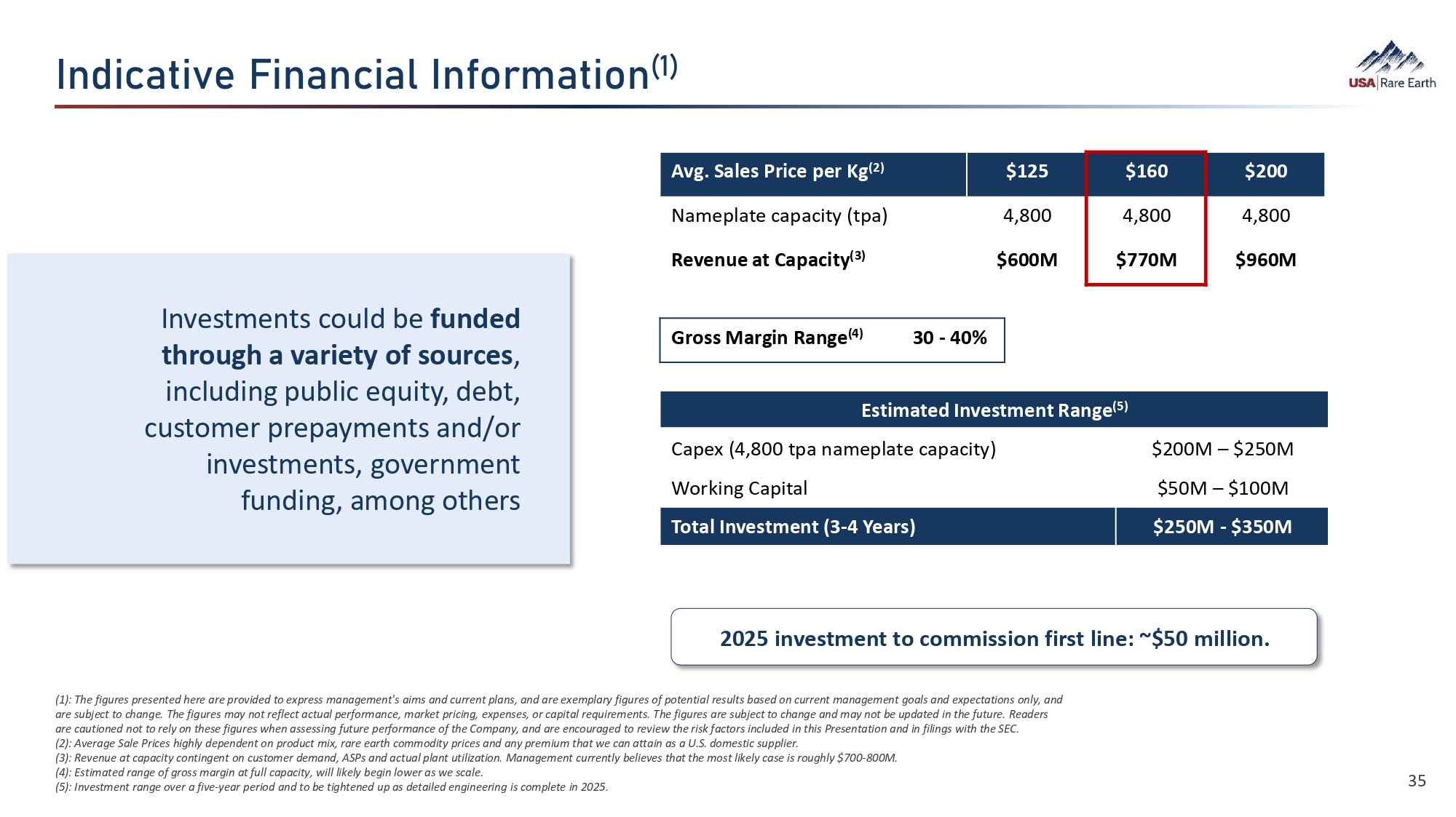 0•¯‚ã¯ó›  (¯Â‚¯‚¼  0Â¨ÈØÁ‚ã¯È ʞɷʟ Investments could be funded through a variety of sources , including public equity, debt, customer prepayments and/or investments, government funding, among others $200 $160 $125 Avg. Sales Price per Kg (2) 4,800 $960M 4,800 $770M Nameplate capacity (tpa) 4,800 Revenue at Capacity (3) $600M Gross Margin Range (4) 30 - 40% Estimated Investment Range (5) $200M – $250M Capex (4,800 tpa nameplate capacity) $50M – $100M Working Capital $250M - $350M Total Investment (3 - 4 Years) 2025 investment to commission first line: ~$50 million. (1) : The figures presented here are provided to express management's aims and current plans, and are exemplary figures of potential results based on current management goals and expectations only, and are subject to change. The figures may not reflect actual performance, market pricing, expenses, or capital requirements. The figures are subject to change and may not be updated in the future. Readers are cautioned not to rely on these figures when assessing future performance of the Company, and are encouraged to review the risk factors included in this Presentation and in filings with the SEC. (2) : Average Sale Prices highly dependent on product mix, rare earth commodity prices and any premium that we can attain as a U.S. domestic supplier. (3) : Revenue at capacity contingent on customer demand, ASPs and actual plant utilization. Management currently believes that the most likely case is roughly $700 - 800M. (4) : Estimated range of gross margin at full capacity, will likely begin lower as we scale. (5) : Investment range over a five - year period and to be tightened up as detailed engineering is complete in 2025. 35