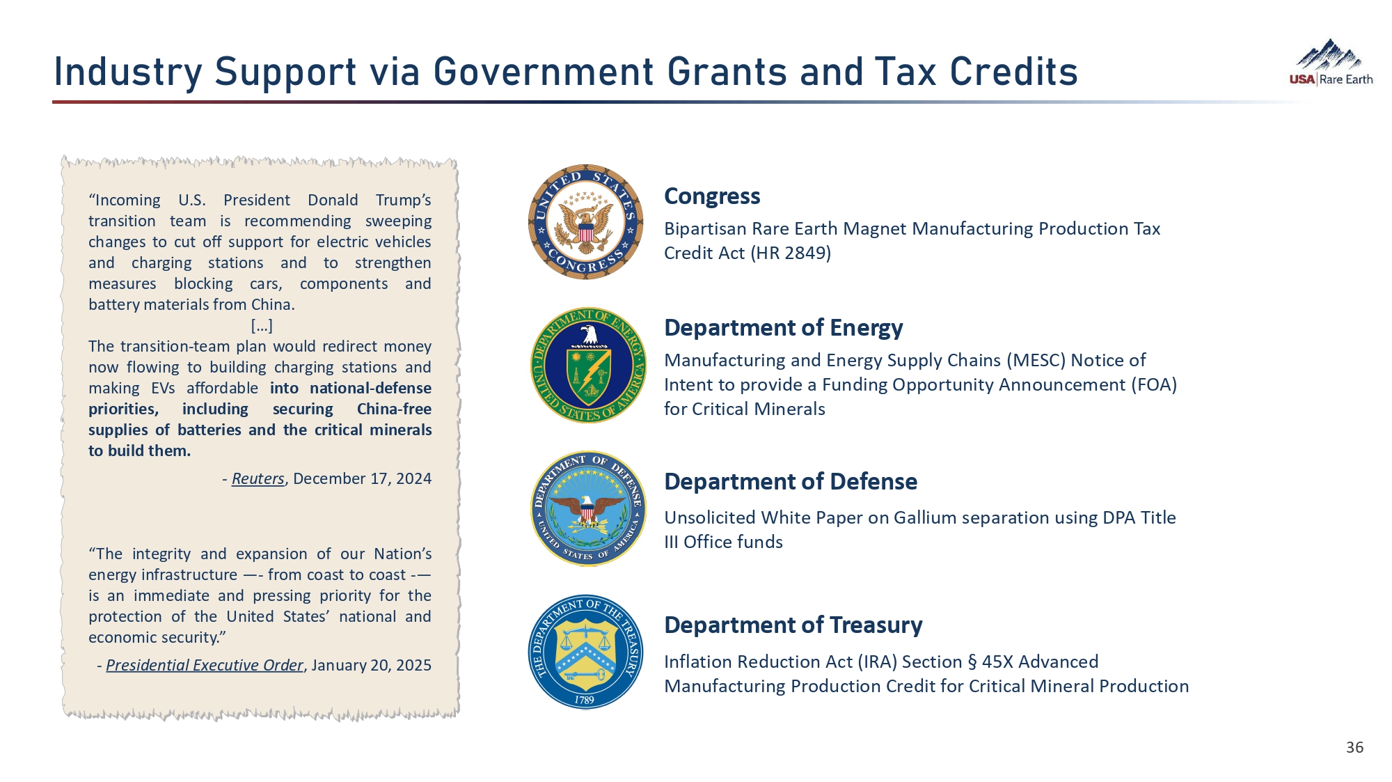 0•çÜãØö  ]çÕÕÈØã  ó¯‚  *Èó›ØÂÁ›Âã  *Ø‚ÂãÜ  ‚•  d‚õ  Ø›•¯ãÜ Congress Bipartisan Rare Earth Magnet Manufacturing Production Tax Credit Act (HR 2849) Department of Energy Manufacturing and Energy Supply Chains (MESC) Notice of Intent to provide a Funding Opportunity Announcement (FOA) for Critical Minerals Department of Defense Unsolicited White Paper on Gallium separation using DPA Title III Office funds Department of Treasury Inflation Reduction Act (IRA) Section Α 45X Advanced Manufacturing Production Credit for Critical Mineral Production “Incoming U.S. President Donald Trump’s transition team is recommending sweeping changes to cut off support for electric vehicles and charging stations and to strengthen measures blocking cars, components and battery materials from China . […] The transition - team plan would redirect money now flowing to building charging stations and making EVs affordable into national - defense priorities, including securing China - free supplies of batteries and the critical minerals to build them . - Reuters , December 17 , 2024 36 “The integrity and expansion of our Nation’s energy infrastructure — - from coast to coast - — is an immediate and pressing priority for the protection of the United States’ national and economic security . ” - Presidential Executive Order , January 20 , 2025