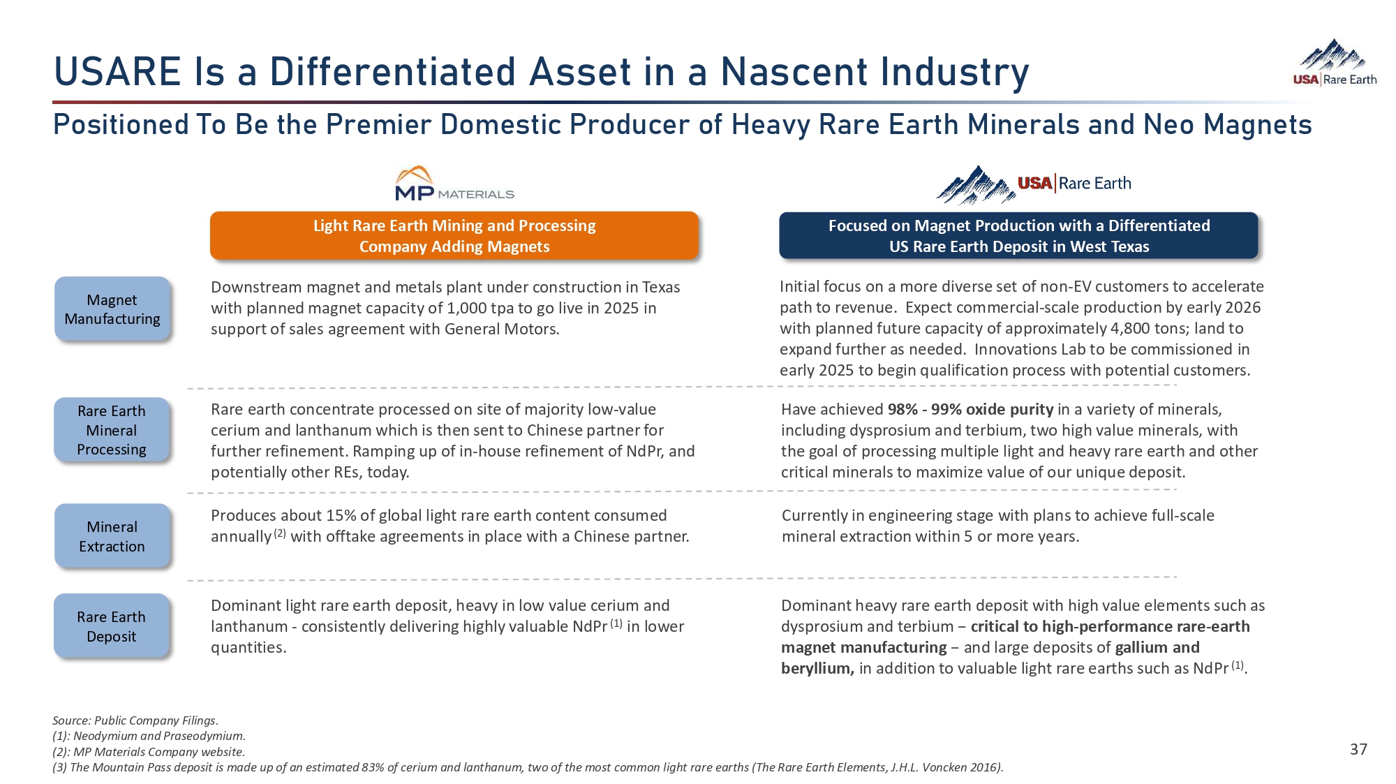 h]Y  0Ü  ‚  ¯¨¨›Ø›Â㯂㛕  ÜÜ›ã  ¯Â  ‚  C‚ܐ›Âã  0•çÜãØö Source: Public Company Filings. (1) : Neodymium and Praseodymium. (2) : MP Materials Company website. (3) The Mountain Pass deposit is made up of an estimated 83% of cerium and lanthanum, two of the most common light rare earths (The Rare Earth Elements, J.H.L. Voncken 2016). 37 VÈܯã¯È›•  dÈ  ›  ã­›  VØ›Á¯›Ø  ÈÁ›Ü㯐  VØÈ•ç›Ø  Ȩ  .›‚óö  Y‚Ø›  ‚Øã­  B¯Â›Ø‚¼Ü  ‚•  C›È  B‚©Â›ãÜ Light Rare Earth Mining and Processing Company Adding Magnets Focused on Magnet Production with a Differentiated US Rare Earth Deposit in West Texas Mineral Extraction Produces about 15% of global light rare earth content consumed annually (2) with offtake agreements in place with a Chinese partner. Currently in engineering stage with plans to achieve full - scale mineral extraction within 5 or more years. Rare Earth Deposit Dominant light rare earth deposit, heavy in low value cerium and lanthanum - consistently delivering highly valuable NdPr (1) in lower quantities. Dominant heavy rare earth deposit with high value elements such as dysprosium and terbium − critical to high - performance rare - earth magnet manufacturing − and large deposits of gallium and beryllium, in addition to valuable light rare earths such as NdPr (1) . Rare Earth Mineral Processing Rare earth concentrate processed on site of majority low - value cerium and lanthanum which is then sent to Chinese partner for further refinement. Ramping up of in - house refinement of NdPr, and potentially other REs, today. Have achieved 98% - 99% oxide purity in a variety of minerals, including dysprosium and terbium, two high value minerals, with the goal of processing multiple light and heavy rare earth and other critical minerals to maximize value of our unique deposit. Downstream magnet and metals plant under construction in Texas with planned magnet capacity of 1,000 tpa to go live in 2025 in support of sales agreement with General Motors. Initial focus on a more diverse set of non - EV customers to accelerate path to revenue. Expect commercial - scale production by early 2026 with planned future capacity of approximately 4,800 tons; land to expand further as needed. Innovations Lab to be commissioned in early 2025 to begin qualification process with potential customers. Magnet Manufacturing