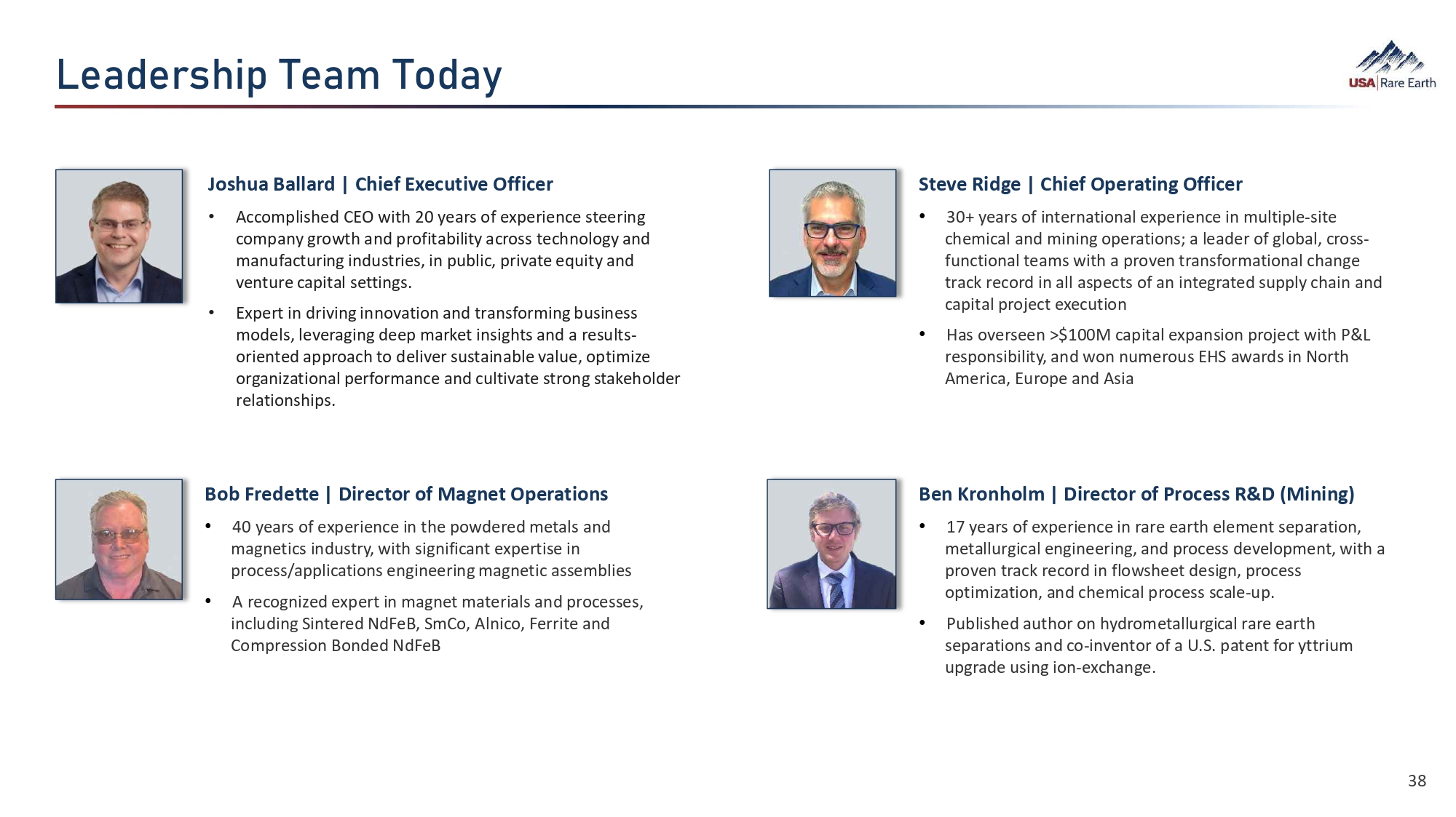 =›‚•›ØÜ­¯Õ  d›‚Á  dÈ•‚ö Bob Fredette | Director of Magnet Operations • 40 years of experience in the powdered metals and magnetics industry, with significant expertise in process/applications engineering magnetic assemblies • A recognized expert in magnet materials and processes, including Sintered NdFeB, SmCo, Alnico, Ferrite and Compression Bonded NdFeB Steve Ridge | Chief Operating Officer • 30+ years of international experience in multiple - site chemical and mining operations; a leader of global, cross - functional teams with a proven transformational change track record in all aspects of an integrated supply chain and capital project execution • Has overseen >$100M capital expansion project with P&L responsibility, and won numerous EHS awards in North America, Europe and Asia Joshua Ballard | Chief Executive Officer • Accomplished CEO with 20 years of experience steering company growth and profitability across technology and manufacturing industries, in public, private equity and venture capital settings. • Expert in driving innovation and transforming business models, leveraging deep market insights and a results - oriented approach to deliver sustainable value, optimize organizational performance and cultivate strong stakeholder relationships. Ben Kronholm | Director of Process R&D (Mining) • 17 years of experience in rare earth element separation, metallurgical engineering, and process development, with a proven track record in flowsheet design, process optimization, and chemical process scale - up. • Published author on hydrometallurgical rare earth separations and co - inventor of a U.S. patent for yttrium upgrade using ion - exchange. 38