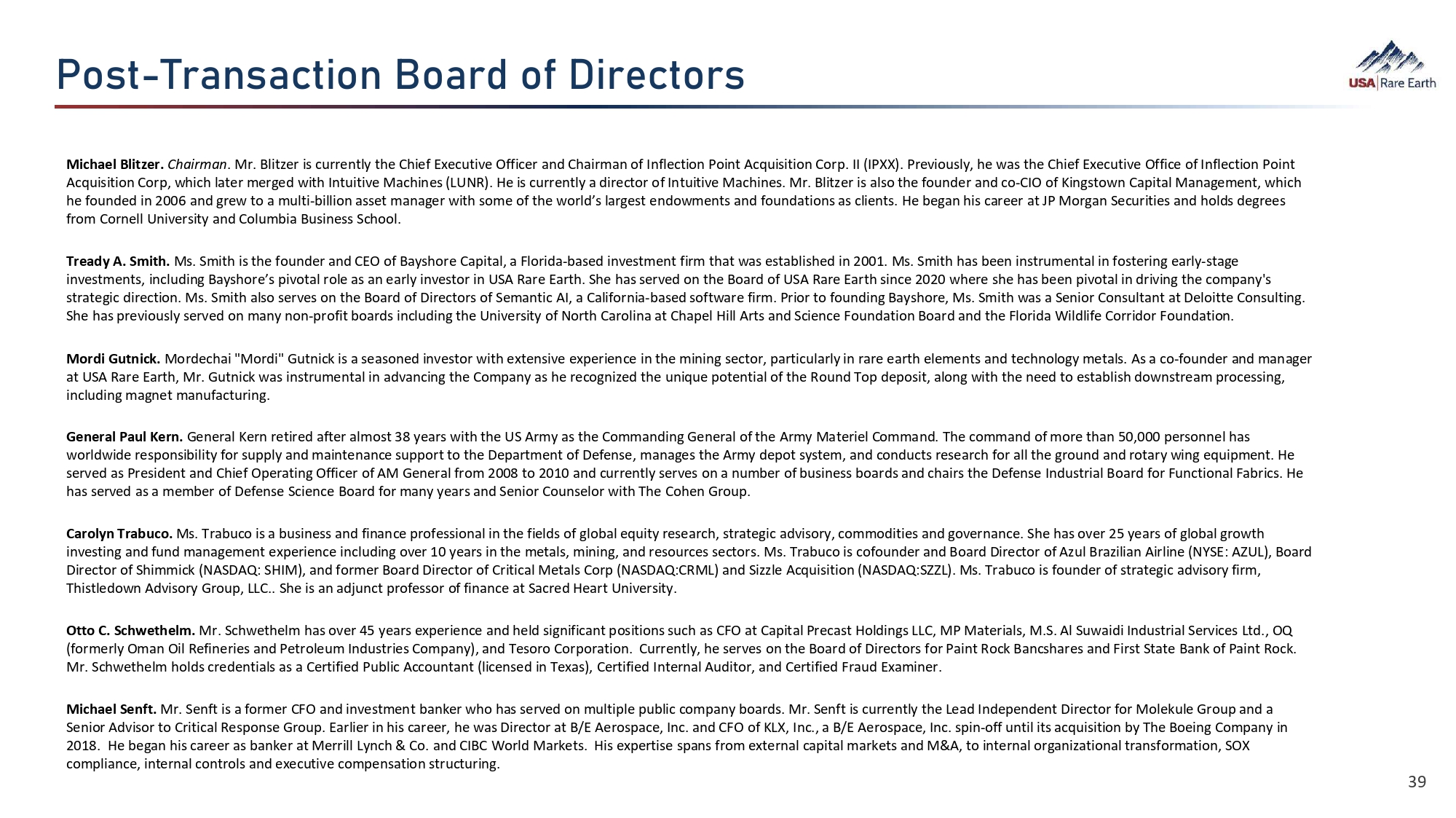 VÈÜã ʣ dØ‚ÂÜ‚ã¯È  Ȃؕ  Ȩ  ¯Ø›ãÈØÜ 39 Michael Blitzer. Chairman . Mr. Blitzer is currently the Chief Executive Officer and Chairman of Inflection Point Acquisition Corp. II (IPXX). Previously, he was the Chief Executive Office of Inflection Point Acquisition Corp, which later merged with Intuitive Machines (LUNR). He is currently a director of Intuitive Machines. Mr. Blitzer is also the founder and co - CIO of Kingstown Capital Management, which he founded in 2006 and grew to a multi - billion asset manager with some of the world’s largest endowments and foundations as clients. He began his career at JP Morgan Securities and holds degrees from Cornell University and Columbia Business School. Tready A. Smith. Ms. Smith is the founder and CEO of Bayshore Capital, a Florida - based investment firm that was established in 2001. Ms. Smith has been instrumental in fostering early - stage investments, including Bayshore’s pivotal role as an early investor in USA Rare Earth. She has served on the Board of USA Rare Earth since 2020 where she has been pivotal in driving the company's strategic direction. Ms. Smith also serves on the Board of Directors of Semantic AI, a California - based software firm. Prior to founding Bayshore, Ms. Smith was a Senior Consultant at Deloitte Consulting. She has previously served on many non - profit boards including the University of North Carolina at Chapel Hill Arts and Science Foundation Board and the Florida Wildlife Corridor Foundation. Mordi Gutnick. Mordechai "Mordi" Gutnick is a seasoned investor with extensive experience in the mining sector, particularly in rare earth elements and technology metals. As a co - founder and manager at USA Rare Earth, Mr. Gutnick was instrumental in advancing the Company as he recognized the unique potential of the Round Top deposit, along with the need to establish downstream processing, including magnet manufacturing. General Paul Kern. General Kern retired after almost 38 years with the US Army as the Commanding General of the Army Materiel Command. The command of more than 50,000 personnel has worldwide responsibility for supply and maintenance support to the Department of Defense, manages the Army depot system, and conducts research for all the ground and rotary wing equipment. He served as President and Chief Operating Officer of AM General from 2008 to 2010 and currently serves on a number of business boards and chairs the Defense Industrial Board for Functional Fabrics. He has served as a member of Defense Science Board for many years and Senior Counselor with The Cohen Group. Carolyn Trabuco. Ms. Trabuco is a business and finance professional in the fields of global equity research, strategic advisory, commodities and governance. She has over 25 years of global growth investing and fund management experience including over 10 years in the metals, mining, and resources sectors. Ms. Trabuco is cofounder and Board Director of Azul Brazilian Airline (NYSE: AZUL), Board Director of Shimmick (NASDAQ: SHIM), and former Board Director of Critical Metals Corp (NASDAQ:CRML) and Sizzle Acquisition (NASDAQ:SZZL). Ms. Trabuco is founder of strategic advisory firm, Thistledown Advisory Group, LLC.. She is an adjunct professor of finance at Sacred Heart University. Otto C . Schwethelm . Mr . Schwethelm has over 45 years experience and held significant positions such as CFO at Capital Precast Holdings LLC, MP Materials, M . S . Al Suwaidi Industrial Services Ltd . , OQ (formerly Oman Oil Refineries and Petroleum Industries Company), and Tesoro Corporation . Currently, he serves on the Board of Directors for Paint Rock Bancshares and First State Bank of Paint Rock . Mr . Schwethelm holds credentials as a Certified Public Accountant (licensed in Texas), Certified Internal Auditor, and Certified Fraud Examiner . Michael Senft. Mr. Senft is a former CFO and investment banker who has served on multiple public company boards. Mr. Senft is currently the Lead Independent Director for Molekule Group and a Senior Advisor to Critical Response Group. Earlier in his career, he was Director at B/E Aerospace, Inc. and CFO of KLX, Inc., a B/E Aerospace, Inc. spin - off until its acquisition by The Boeing Company in 2018. He began his career as banker at Merrill Lynch & Co. and CIBC World Markets. His expertise spans from external capital markets and M&A, to internal organizational transformation, SOX compliance, internal controls and executive compensation structuring.