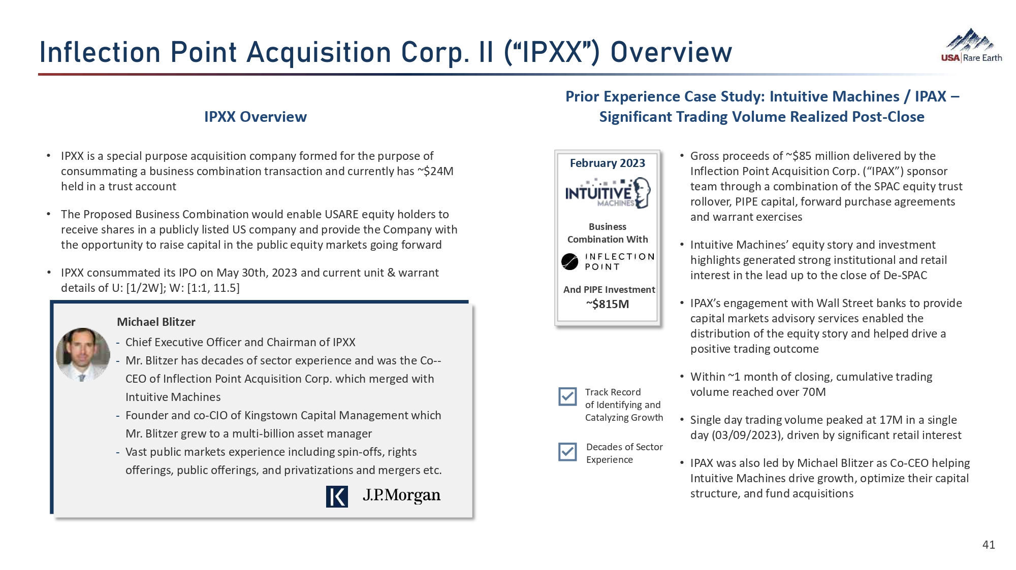 • IPXX is a special purpose acquisition company formed for the purpose of consummating a business combination transaction and currently has ~$24M held in a trust account • The Proposed Business Combination would enable USARE equity holders to receive shares in a publicly listed US company and provide the Company with the opportunity to raise capital in the public equity markets going forward • IPXX consummated its IPO on May 30th, 2023 and current unit & warrant details of U: [1/2W]; W: [1:1, 11.5] Decades of Sector Experience Track Record of Identifying and Catalyzing Growth Michael Blitzer - Chief Executive Officer and Chairman of IPXX - Mr. Blitzer has decades of sector experience and was the Co - - CEO of Inflection Point Acquisition Corp. which merged with Intuitive Machines - Founder and co - CIO of Kingstown Capital Management which Mr. Blitzer grew to a multi - billion asset manager - Vast public markets experience including spin - offs, rights offerings, public offerings, and privatizations and mergers etc. February 2023 Business Combination With 41 And PIPE Investment ~$815M • Gross proceeds of ~$85 million delivered by the Inflection Point Acquisition Corp. (“IPAX”) sponsor team through a combination of the SPAC equity trust rollover, PIPE capital, forward purchase agreements and warrant exercises • Intuitive Machines’ equity story and investment highlights generated strong institutional and retail interest in the lead up to the close of De - SPAC • IPAX’s engagement with Wall Street banks to provide capital markets advisory services enabled the distribution of the equity story and helped drive a positive trading outcome • Within ~1 month of closing, cumulative trading volume reached over 70M • Single day trading volume peaked at 17M in a single day (03/09/2023), driven by significant retail interest • IPAX was also led by Michael Blitzer as Co - CEO helping Intuitive Machines drive growth, optimize their capital structure, and fund acquisitions 0¨¼›ã¯È  VȯÂã  ×ç¯Ü¯ã¯È  ÈØÕʒ  00  ʞʪ0Vxxʫʟ  Ió›Øó¯›ô Prior Experience Case Study: Intuitive Machines / IPAX – IPXX Overview Significant Trading Volume Realized Post - Close