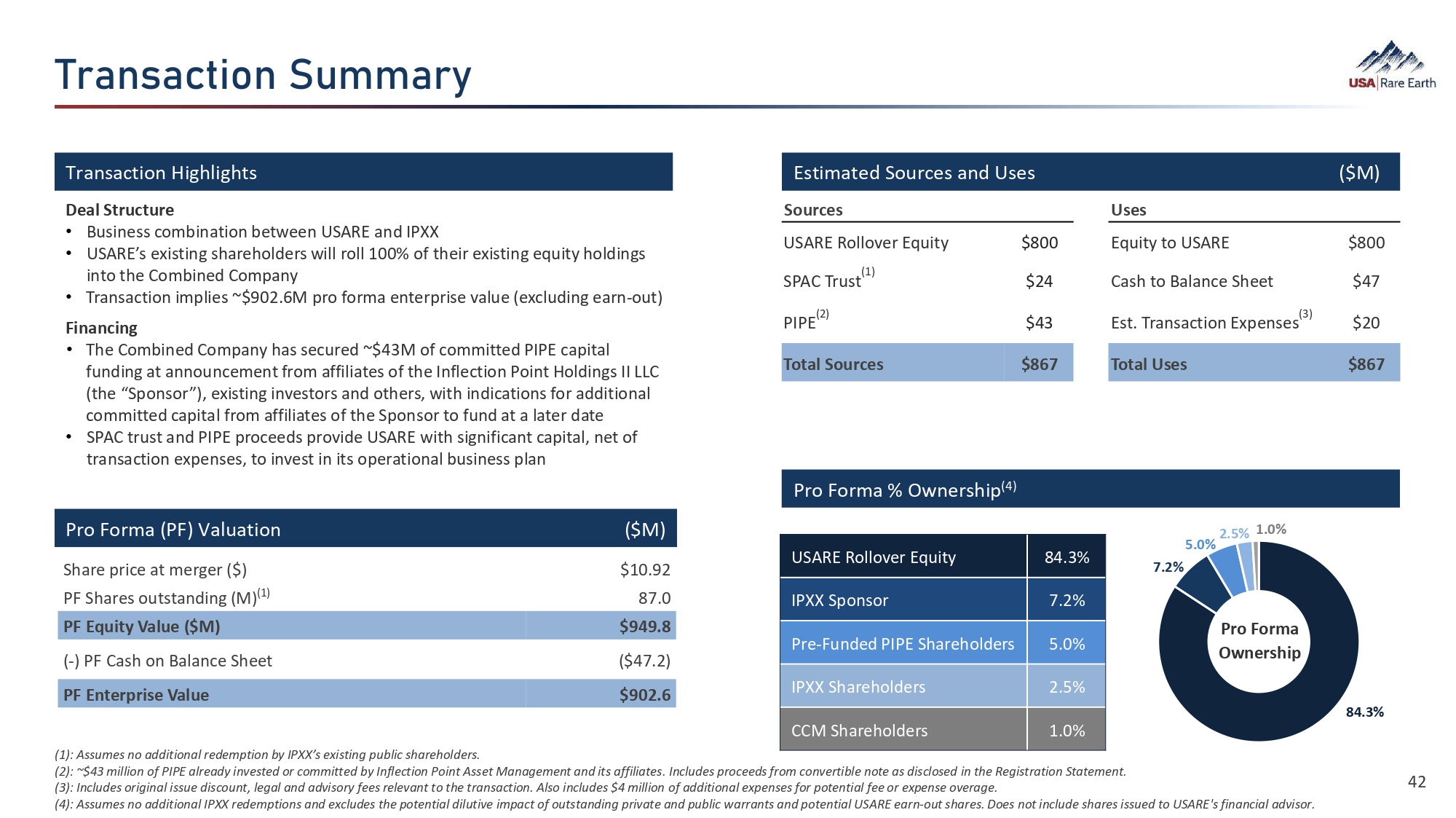 dØ‚ÂÜ‚ã¯È  ]çÁÁ‚Øö Transaction Highlights Estimated Sources and Uses ($M) Deal Structure • Business combination between USARE and IPXX • USARE’s existing shareholders will roll 100% of their existing equity holdings into the Combined Company • Transaction implies ~$902.6M pro forma enterprise value (excluding earn - out) Financing • The Combined Company has secured ~$43M of committed PIPE capital funding at announcement from affiliates of the Inflection Point Holdings II LLC (the “Sponsor”), existing investors and others, with indications for additional committed capital from affiliates of the Sponsor to fund at a later date • SPAC trust and PIPE proceeds provide USARE with significant capital, net of transaction expenses, to invest in its operational business plan Pro Forma % Ownership (4) Share price at merger ($) PF Shares outstanding (M) (1) $10.92 87.0 PF Equity Value ($M) $949.8 ( - ) PF Cash on Balance Sheet ($47.2) PF Enterprise Value $902.6 Pro Forma (PF) Valuation ($M) 84.3% USARE Rollover Equity 7.2% IPXX Sponsor 5.0% Pre - Funded PIPE Shareholders 2.5% IPXX Shareholders 1.0% CCM Shareholders 42 (1): Assumes no additional redemption by IPXX’s existing public shareholders. (2) : ~$43 million of PIPE already invested or committed by Inflection Point Asset Management and its affiliates. Includes proceeds from convertible note as disclosed in the Registration Statement. (3) : Includes original issue discount, legal and advisory fees relevant to the transaction. Also includes $4 million of additional expenses for potential fee or expense overage. (4) : Assumes no additional IPXX redemptions and excludes the potential dilutive impact of outstanding private and public warrants and potential USARE earn - out shares. Does not include shares issued to USARE's financial advisor. Uses Sources $800 Equity to USARE $800 USARE Rollover Equity $47 Cash to Balance Sheet $24 (1) SPAC Trust $20 (3) Est. Transaction Expenses $43 (2) PIPE $867 Total Uses $867 Total Sources Pro Forma Ownership 84.3% 7.2% 5.0% 2.5% 1.0%