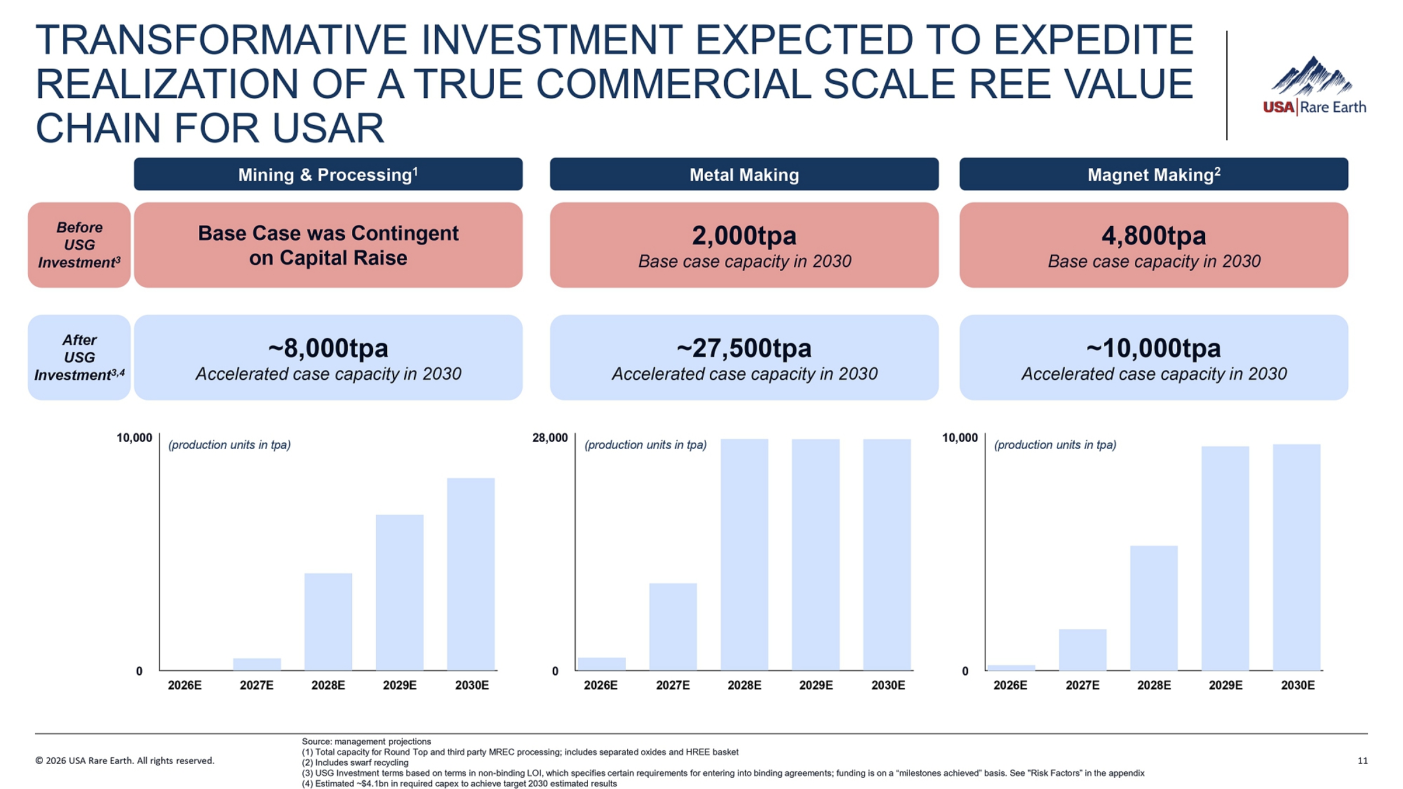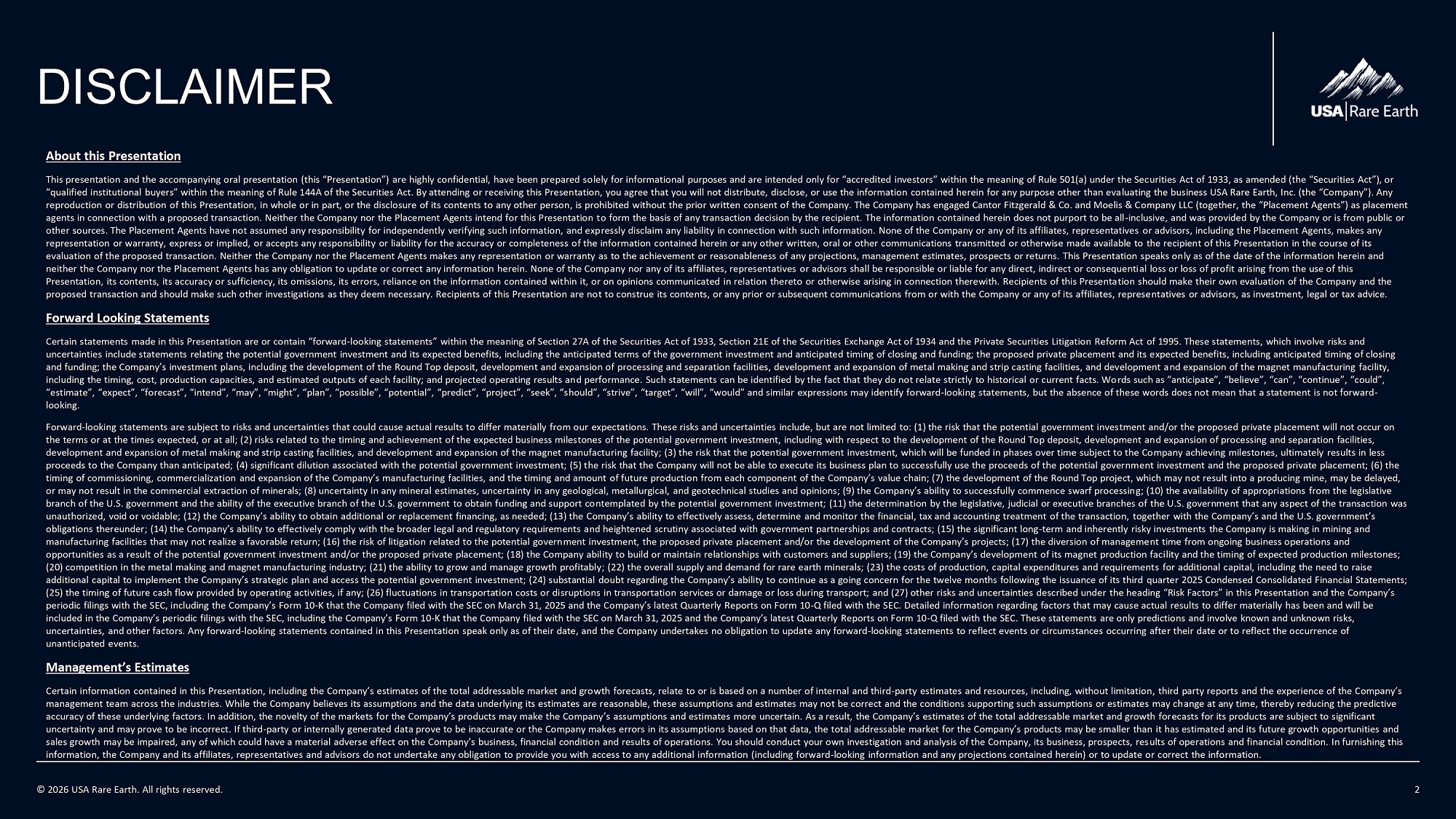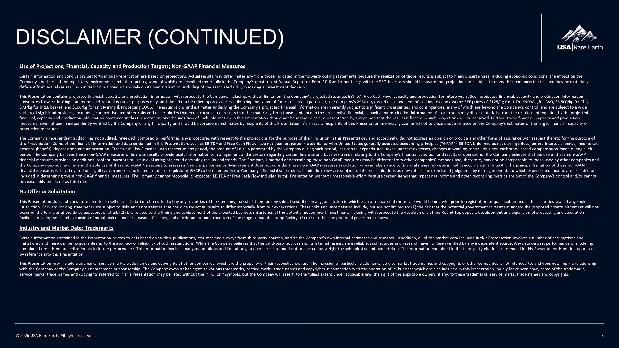 2 © 2026 USA Rare Earth. All rights reserved. DISCLAIMER About this Presentation This presentation and the accompanying oral presentation (this “Presentation”) are highly confidential, have been prepared so lel y for informational purposes and are intended only for “accredited investors” within the meaning of Rule 501(a) under the Sec uri ties Act of 1933, as amended (the “Securities Act”), or “qualified institutional buyers” within the meaning of Rule 144A of the Securities Act. By attending or receiving this Presen tat ion, you agree that you will not distribute, disclose, or use the information contained herein for any purpose other than eva lua ting the business USA Rare Earth, Inc. (the “Company”). Any reproduction or distribution of this Presentation, in whole or in part, or the disclosure of its contents to any other person , i s prohibited without the prior written consent of the Company. The Company has engaged Cantor Fitzgerald & Co. and Moelis & C omp any LLC (together, the “Placement Agents”) as placement agents in connection with a proposed transaction. Neither the Company nor the Placement Agents intend for this Presentation t o f orm the basis of any transaction decision by the recipient. The information contained herein does not purport to be all - inclusiv e, and was provided by the Company or is from public or other sources. The Placement Agents have not assumed any responsibility for independently verifying such information, and exp res sly disclaim any liability in connection with such information. None of the Company or any of its affiliates, representatives or advisors, including the Placement Agents, makes any representation or warranty, express or implied, or accepts any responsibility or liability for the accuracy or completeness o f t he information contained herein or any other written, oral or other communications transmitted or otherwise made available to th e recipient of this Presentation in the course of its evaluation of the proposed transaction. Neither the Company nor the Placement Agents makes any representation or warranty as to the achievement or reasonableness of any projections, management estimates, prospects or returns. This Presentation speaks on ly as of the date of the information herein and neither the Company nor the Placement Agents has any obligation to update or correct any information herein. None of the Comp any nor any of its affiliates, representatives or advisors shall be responsible or liable for any direct, indirect or consequenti al loss or loss of profit arising from the use of this Presentation, its contents, its accuracy or sufficiency, its omissions, its errors, reliance on the information contained wit hin it, or on opinions communicated in relation thereto or otherwise arising in connection therewith. Recipients of this Presenta ti on should make their own evaluation of the Company and the proposed transaction and should make such other investigations as they deem necessary. Recipients of this Presentation are no t t o construe its contents, or any prior or subsequent communications from or with the Company or any of its affiliates, represe nta tives or advisors, as investment, legal or tax advice. Forward Looking Statements Certain statements made in this Presentation are or contain “forward - looking statements” within the meaning of Section 27A of th e Securities Act of 1933, Section 21E of the Securities Exchange Act of 1934 and the Private Securities Litigation Reform Act of 1995. These statements, which involve risks and uncertainties include statements relating the potential government investment and its expected benefits, including the antici pat ed terms of the government investment and anticipated timing of closing and funding; the proposed private placement and its e xpe cted benefits, including anticipated timing of closing and funding; the Company’s investment plans, including the development of the Round Top deposit, development and expansion of pr ocessing and separation facilities, development and expansion of metal making and strip casting facilities, and development a nd expansion of the magnet manufacturing facility, including the timing, cost, production capacities, and estimated outputs of each facility; and projected operating results an d p erformance. Such statements can be identified by the fact that they do not relate strictly to historical or current facts. Wo rds such as “anticipate”, “believe”, “can”, “continue”, “could”, “estimate”, “expect”, “forecast”, “intend”, “may”, “might”, “plan”, “possible”, “potential”, “predict”, “project”, “seek”, “s hou ld”, “strive”, “target”, “will”, “would” and similar expressions may identify forward - looking statements, but the absence of the se words does not mean that a statement is not forward - looking. Forward - looking statements are subject to risks and uncertainties that could cause actual results to differ materially from our expectations. These risks and uncertainties include, but are not limited to: (1) the risk that the potential government inves tme nt and/or the proposed private placement will not occur on the terms or at the times expected, or at all; (2) risks related to the timing and achievement of the expected business miles ton es of the potential government investment, including with respect to the development of the Round Top deposit, development an d e xpansion of processing and separation facilities, development and expansion of metal making and strip casting facilities, and development and expansion of the magnet manufactu rin g facility; (3) the risk that the potential government investment, which will be funded in phases over time subject to the Co mpa ny achieving milestones, ultimately results in less proceeds to the Company than anticipated; (4) significant dilution associated with the potential government investme