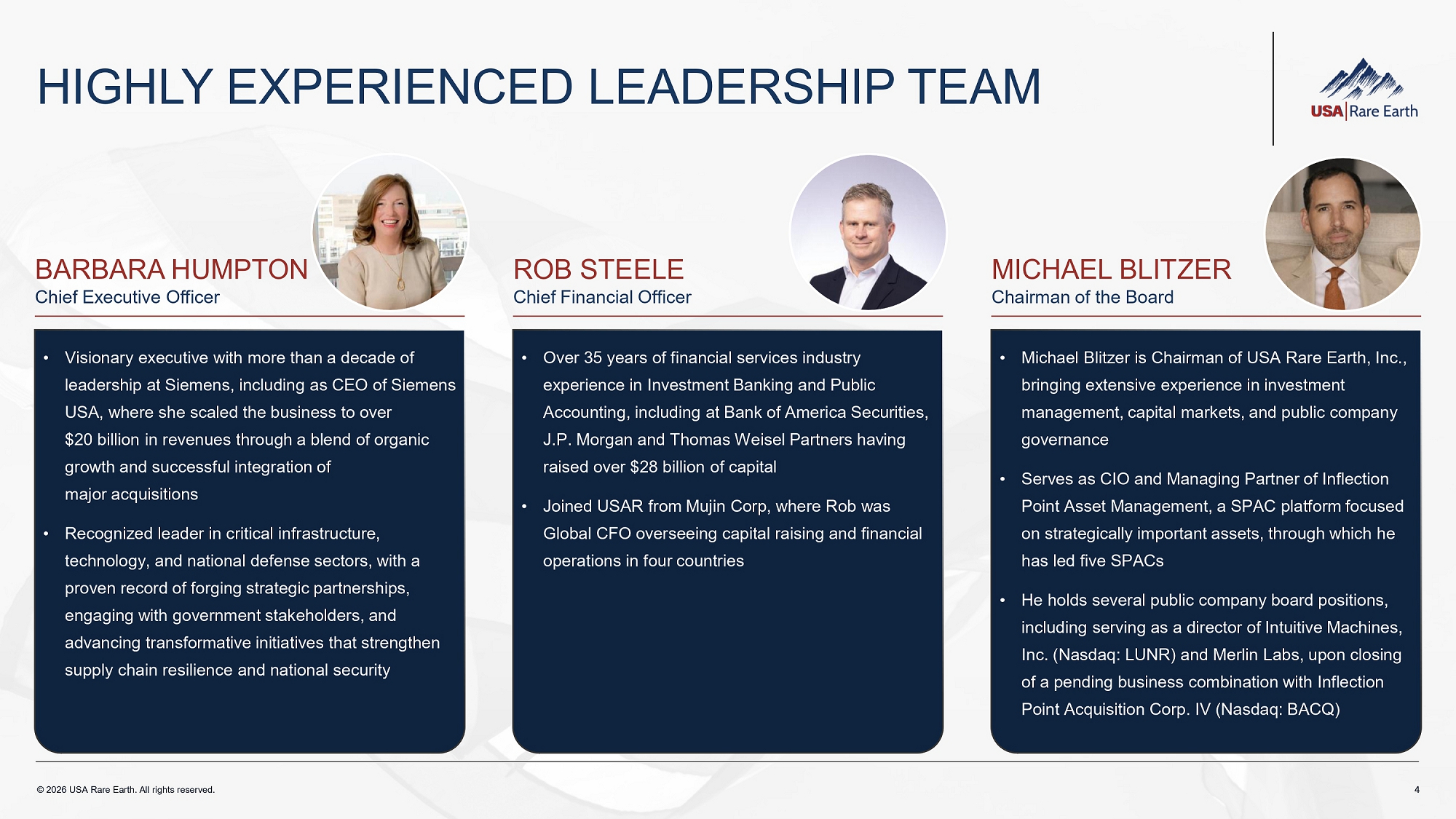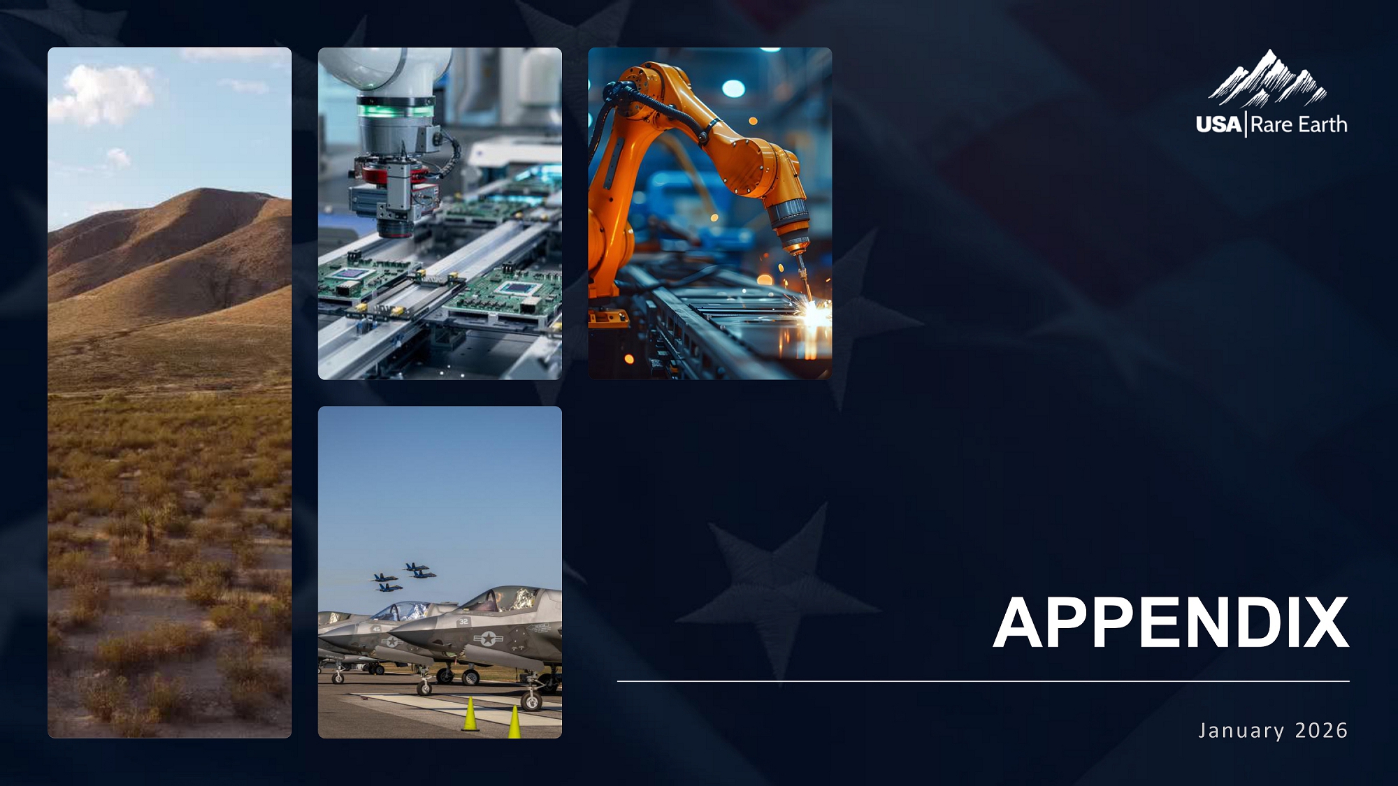 3 © 2026 USA Rare Earth. All rights reserved. DISCLAIMER (CONTINUED) Use of Projections; Financial, Capacity and Production Targets; Non - GAAP Financial Measures Certain information and conclusions set forth in this Presentation are based on projections. Actual results may differ materi all y from those indicated in the forward - looking statements because the realization of those results is subject to many uncertainti es, including economic conditions, the impact on the Company’s business of the regulatory environment and other factors, some of which are described more fully in the Company’s m ost recent Annual Report on Form 10 - K and other filings with the SEC. Investors should be aware that projections are subject to man y risks and uncertainties and may be materially different from actual results. Each investor must conduct and rely on its own evaluation, including of the associated risks, in making an investment decision This Presentation contains projected financial, capacity and production information with respect to the Company, including, w ith out limitation, the Company’s projected revenue, EBITDA, Free Cash Flow, capacity and production for future years. Such proje cte d financial, capacity and production information constitutes forward - looking statements and is for illustrative purposes only, and should not be relied upon as necessarily being indicative of future results. In particular, the Company's 2030 targets reflect management's estimates and assume REE prices of $125/kg for NdPr , $900/kg for DyO , $3,500/kg for TbO , $73/kg for HREE basket, and $106/kg for unit Mining & Processing COGS. The assumptions and estimates underlying the Company’s pr ojected financial information are inherently subject to significant uncertainties and contingencies, many of which are beyond th e Company’s control, and are subject to a wide variety of significant business, economic, competitive and other risks and uncertainties that could cause actual results to d iff er materially from those contained in the prospective financial, capacity and production information. Actual results may diff er materially from the results contemplated by the projected financial, capacity and production information contained in this Presentation, and the inclusion of such information in this Pre sentation should not be regarded as a representation by any person that the results reflected in such projections will be ach iev ed. Further, these financial, capacity and production measures have not been independently verified by the Company or any third - party and should be considered estimates by recipients of this Presentation. As a result, recipients of this Presentation are heavily cautioned not to place undue reliance on the C om pany’s estimates of the target financial, capacity or production measures. The Company’s independent auditor has not audited, reviewed, compiled or performed any procedures with respect to the project ion s for the purpose of their inclusion in this Presentation, and accordingly, did not express an opinion or provide any other f orm of assurance with respect thereto for the purpose of this Presentation. Some of the financial information and data contained in this Presentation, such as EBITDA and Free Cash Fl ow, have not been prepared in accordance with United States generally accepted accounting principles (“GAAP”). EBITDA is defined as net earnings (loss) before interest expense, income tax expense (benefit), depreciation and amortization. “Free Cash Flow” means, with respect to any period, the amount of EBITDA ge ner ated by the Company during such period, less capital expenditures, taxes, interest expenses, changes in working capital, plus no n - cash stock - based compensation made during such period. The Company believes these non - GAAP measures of financial results provide useful information to management and investors regarding certain financial and business trends relating to the Company’s financial condition and results of operations. The Co mpany believes that the use of these non - GAAP financial measures provides an additional tool for investors to use in evaluating projected operating results and trends. The Co mpany’s method of determining these non - GAAP measures may be different from other companies’ methods and, therefore, may not be comparable to those used by other companies and the Company does not recommend the sole use of these non - GAAP measures to assess its financial performance. Management does not consider these non - GAAP measures in isolation or as an alternative to financial measures determined in accordance with GAAP. The principal limitation of these non - GAAP financial measures is that they exclude significant expenses and income that are required by GAAP to be recorded in the Compa ny’ s financial statements. In addition, they are subject to inherent limitations as they reflect the exercise of judgments by ma nag ement about which expense and income are excluded or included in determining these non - GAAP financial measures. The Company cannot reconcile its expected EBITDA or Free Cash Flow in cluded in this Presentation without unreasonable effort because certain items that impact net income and other reconciling me tri cs are out of the Company's control and/or cannot be reasonably predicted as this time. No Offer or Solicitation This Presentation does not constitute an offer to sell or a solicitation of an offer to buy any securities of the Company, no r s hall there be any sale of securities in any jurisdiction in which such offer, solicitation or sale would be unlawful prior to re gistration or qualification under the securities laws of any such jurisdiction. Forward - looking statements are subject to risks and uncertainties that could cause actual results to differ materi ally from our expectations. These risks and uncertainties include, but are not limited to: (1) the risk that the potential go ver nme