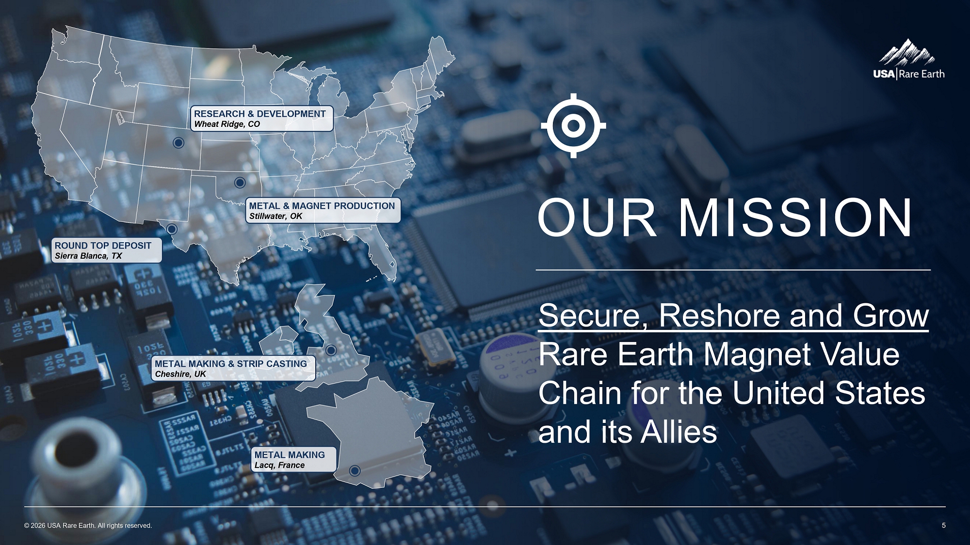 4 © 2026 USA Rare Earth. All rights reserved. HIGHLY EXPERIENCED LEADERSHIP TEAM Chief Financial Officer • Over 35 years of financial services industry experience in Investment Banking and Public Accounting, including at Bank of America Securities, J.P. Morgan and Thomas Weisel Partners having raised over $28 billion of capital • Joined USAR from Mujin Corp, where Rob was Global CFO overseeing capital raising and financial operations in four countries ROB STEELE Chief Executive Officer • Visionary executive with more than a decade of leadership at Siemens, including as CEO of Siemens USA, where she scaled the business to over $20 billion in revenues through a blend of organic growth and successful integration of major acquisitions • Recognized leader in critical infrastructure, technology, and national defense sectors, with a proven record of forging strategic partnerships, engaging with government stakeholders, and advancing transformative initiatives that strengthen supply chain resilience and national security BARBARA HUMPTON © 2026 USA Rare Earth. All rights reserved. Chairman of the Board • Michael Blitzer is Chairman of USA Rare Earth, Inc., bringing extensive experience in investment management, capital markets, and public company governance • Serves as CIO and Managing Partner of Inflection Point Asset Management, a SPAC platform focused on strategically important assets, through which he has led five SPACs • He holds several public company board positions, including serving as a director of Intuitive Machines, Inc. (Nasdaq: LUNR) and Merlin Labs, upon closing of a pending business combination with Inflection Point Acquisition Corp. IV (Nasdaq: BACQ) MICHAEL BLITZER 4
