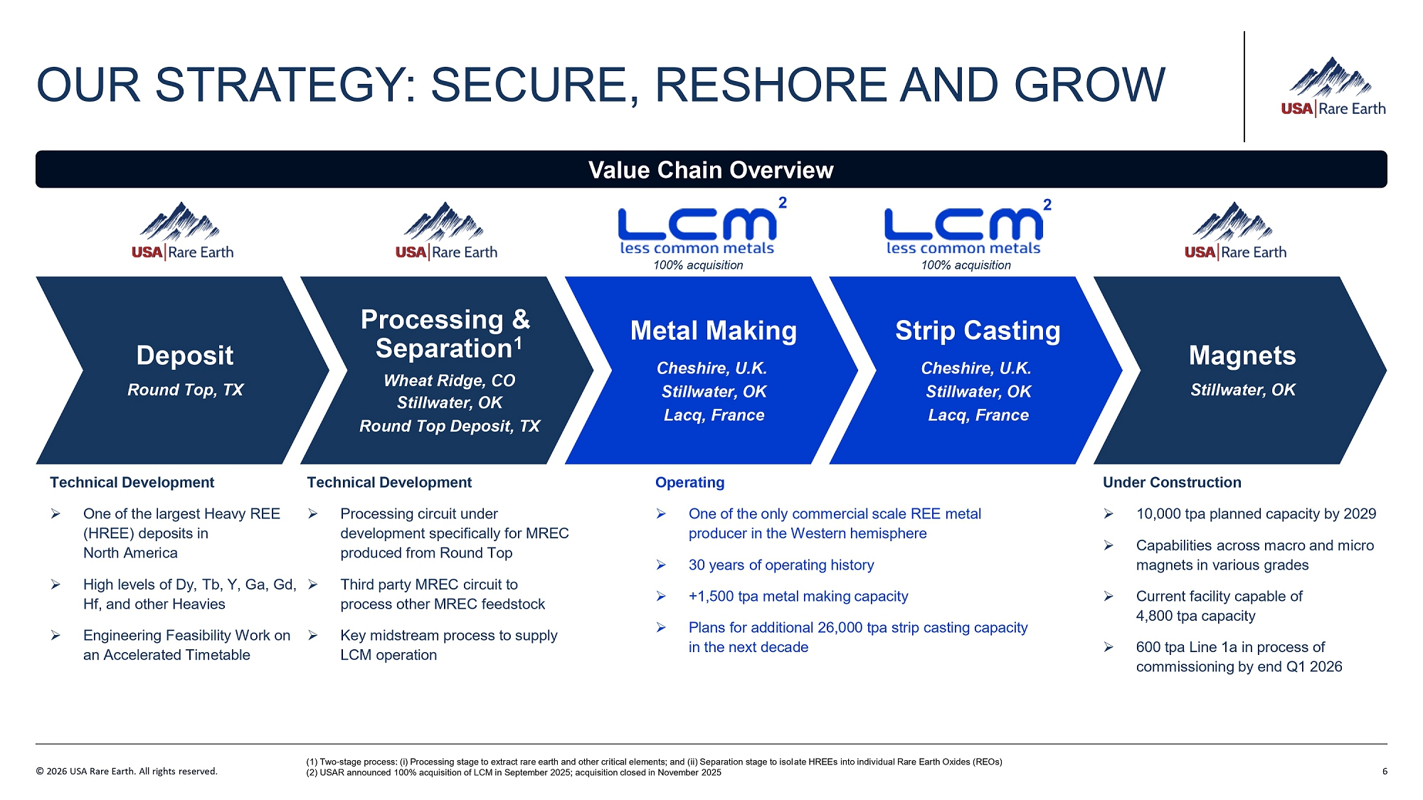 Secure, Reshore and Grow Rare Earth Magnet Value Chain for the United States and its Allies OUR MISSION 5 © 2026 USA Rare Earth. All rights reserved. ROUND TOP DEPOSIT Sierra Blanca, TX METAL & MAGNET PRODUCTION Stillwater, OK RESEARCH & DEVELOPMENT Wheat Ridge, CO METAL MAKING & STRIP CASTING Cheshire, UK METAL MAKING Lacq, France