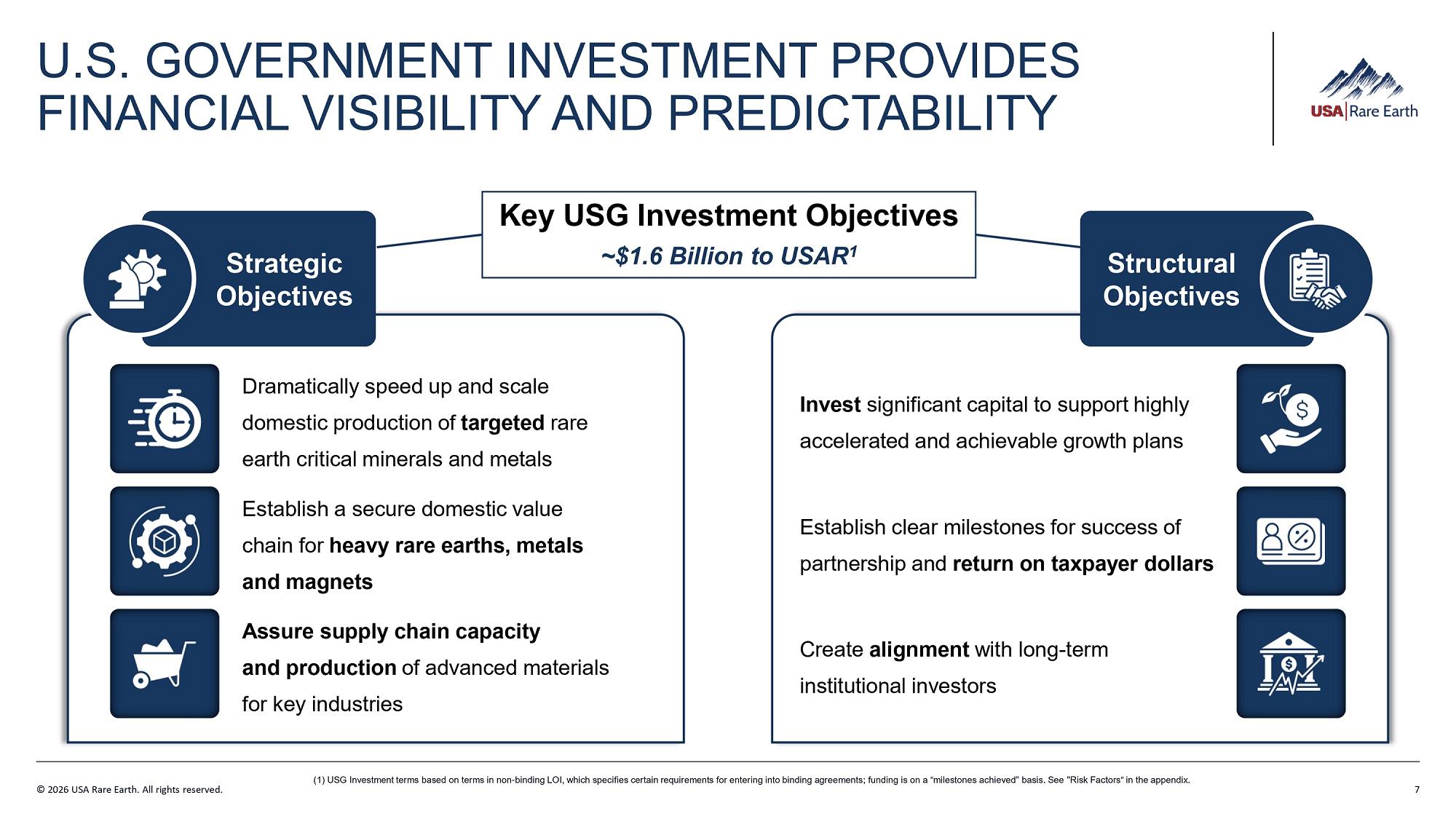 6 © 2026 USA Rare Earth. All rights reserved. OUR STRATEGY: SECURE, RESHORE AND GROW Technical Development » One of the largest Heavy REE (HREE) deposits in North America » High levels of Dy, Tb, Y, Ga, Gd, Hf, and other Heavies » Engineering Feasibility Work on an Accelerated Timetable Under Construction » 10,000 tpa planned capacity by 2029 » Capabilities across macro and micro magnets in various grades » Current facility capable of 4,800 tpa capacity » 600 tpa Line 1a in process of commissioning by end Q1 2026 Operating » One of the only commercial scale REE metal producer in the Western hemisphere » 30 years of operating history » +1,500 tpa metal making capacity » Plans for additional 26,000 tpa strip casting capacity in the next decade Value Chain Overview Deposit Round Top, TX Processing & Separation 1 Wheat Ridge, CO Stillwater, OK Round Top Deposit, TX Metal Making Cheshire, U.K. Stillwater, OK Lacq, France Strip Casting Cheshire, U.K. Stillwater, OK Lacq, France Magnets Stillwater, OK (1) Two - stage process: (i) Processing stage to extract rare earth and other critical elements; and (ii) Separation stage to isol ate HREEs into individual Rare Earth Oxides (REOs) (2) USAR announced 100% acquisition of LCM in September 2025; acquisition closed in November 2025 Technical Development » Processing circuit under development specifically for MREC produced from Round Top » Third party MREC circuit to process other MREC feedstock » Key midstream process to supply LCM operation 2 2 100% acquisition 100% acquisition