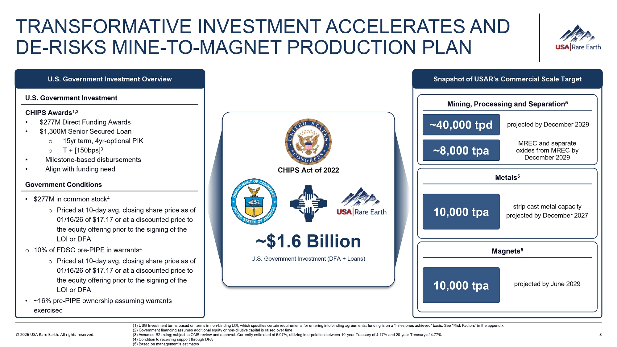 7 © 2026 USA Rare Earth. All rights reserved. U.S. GOVERNMENT INVESTMENT PROVIDES FINANCIAL VISIBILITY AND PREDICTABILITY (1) USG Investment terms based on terms in non - binding LOI, which specifies certain requirements for entering into binding agree ments; funding is on a “milestones achieved” basis. See "Risk Factors“ in the appendix. Strategic Objectives Key USG Investment Objectives Structural Objectives Establish a secure domestic value chain for heavy rare earths, metals and magnets Dramatically speed up and scale domestic production of targeted rare earth critical minerals and metals Assure supply chain capacity and production of advanced materials for key industries Establish clear milestones for success of partnership and return on taxpayer dollars Invest significant capital to support highly accelerated and achievable growth plans Create alignment with long - term institutional investors ~$1.6 Billion to USAR 1