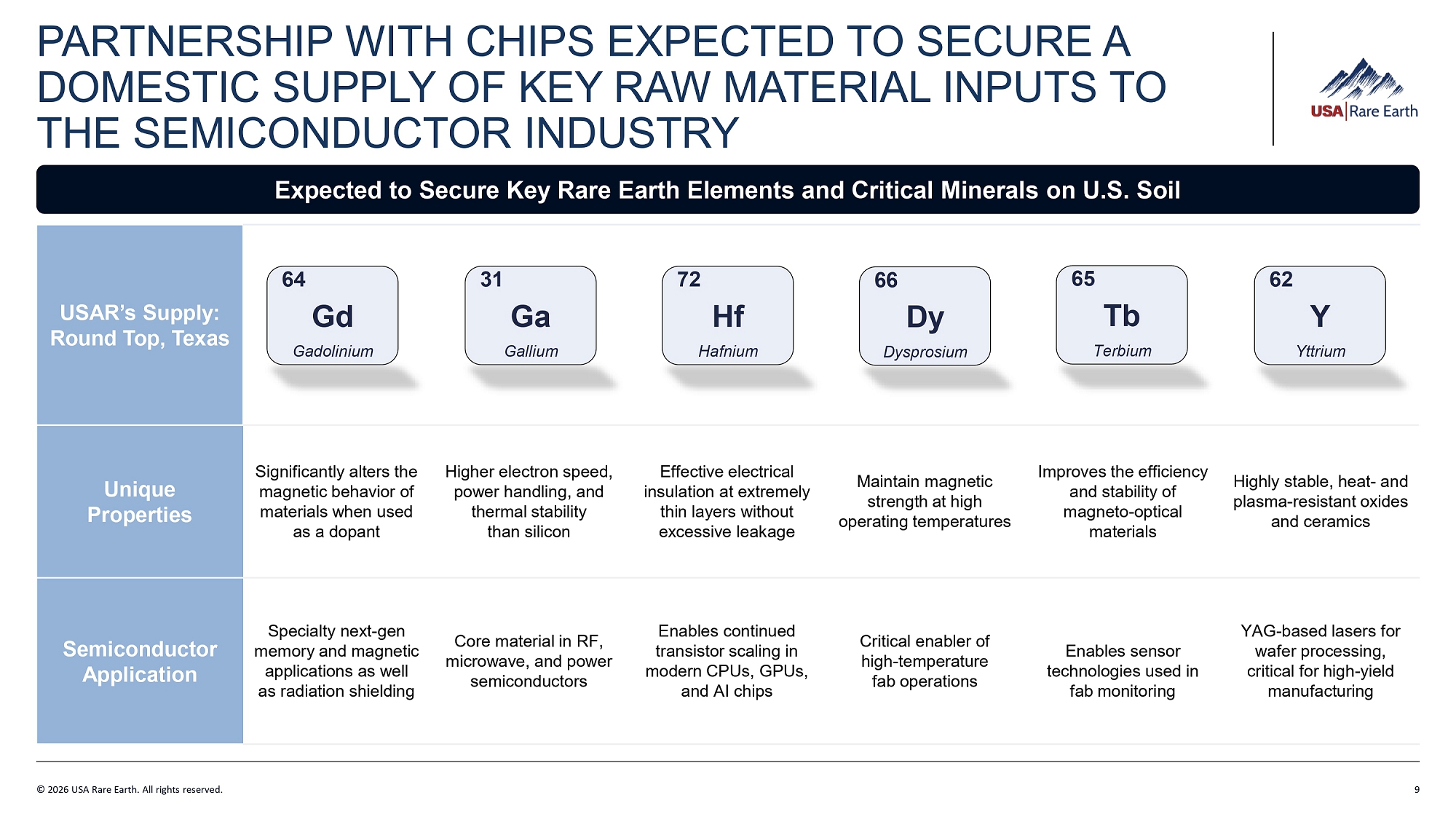 9 © 2026 USA Rare Earth. All rights reserved. USAR’s Supply: Round Top, Texas Highly stable, heat - and plasma - resistant oxides and ceramics Improves the efficiency and stability of magneto - optical materials Maintain magnetic strength at high operating temperatures Effective electrical insulation at extremely thin layers without excessive leakage Higher electron speed, power handling, and thermal stability than silicon Significantly alters the magnetic behavior of materials when used as a dopant Unique Properties YAG - based lasers for wafer processing, critical for high - yield manufacturing Enables sensor technologies used in fab monitoring Critical enabler of high - temperature fab operations Enables continued transistor scaling in modern CPUs, GPUs, and AI chips Core material in RF, microwave, and power semiconductors Specialty next - gen memory and magnetic applications as well as radiation shielding Semiconductor Application PARTNERSHIP WITH CHIPS EXPECTED TO SECURE A DOMESTIC SUPPLY OF KEY RAW MATERIAL INPUTS TO THE SEMICONDUCTOR INDUSTRY Expected to Secure Key Rare Earth Elements and Critical Minerals on U.S. Soil Gd Gadolinium 64 Ga Gallium 31 Hf Hafnium 72 Dy Dysprosium 66 Tb Terbium 65 Y Yttrium 62