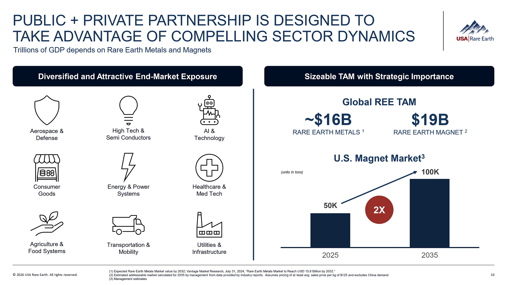 10 © 2026 USA Rare Earth. All rights reserved. (1) Expected Rare Earth Metals Market value by 2032; Vantage Market Research, July 31, 2024, “Rare Earth Metals Market to Reach U SD 15.8 Billion by 2032.” (2) Estimated addressable market calculated for 2035 by management from data provided by industry reports. Assumes pricing of at l east avg. sales price per kg of $125 and excludes China demand (3) Management estimates PUBLIC + PRIVATE PARTNERSHIP IS DESIGNED TO TAKE ADVANTAGE OF COMPELLING SECTOR DYNAMICS Diversified and Attractive End - Market Exposure Trillions of GDP depends on Rare Earth Metals and Magnets $19B RARE EARTH MAGNET 2 ~$16B RARE EARTH METALS 1 Transportation & Mobility Agriculture & Food Systems Utilities & Infrastructure High Tech & Semi Conductors Aerospace & Defense AI & Technology Energy & Power Systems Consumer Goods Healthcare & Med Tech Sizeable TAM with Strategic Importance 50K 100K 2025 2035 2X Global REE TAM U.S. Magnet Market 3 (units in tons)